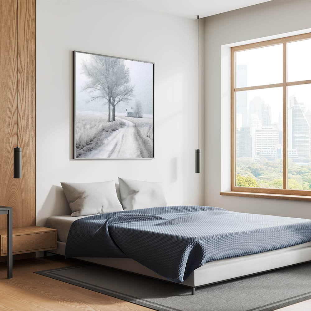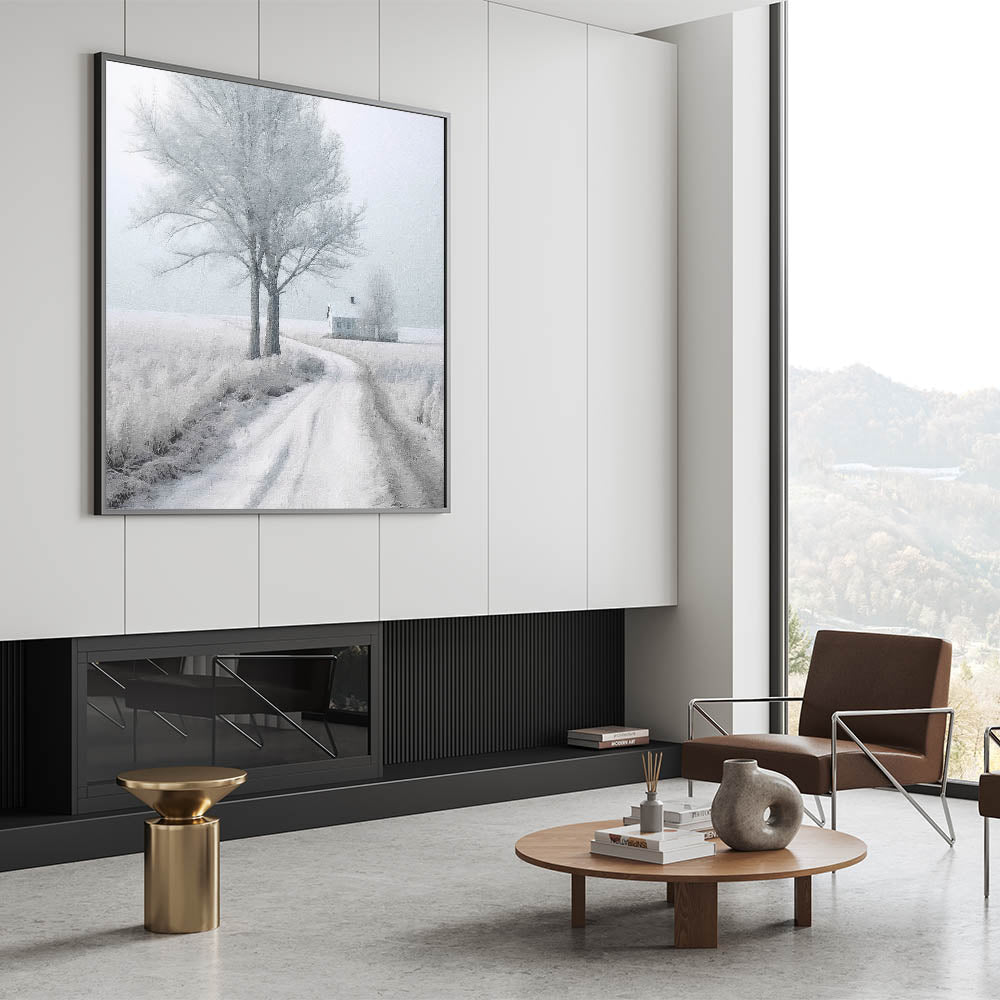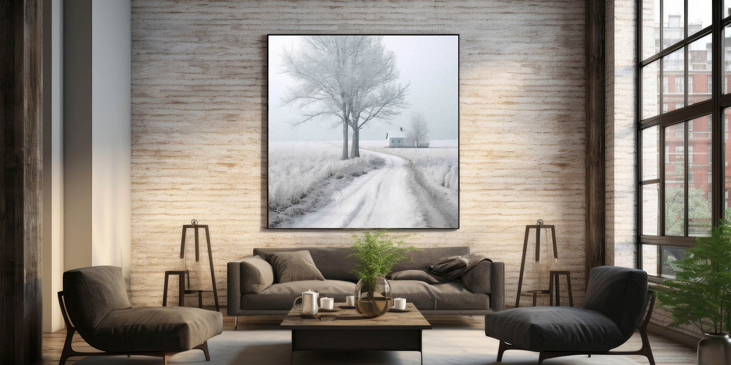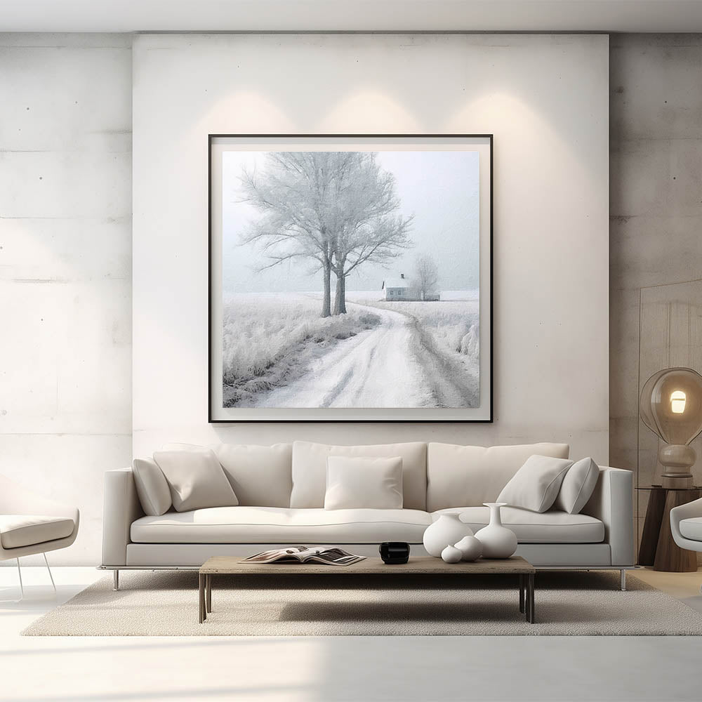 Experience the tranquil beauty of winter with the Serene Winter Path wall art. This stunning artwork captures a snow-covered path leading towards a distant, cozy cottage, surrounded by tall, bare trees against a serene, pale sky. The muted tones of light gray and pale blue add a calming, frosty touch, making it a perfect piece for winter decor. The artwork evokes the stillness of a snowy morning, bringing the quiet beauty of winter into your home.