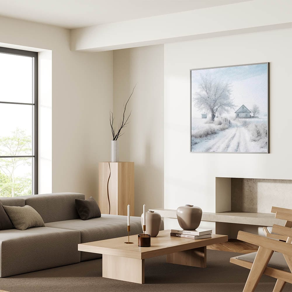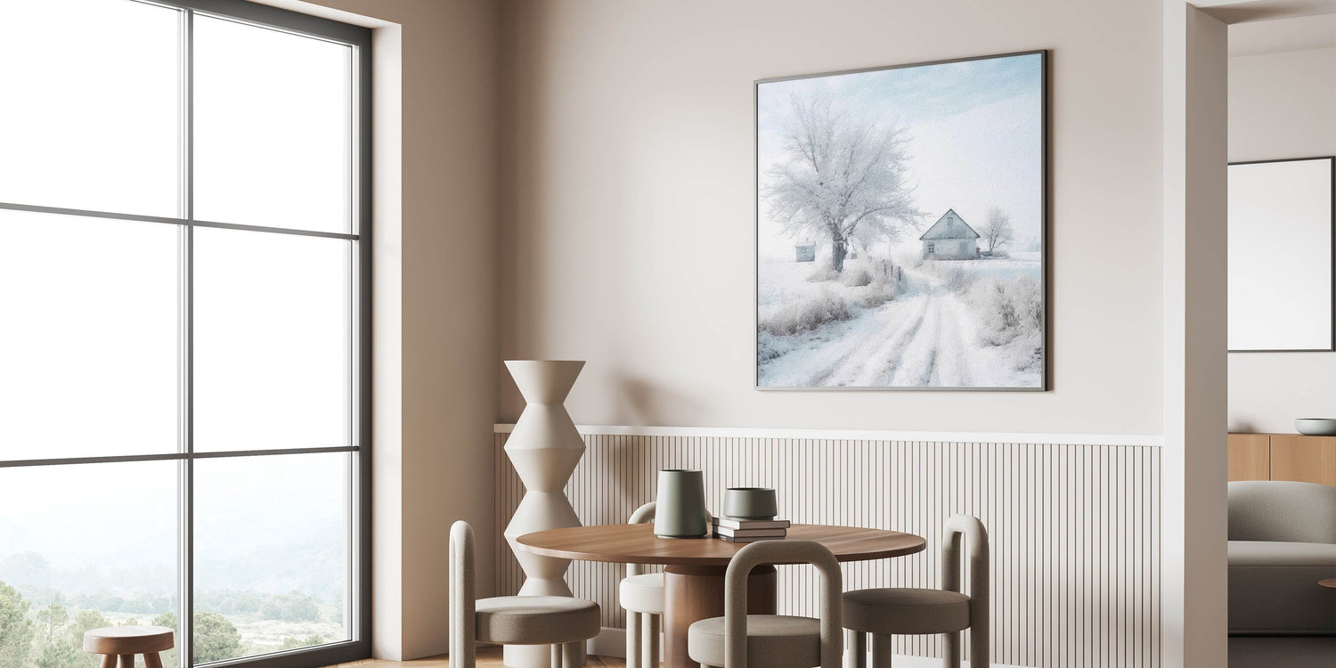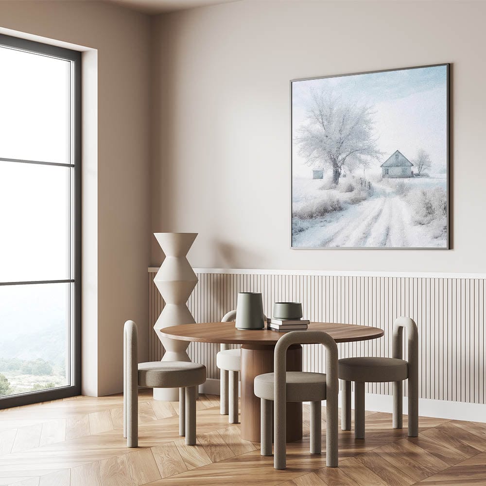 Celebrate the beauty of winter with this serene and charming piece, capturing the essence of snow-covered cottages and frosty mornings.