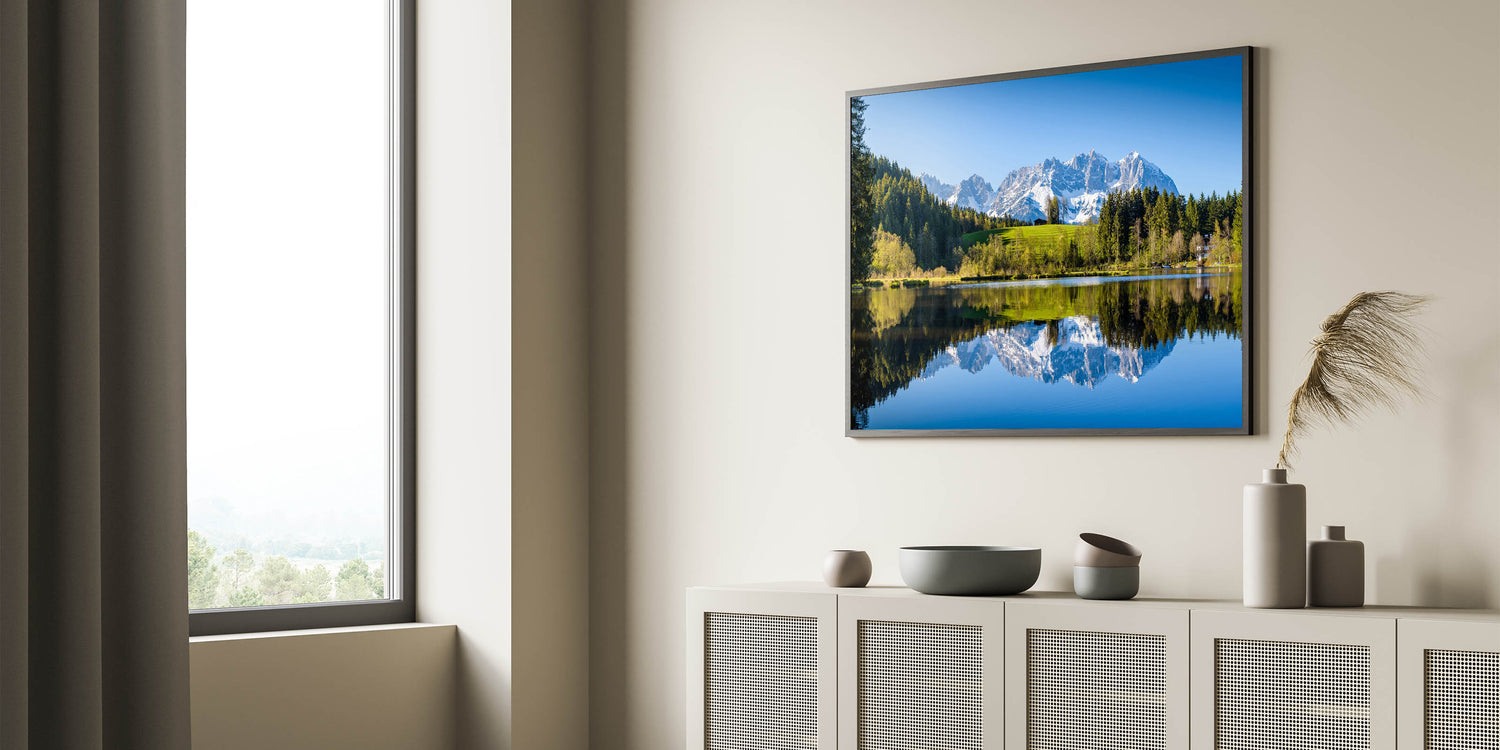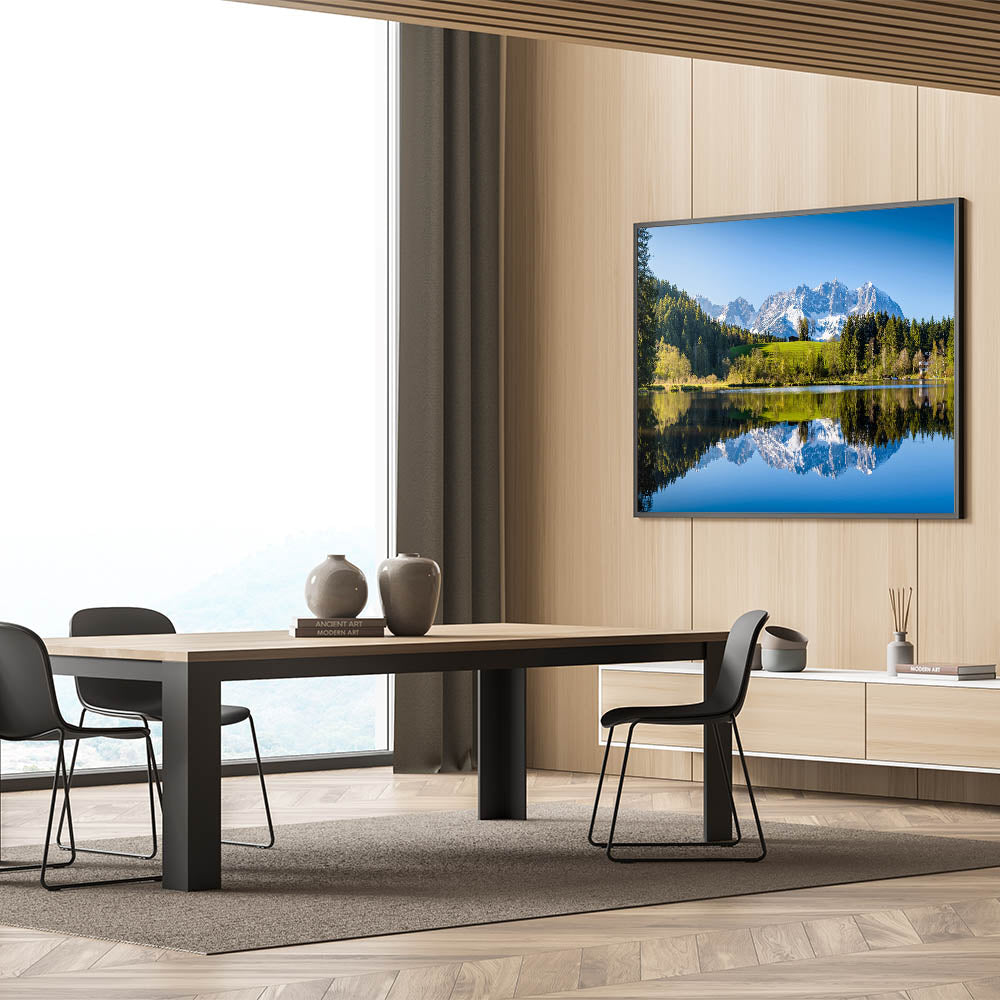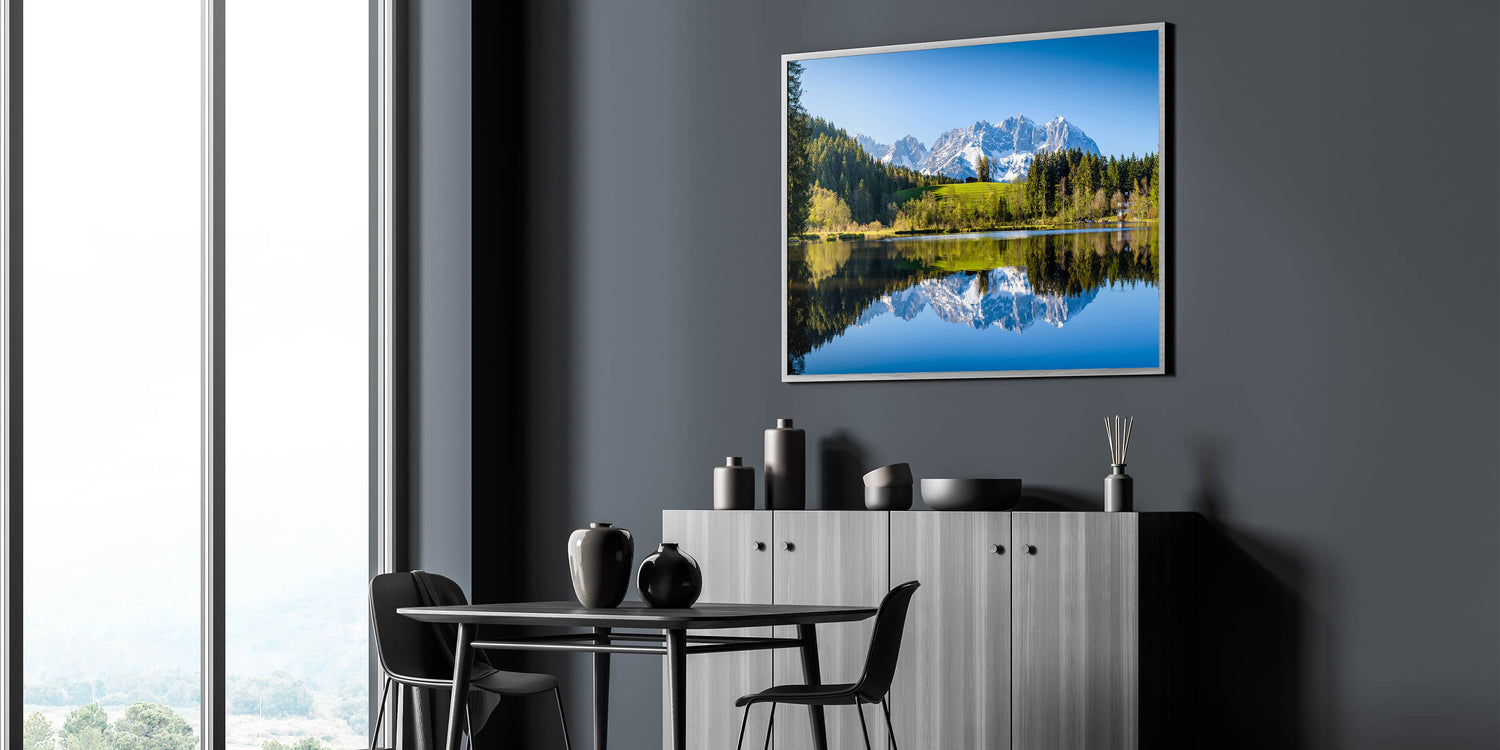 This beautiful wall art captures the serene beauty of Austria’s alpine landscape, featuring a peaceful lake reflecting the towering snow-capped mountains in the background. The lush greenery of the surrounding trees and the calm water create a tranquil scene, perfect for nature lovers and those who appreciate Austrian landscape art. This piece is available in various formats, including Stretched Canvas, Framed Canvas, and Acrylic Glass, making it a versatile addition to any home or office space.