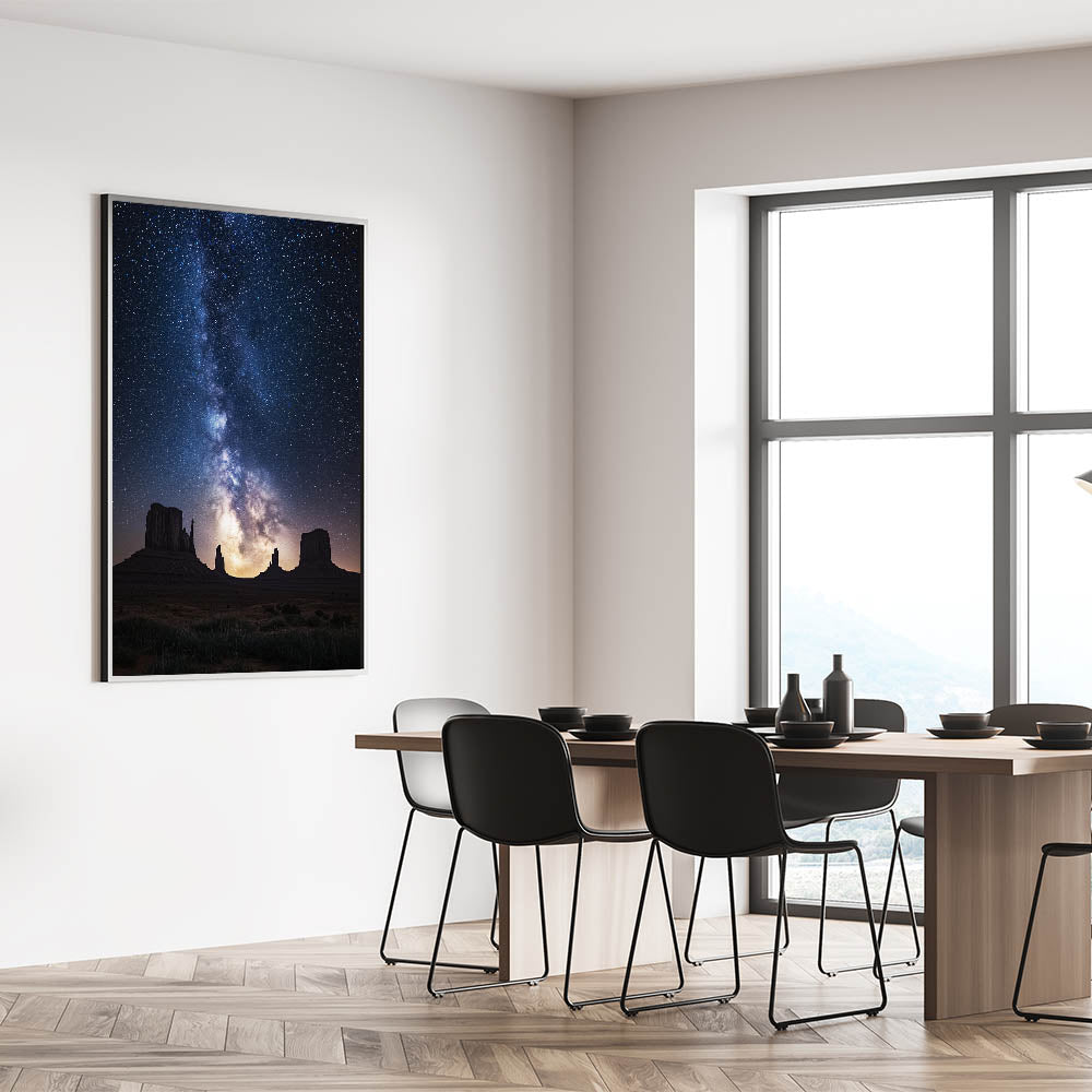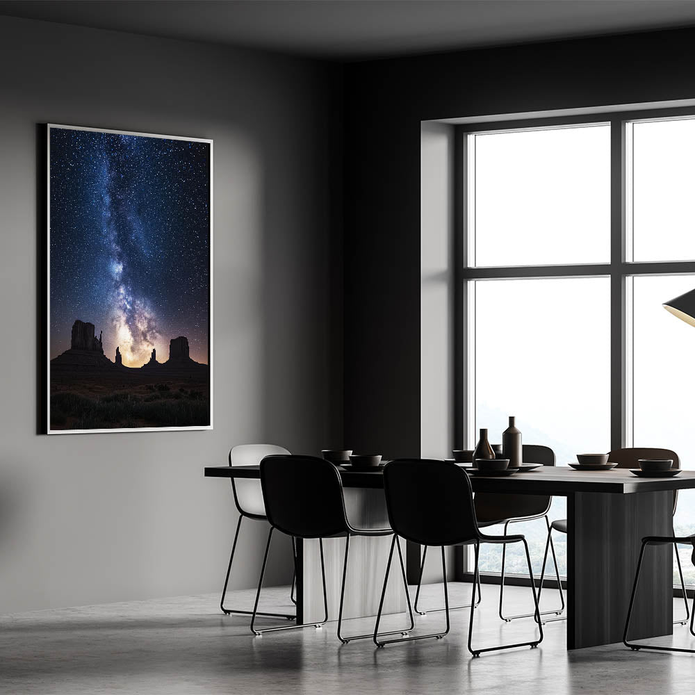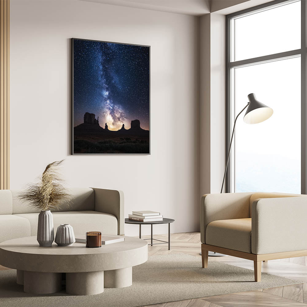Step into the serene beauty of a desert night with this captivating Arizona desert landscape photography. Showcasing the majestic Milky Way above iconic rock formations, this piece embodies the magic of the cosmos and the rugged charm of the desert. Perfect for creating a peaceful, awe-inspiring atmosphere, it’s a timeless addition to any space.