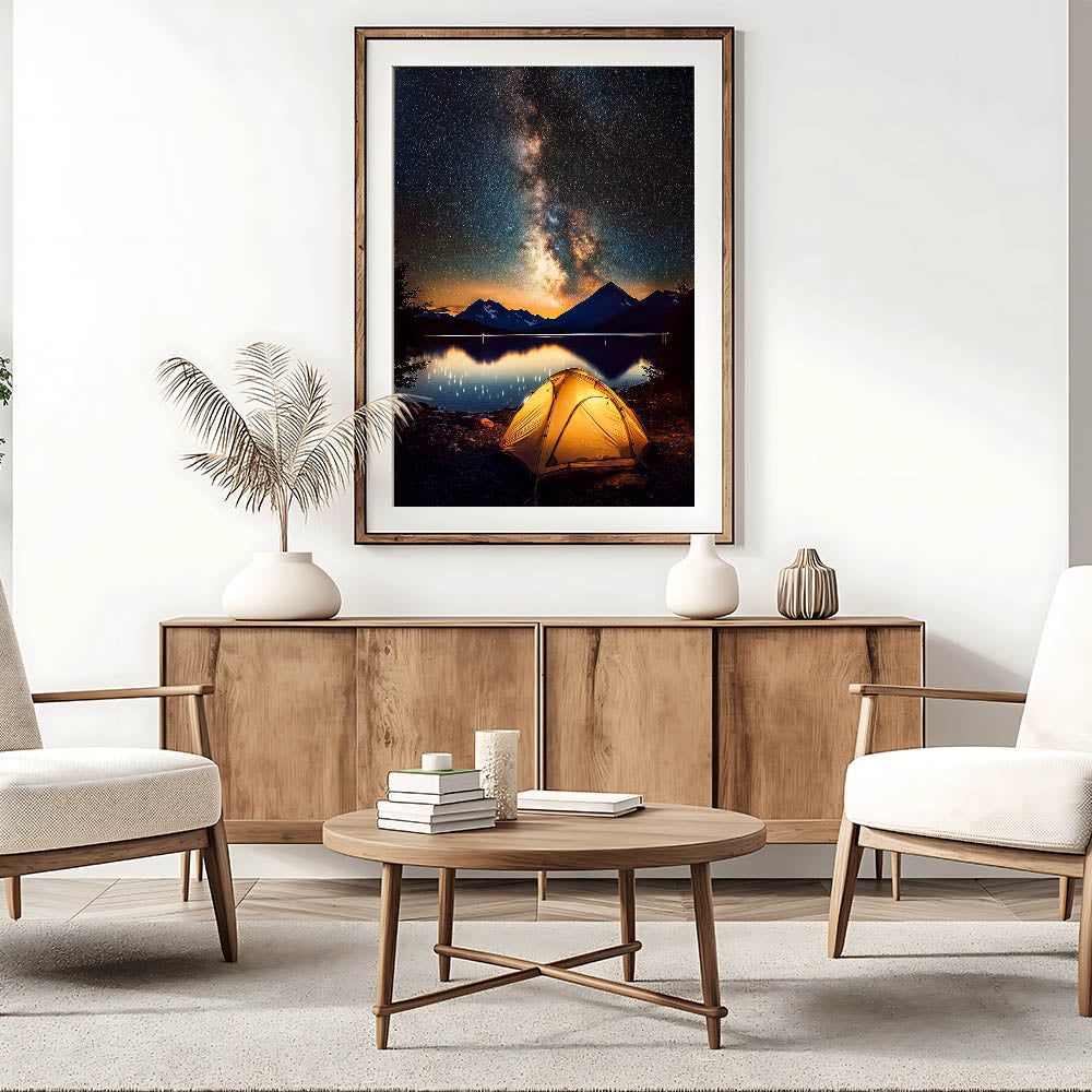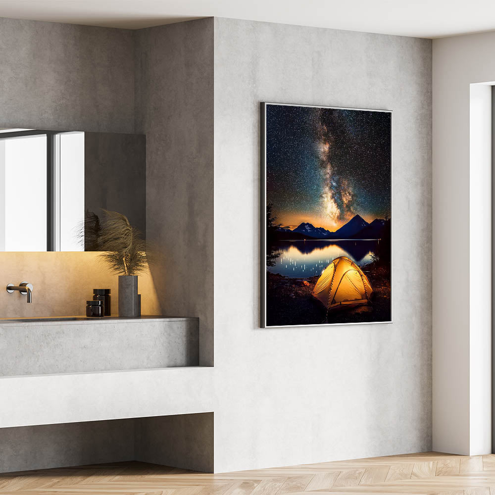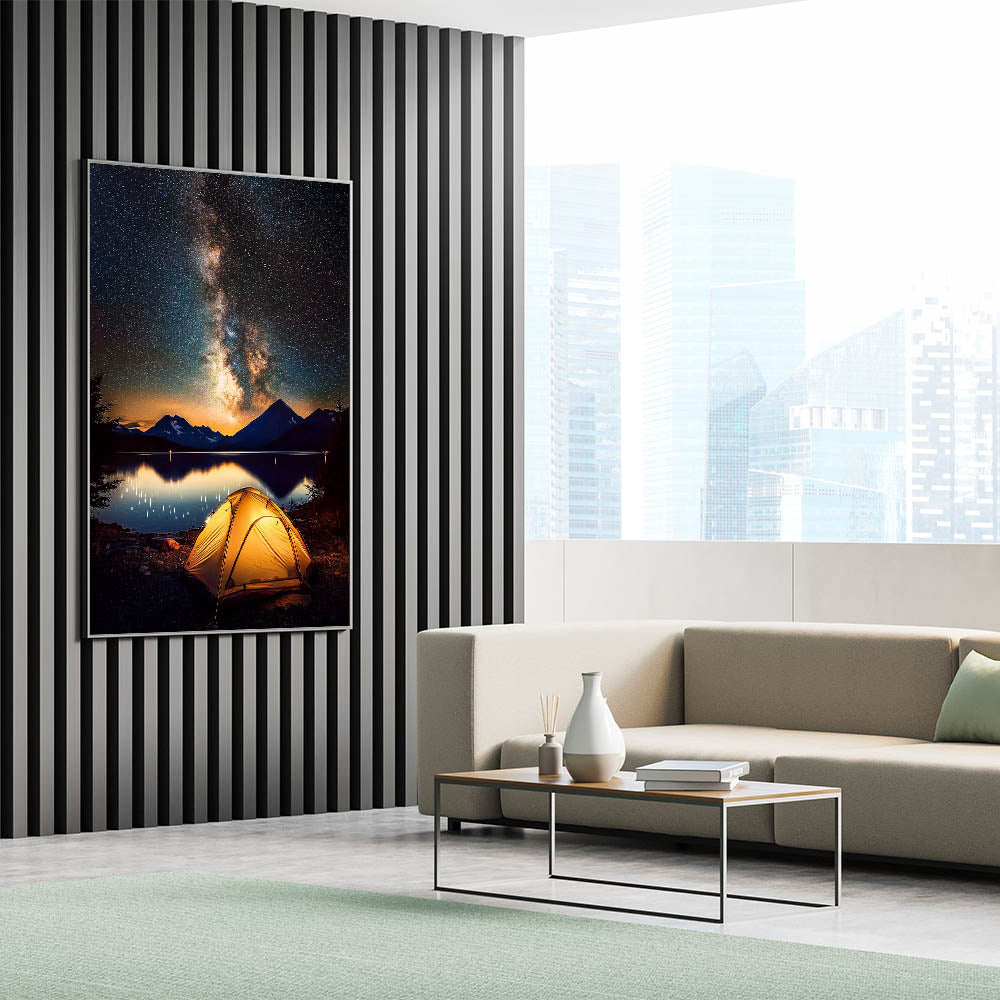 Immerse yourself in the beauty of the night sky with this breathtaking camping-themed landscape wall art. Featuring a glowing tent under the Milky Way, framed by serene mountains and a calm lake, this artwork captures the essence of adventure and tranquility. The vivid nightscape makes it an ideal addition to any living room, bedroom, or workspace.