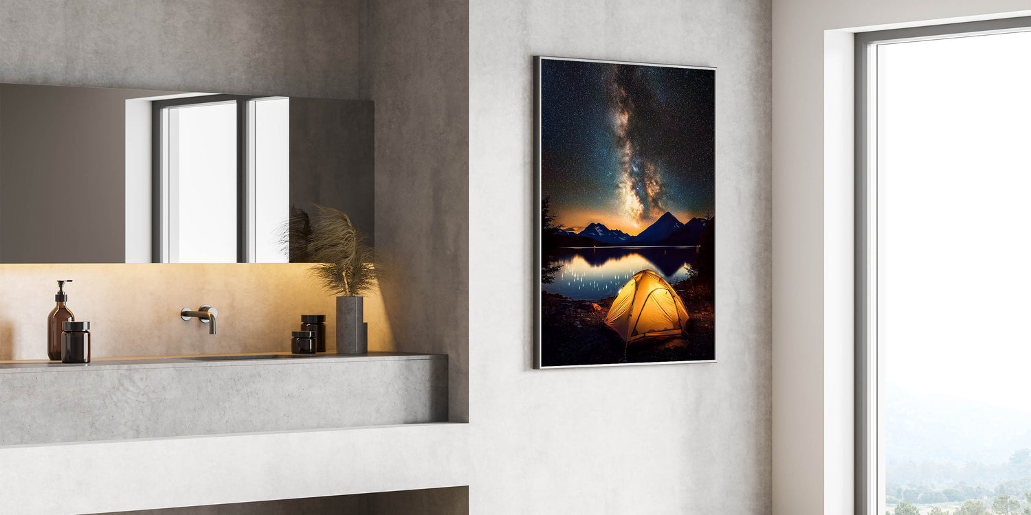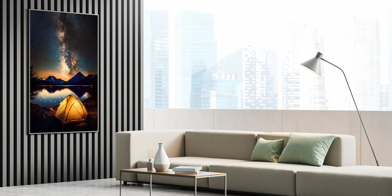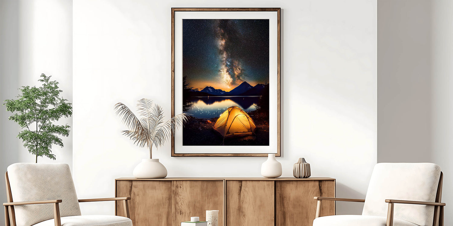 Immerse yourself in the beauty of the night sky with this breathtaking camping-themed landscape wall art. Featuring a glowing tent under the Milky Way, framed by serene mountains and a calm lake, this artwork captures the essence of adventure and tranquility. The vivid nightscape makes it an ideal addition to any living room, bedroom, or workspace.
