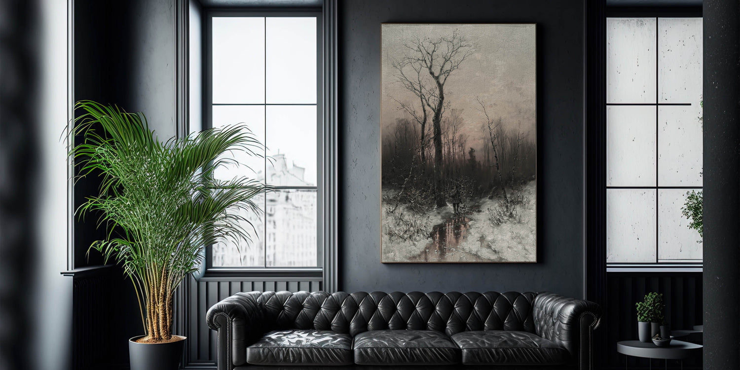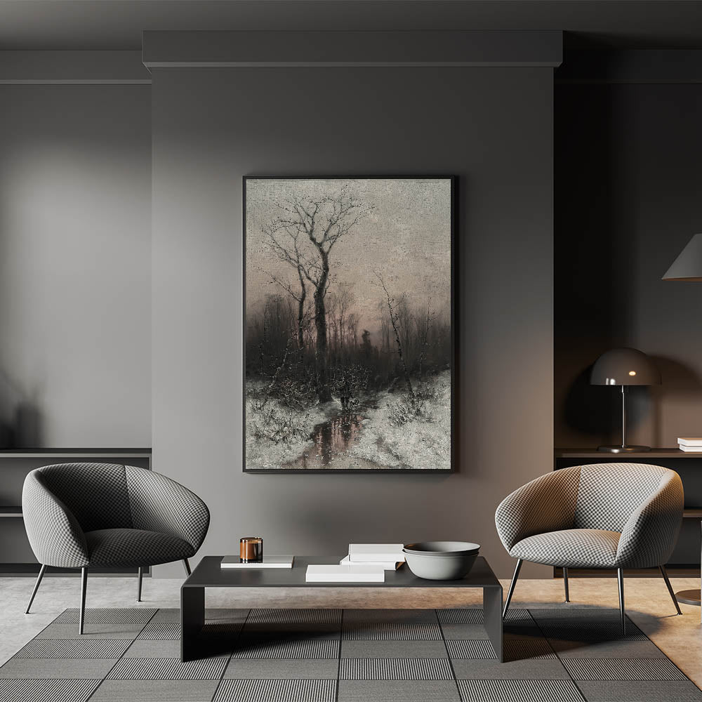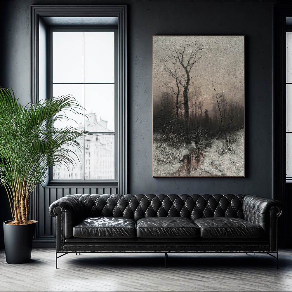 Add a dramatic touch to your home with this timeless winter scene, ideal for enhancing the ambiance of living rooms, studies, or reading nooks.