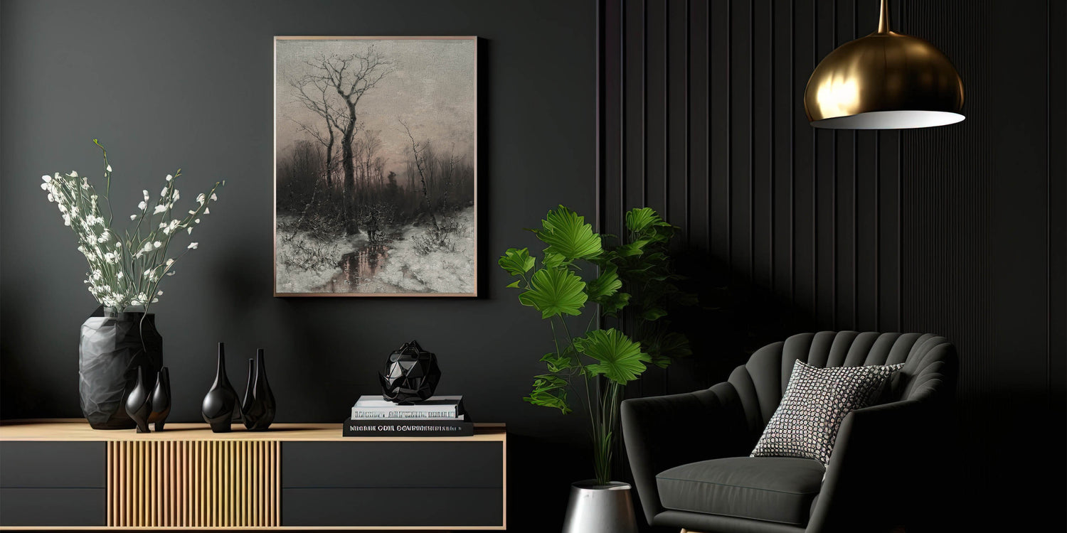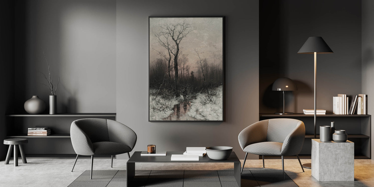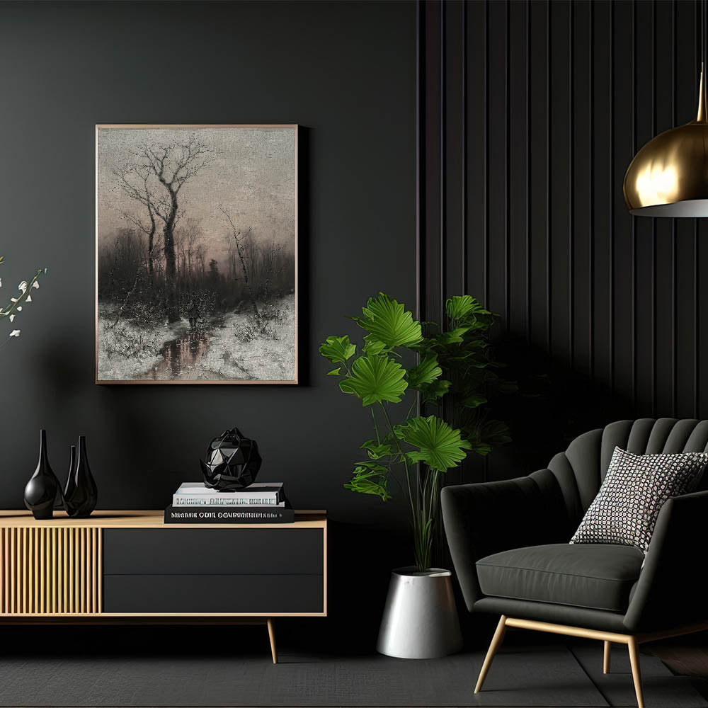 Add a dramatic touch to your home with this timeless winter scene, ideal for enhancing the ambiance of living rooms, studies, or reading nooks.