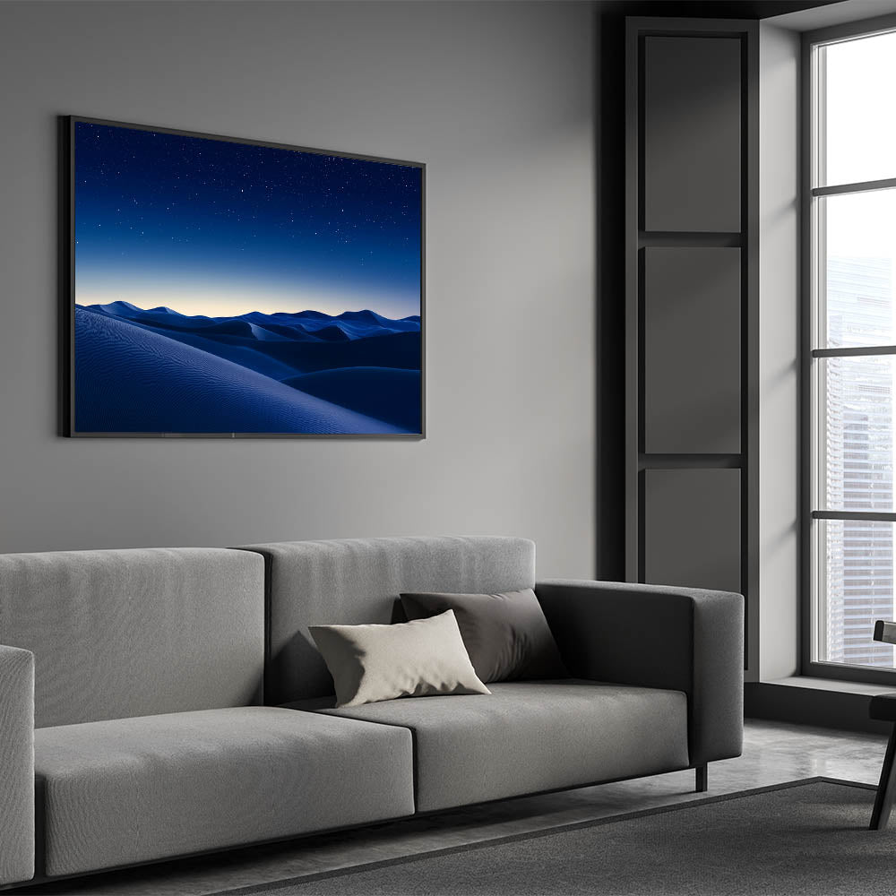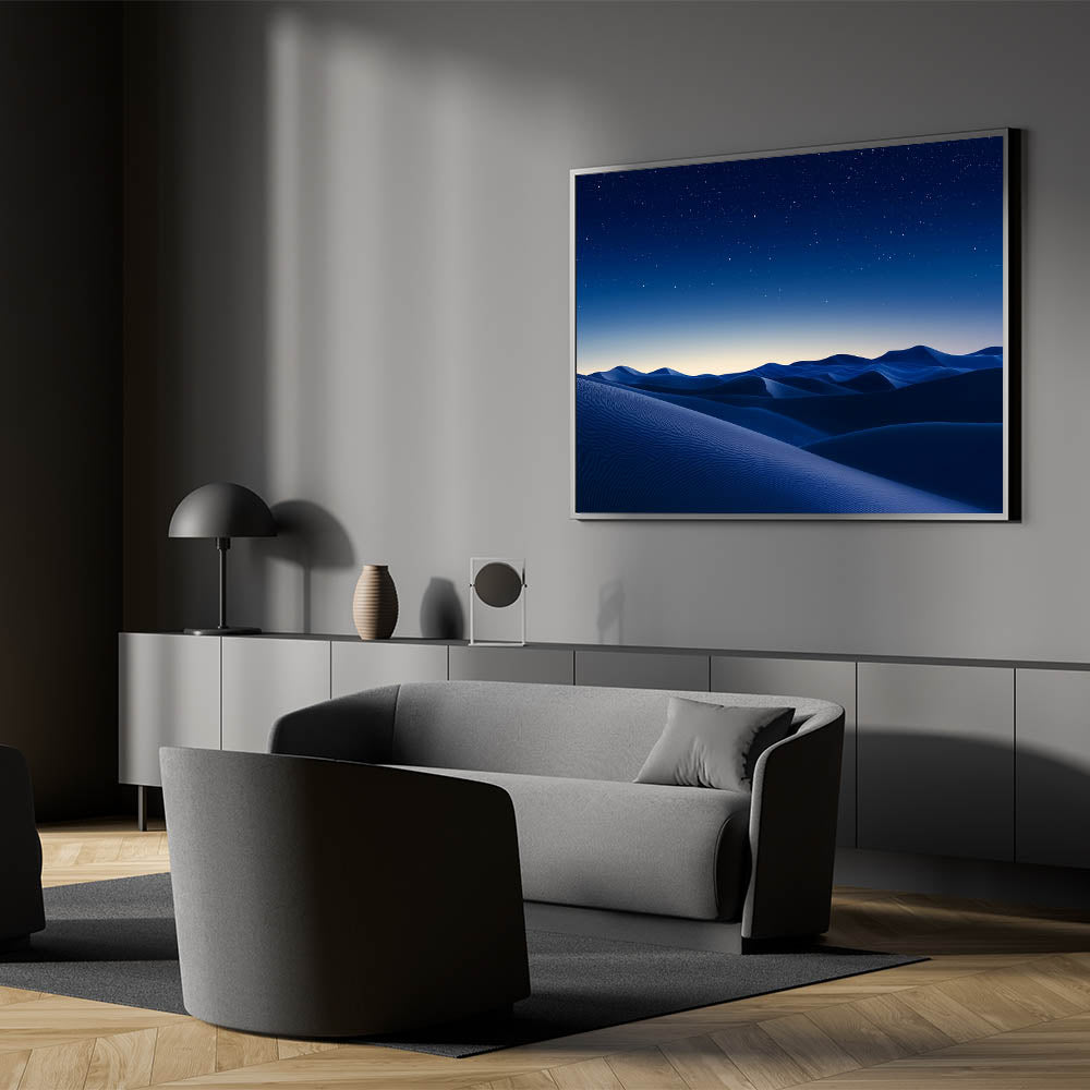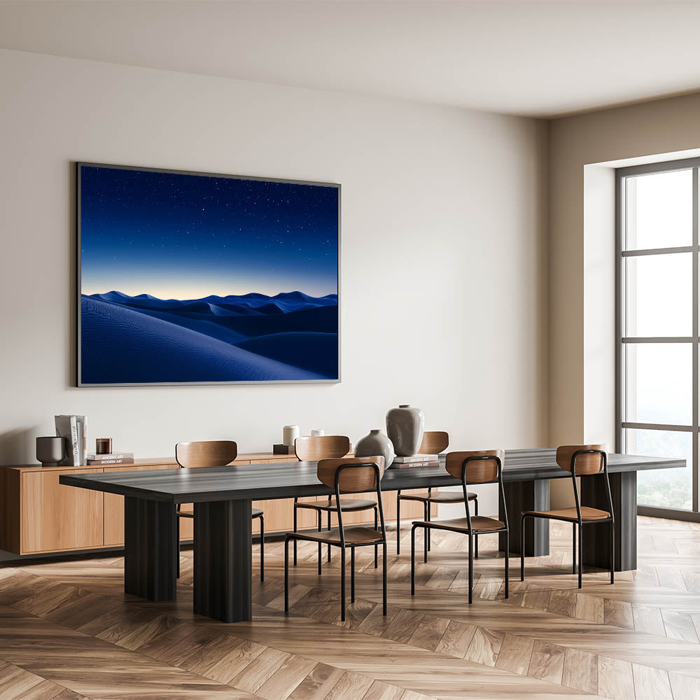 Step into the serene beauty of this starlit desert artwork, featuring gently rolling sand dunes illuminated by the soft glow of a midnight blue sky. The tranquil setting captures the essence of the desert under a blanket of stars, offering a breathtaking view that inspires calm and wonder.