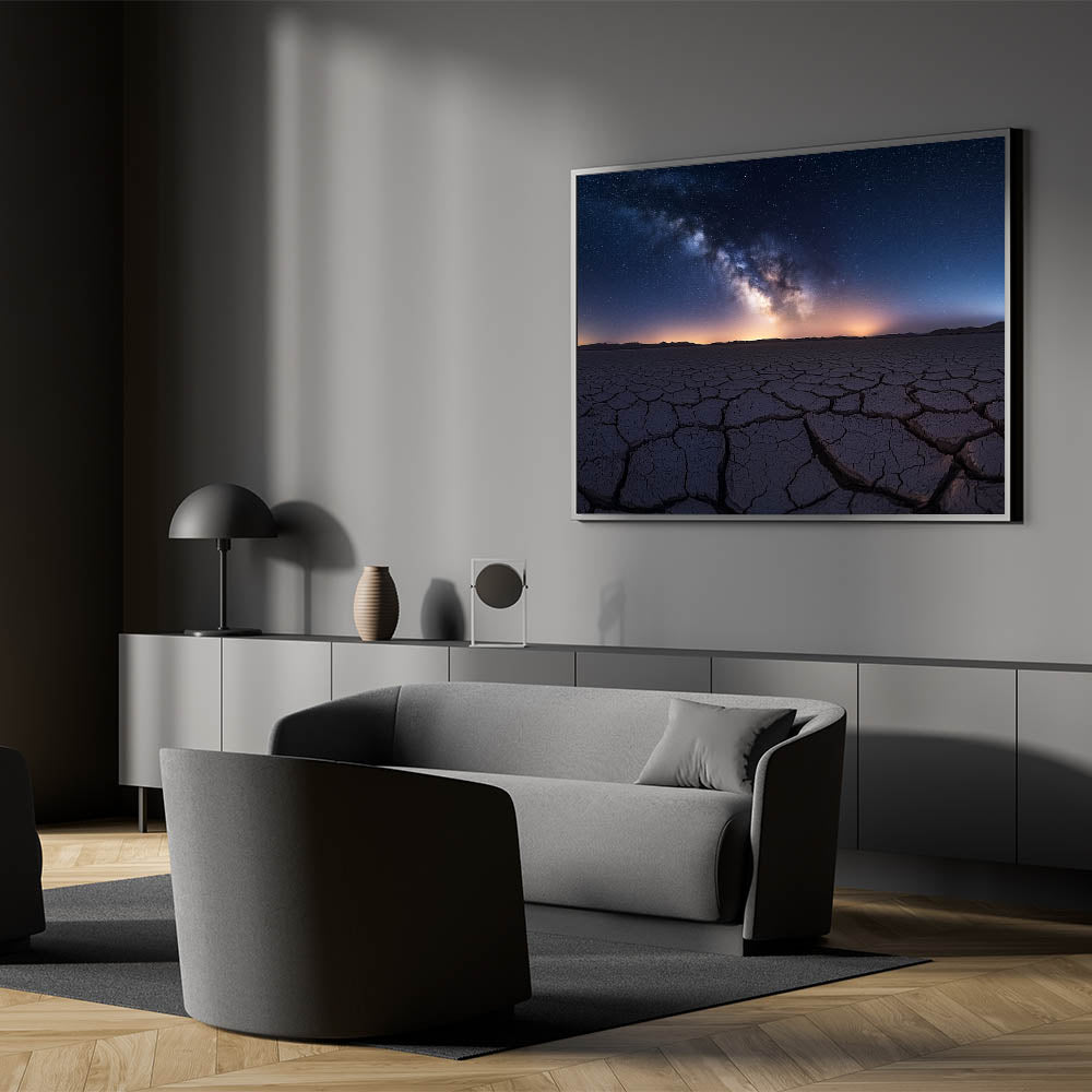 Immerse yourself in the mystique of the desert with this stunning canvas print, featuring a star-studded night sky stretching over a cracked desert floor. The interplay of deep blue hues and the glow of the Milky Way creates a breathtaking visual, perfect for adding depth and serenity to your space.