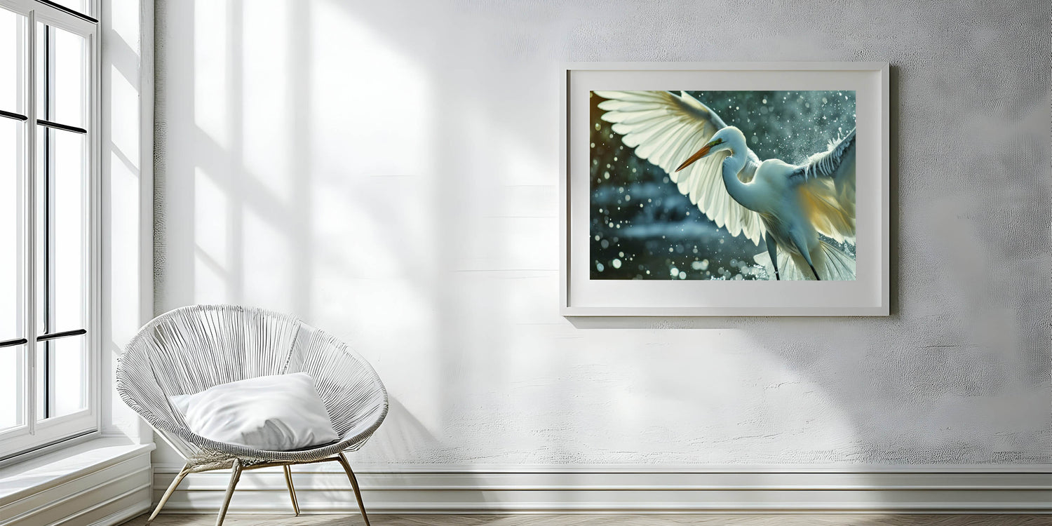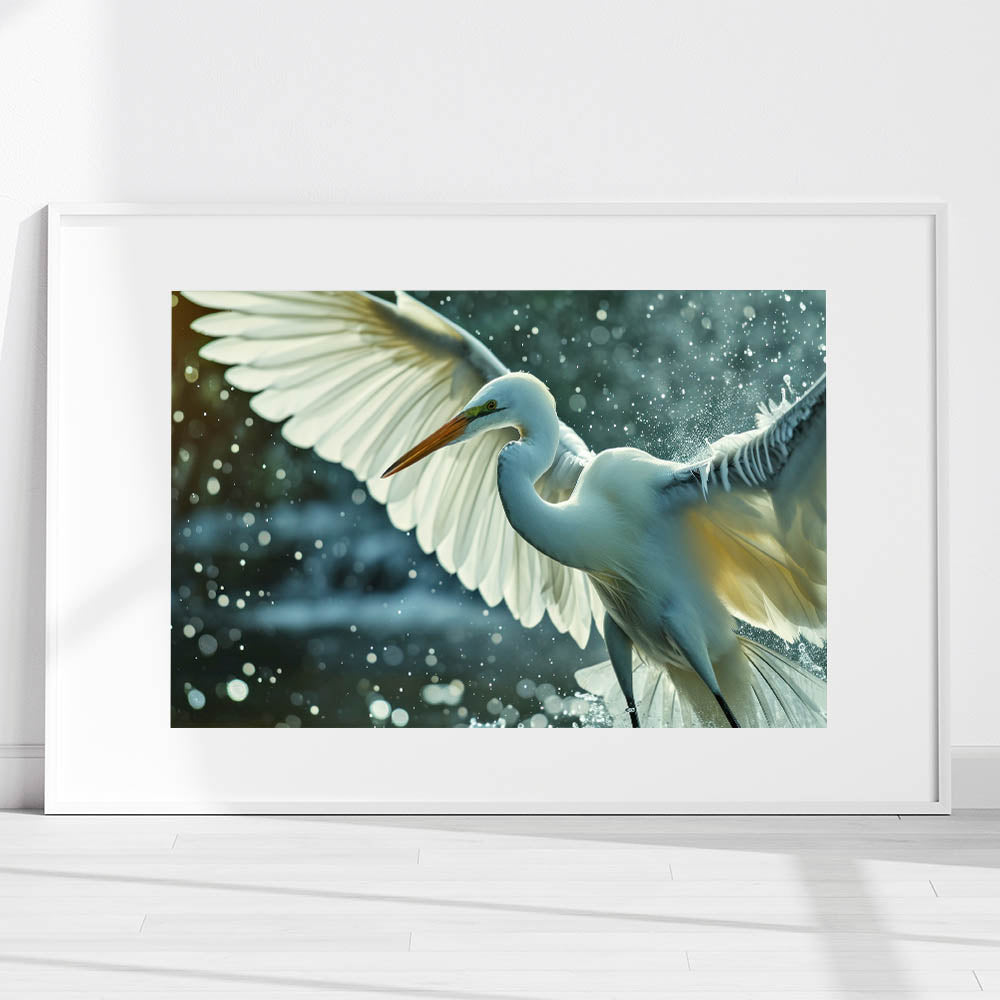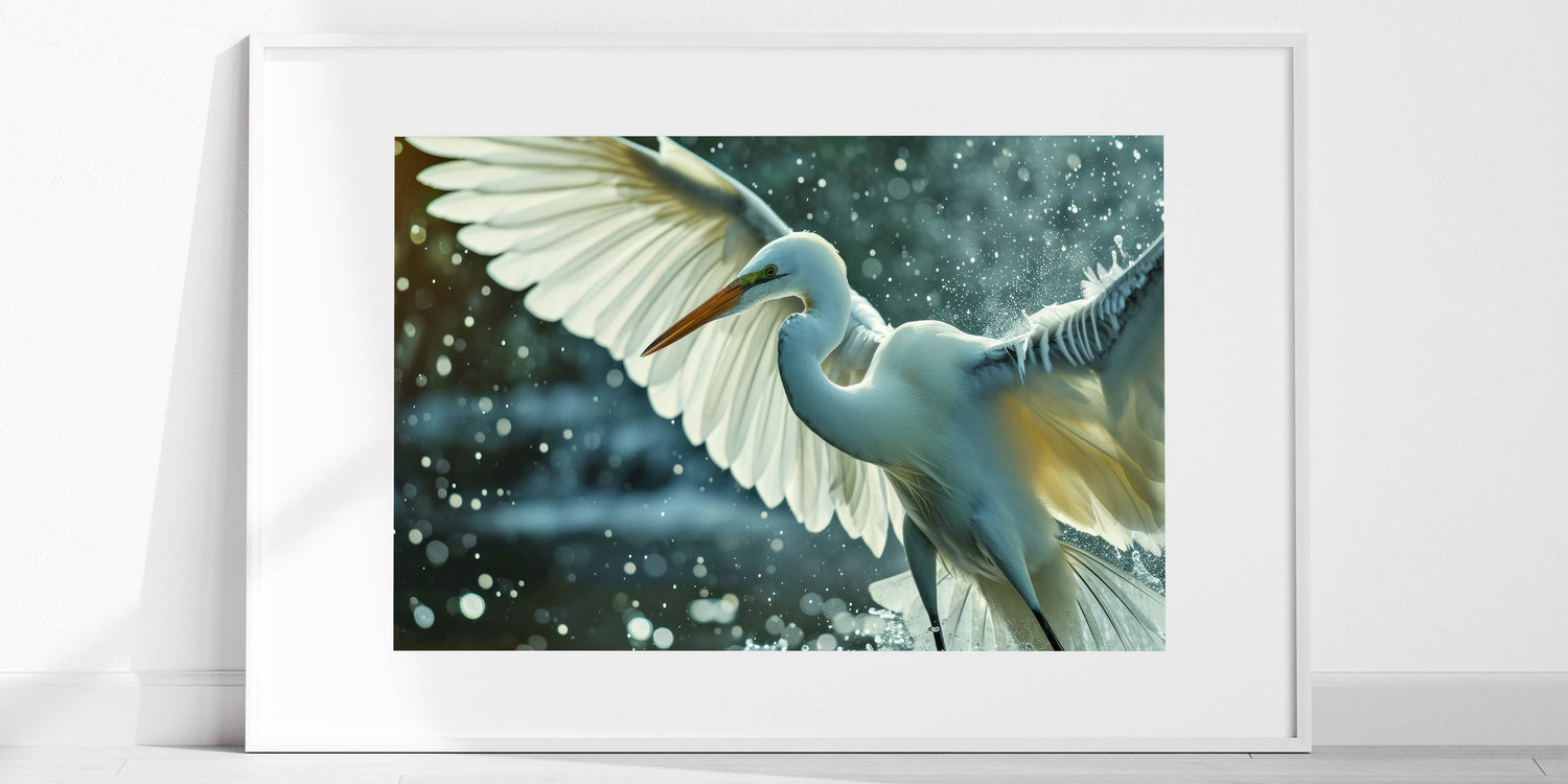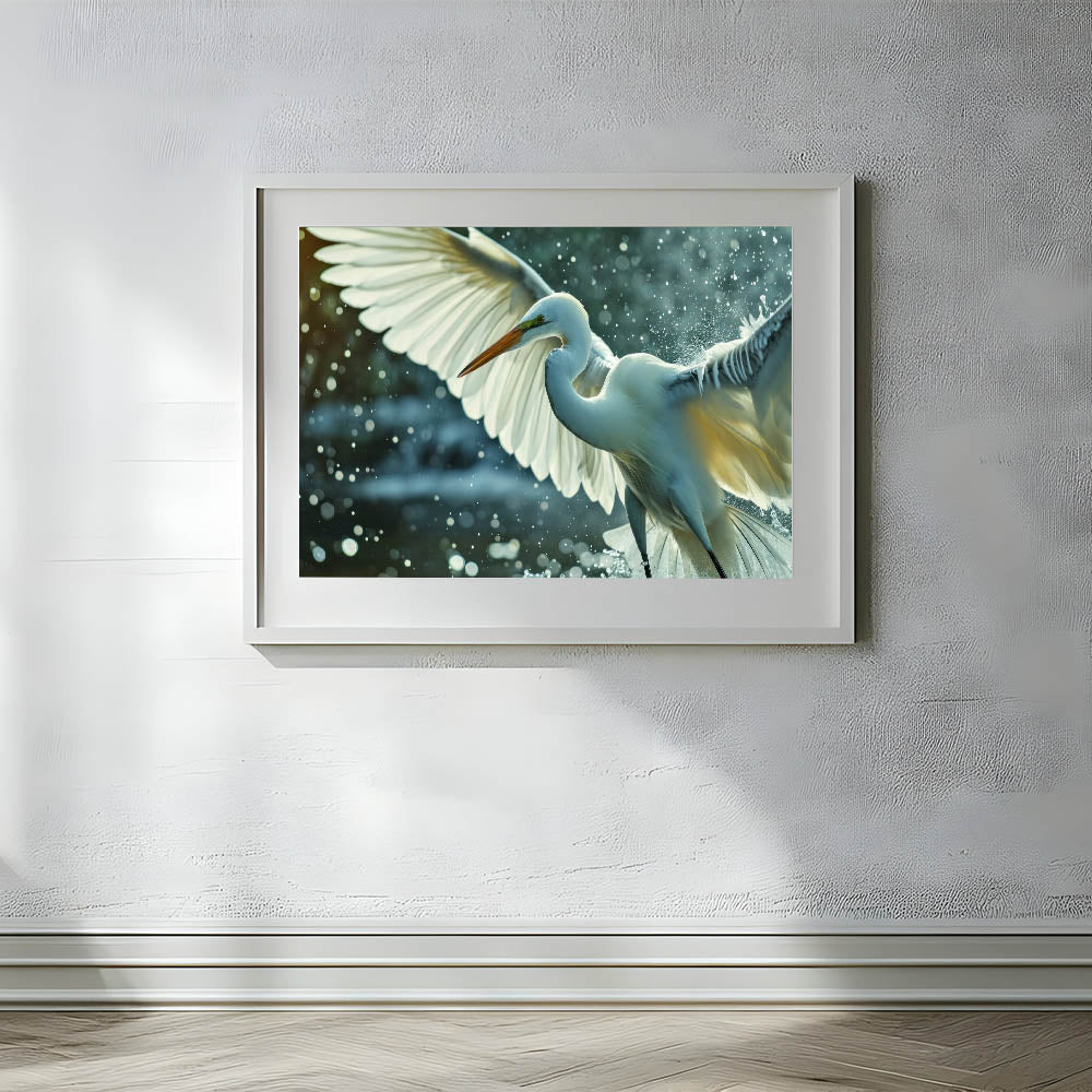 - Vivid Color Contrast: The artwork features a striking combination of white, teal, and golden tones, capturing the egret’s graceful movement and the sparkling water droplets.