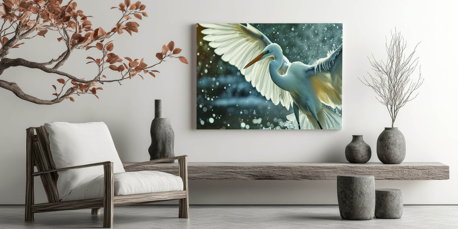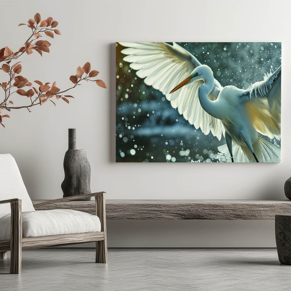 Bring the energy of nature into your home with this Dynamic Egret in Flight with Water Splash Canvas Art. This stunning artwork captures the moment of an egret taking flight, wings spread wide, with water droplets cascading around it. The dramatic lighting and movement in this piece create a sense of vitality and freedom, making it a perfect addition to any space that could use a burst of natural beauty.