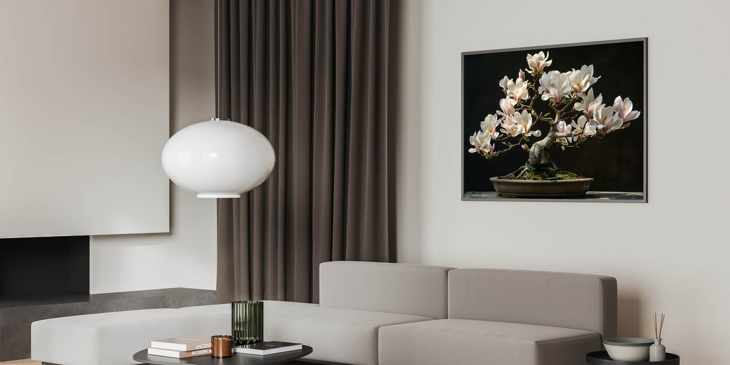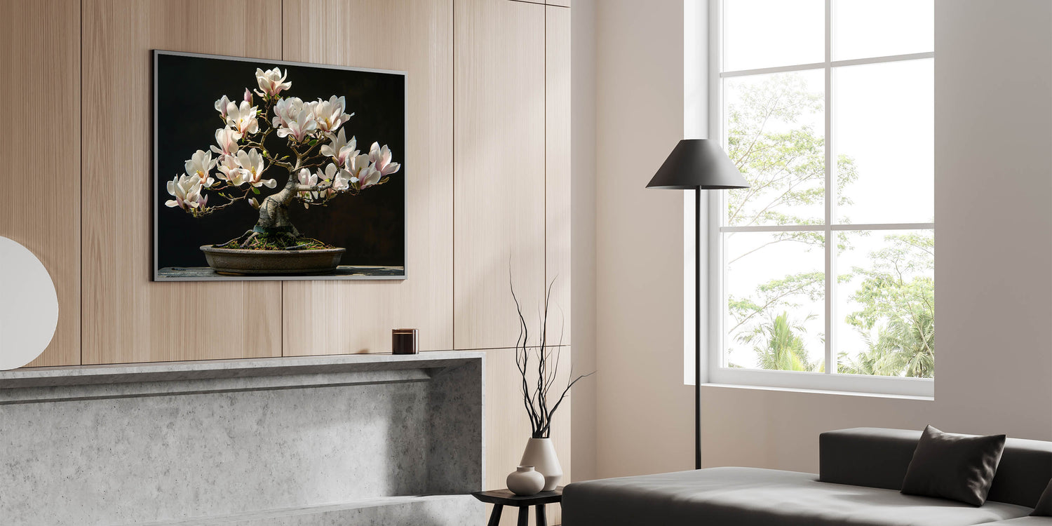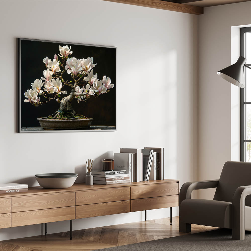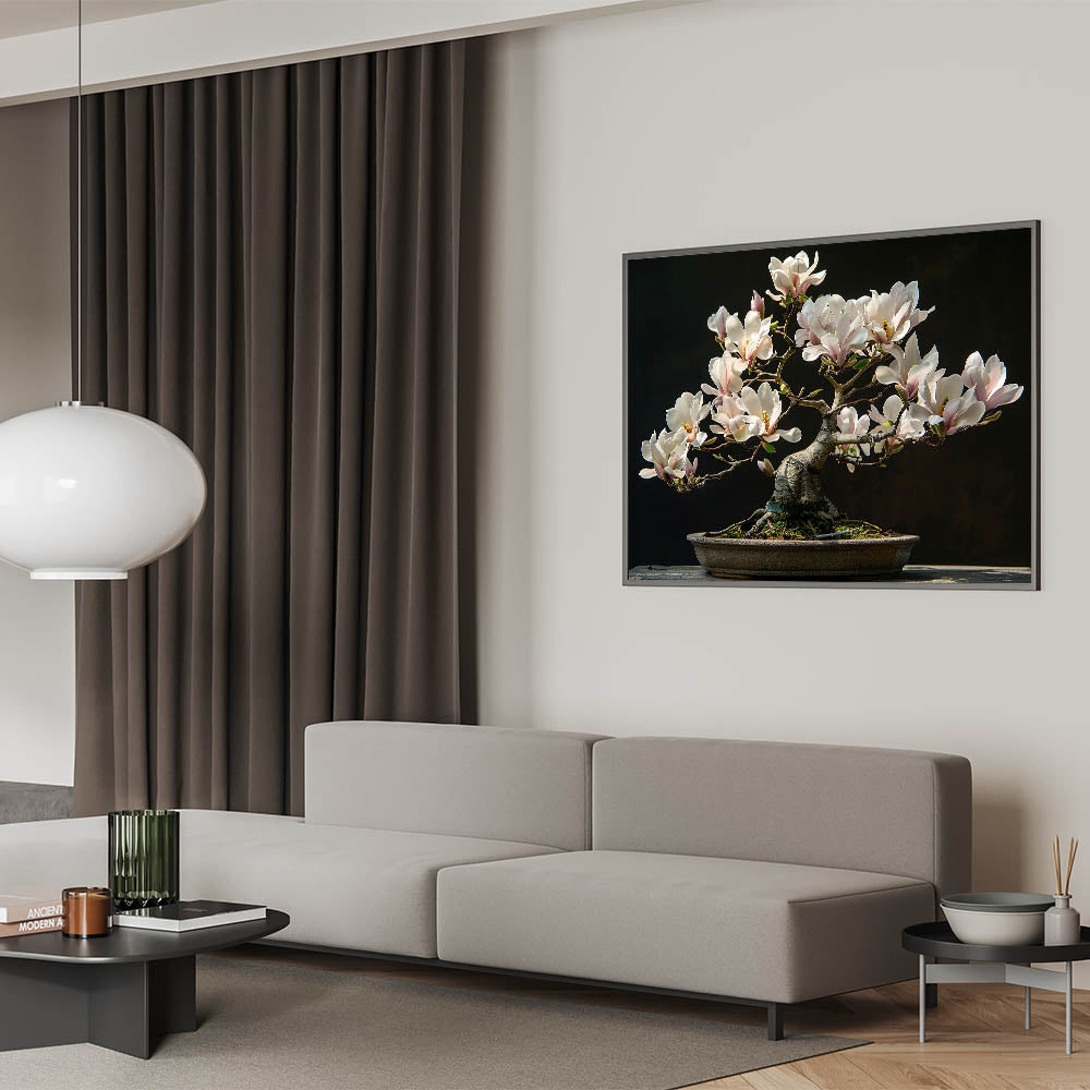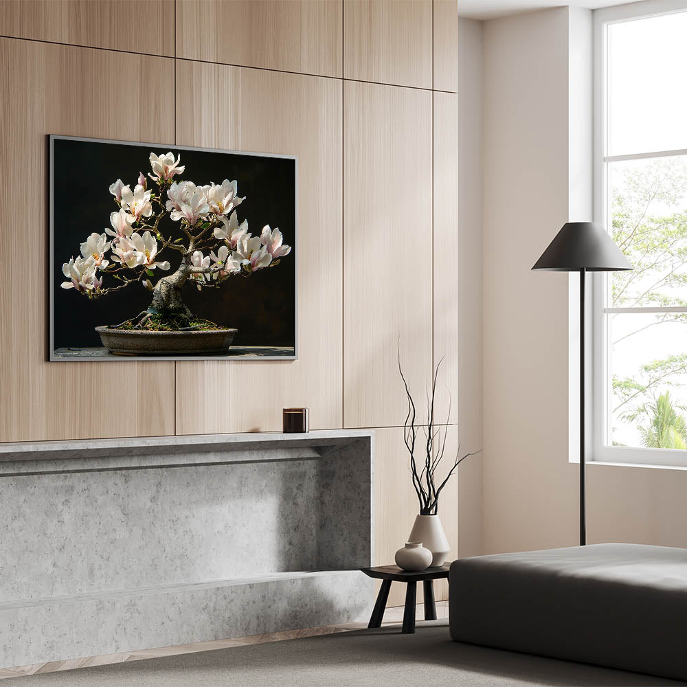The intricate branches and stunning white flowers of this bonsai tree offer a serene, nature-inspired focal point for any room. This artwork embodies the principles of Zen, encouraging balance and harmony in your surroundings. Perfect for adding a peaceful touch to your decor.