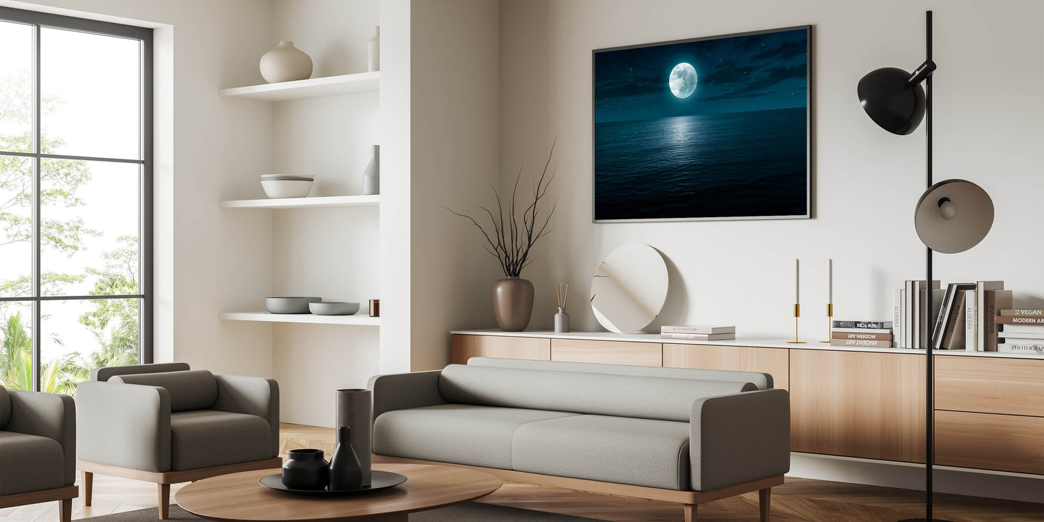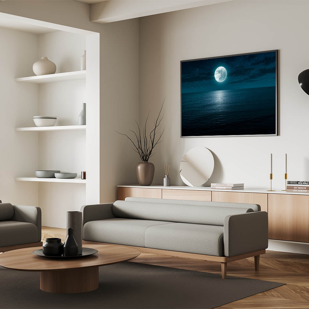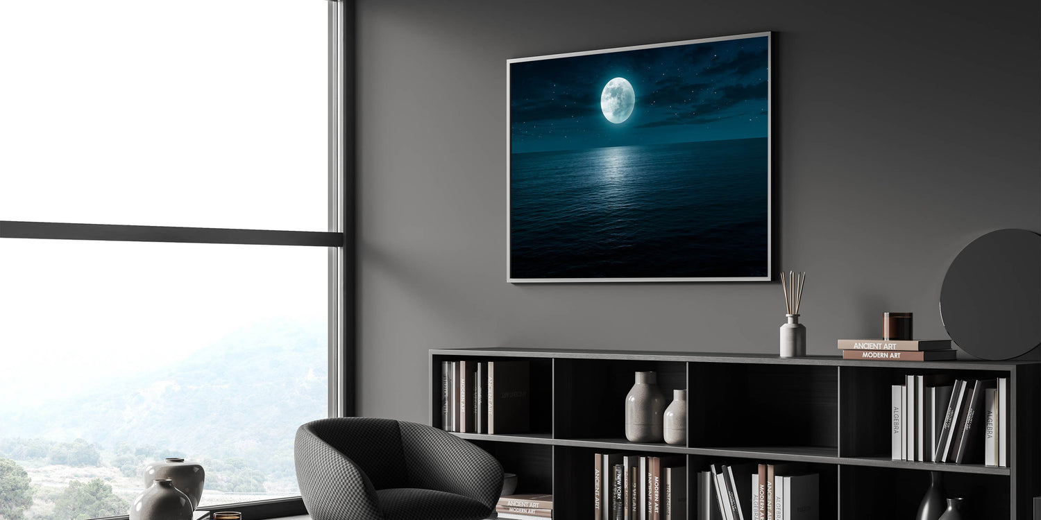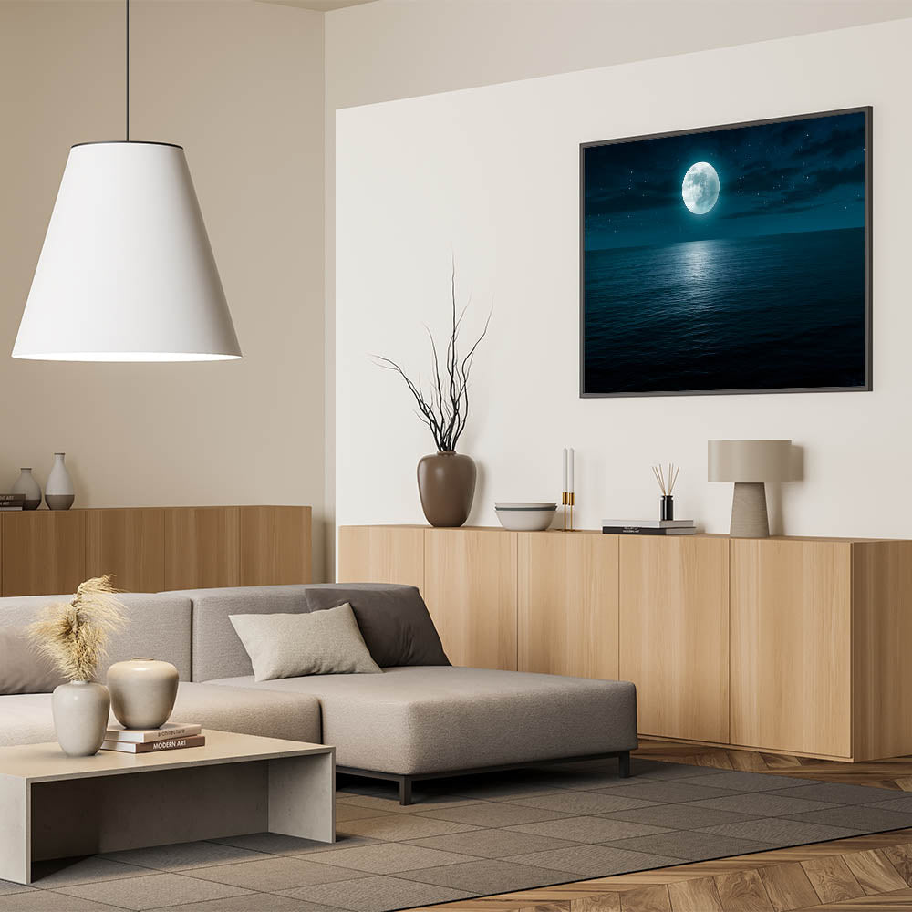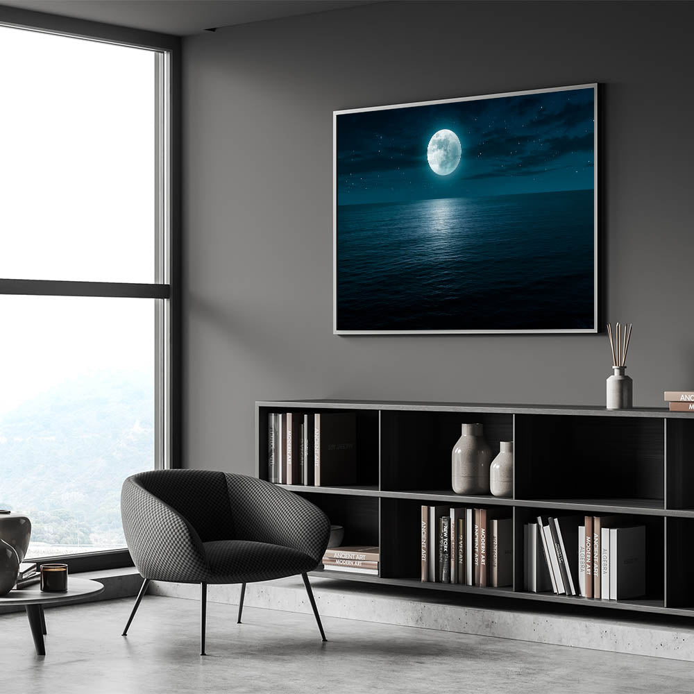 - High-definition print capturing the ethereal glow and serene beauty of a moonlit ocean.