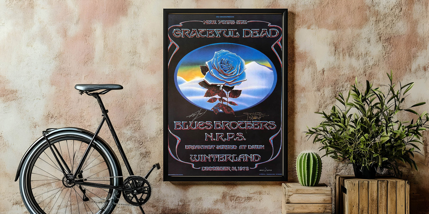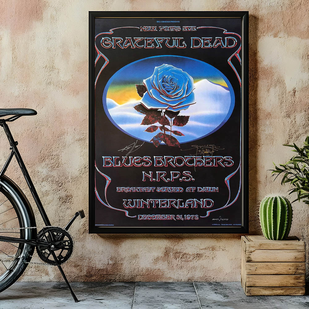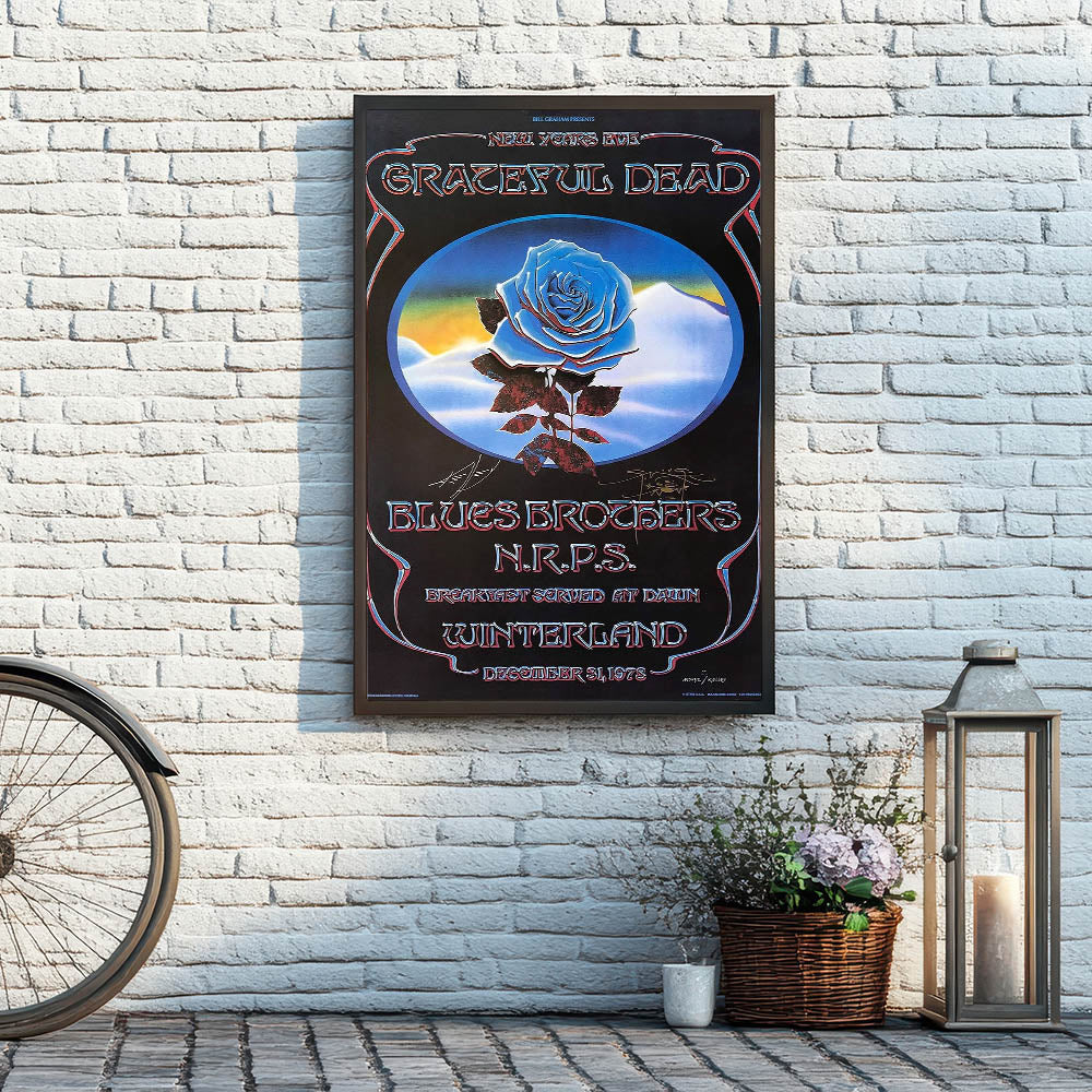 Relive the magic of rock history with this Grateful Dead Retro Wall Art, featuring a Vintage Print from their legendary New Year's Eve 1978 concert at Winterland. This Retro Poster Art showcases a stunning blue rose against a cosmic backdrop, blending psychedelic elements with classic rock aesthetics. A must-have for collectors, music lovers, and fans of Classic Retro Style.