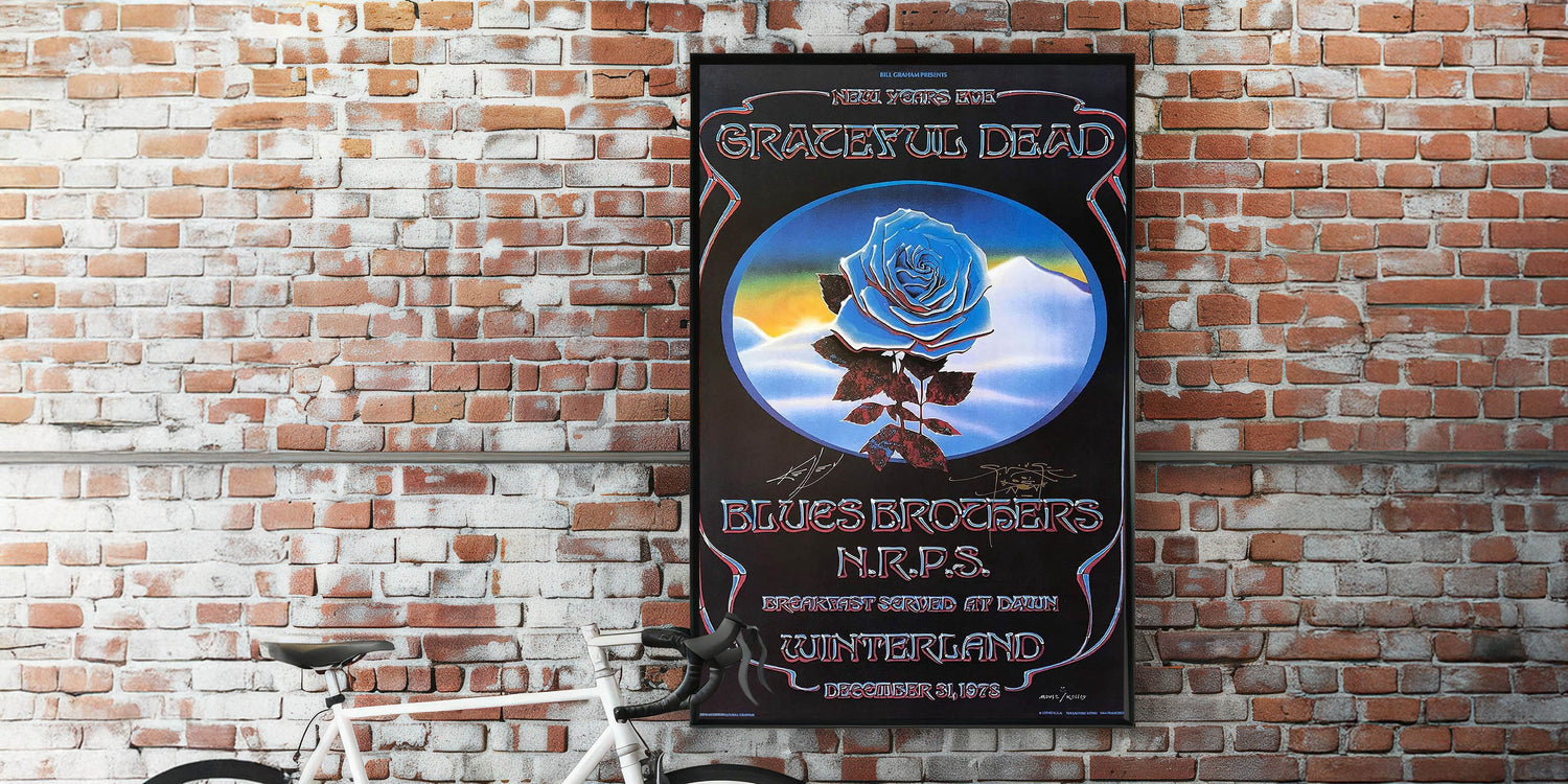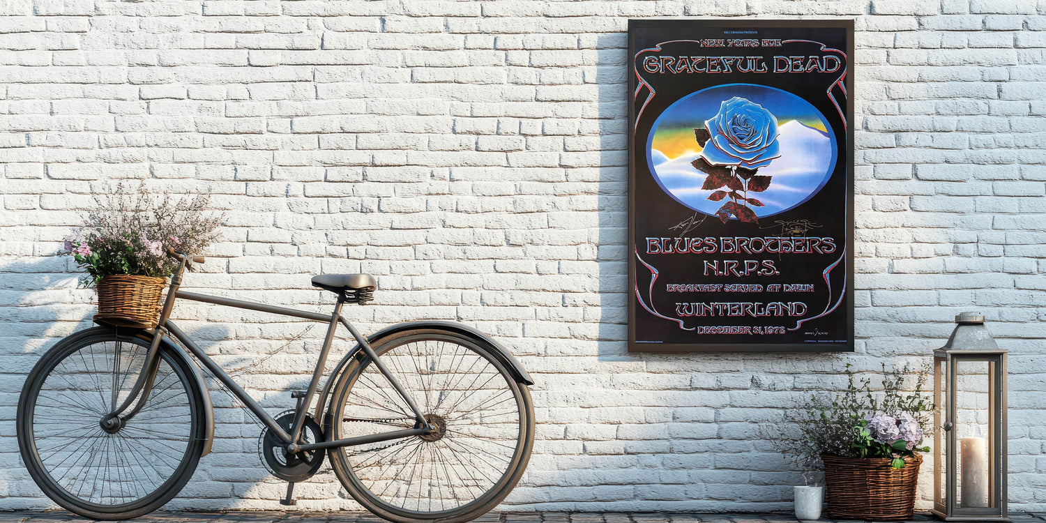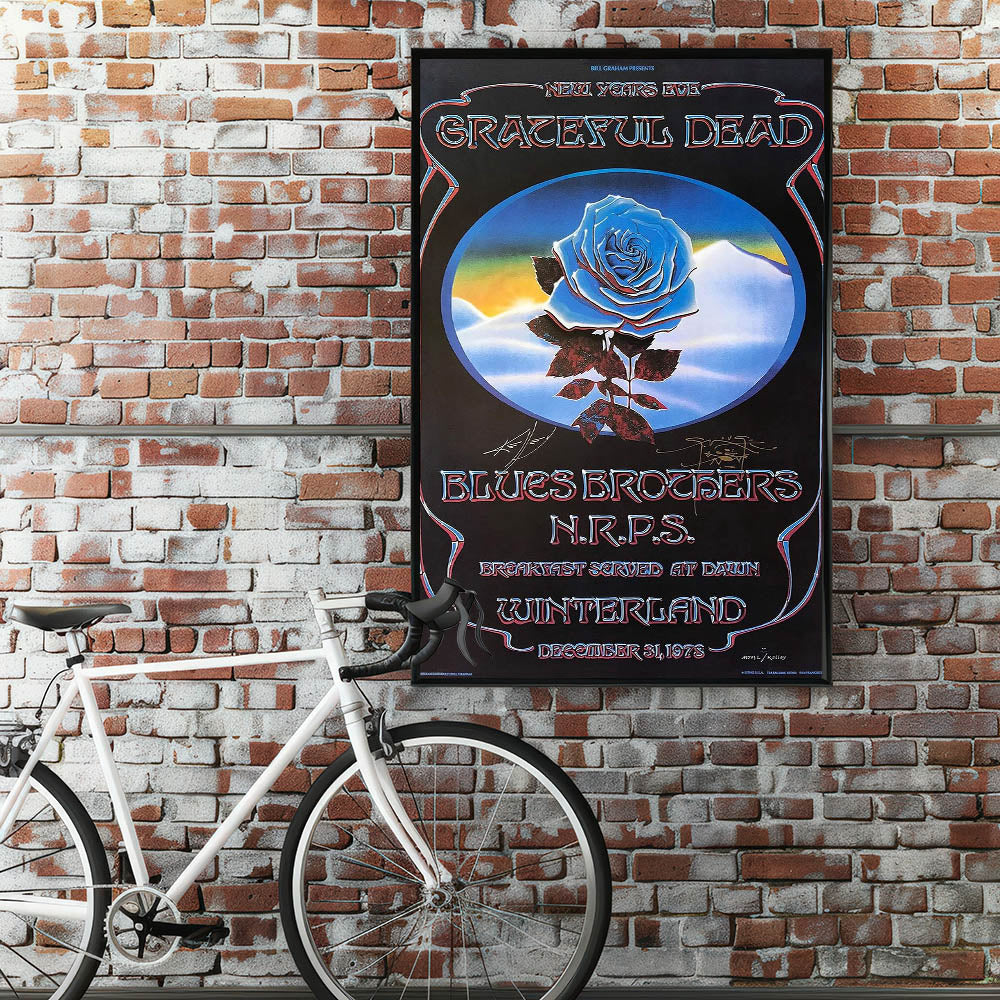 Relive the magic of rock history with this Grateful Dead Retro Wall Art, featuring a Vintage Print from their legendary New Year's Eve 1978 concert at Winterland. This Retro Poster Art showcases a stunning blue rose against a cosmic backdrop, blending psychedelic elements with classic rock aesthetics. A must-have for collectors, music lovers, and fans of Classic Retro Style.