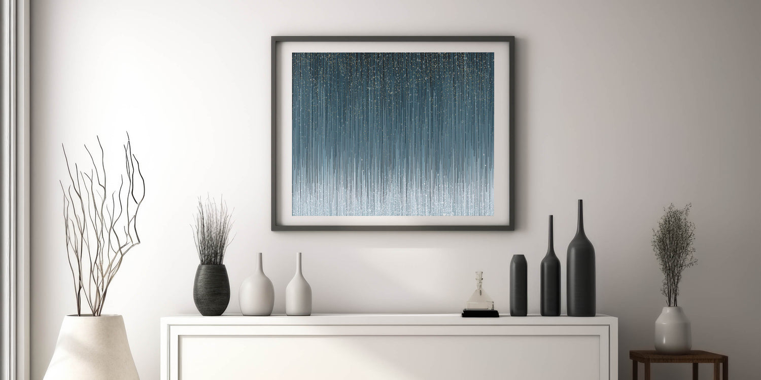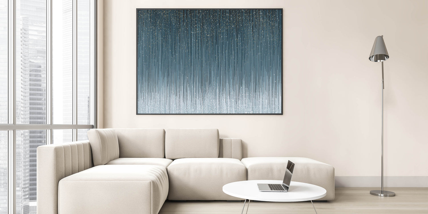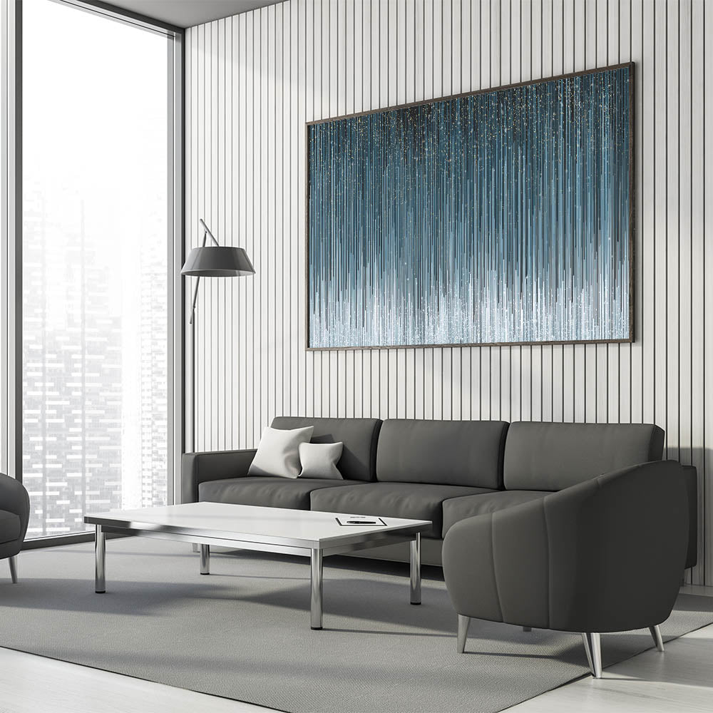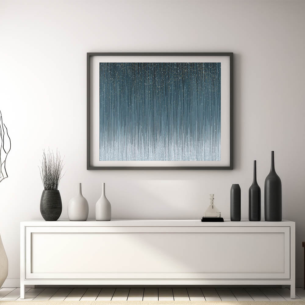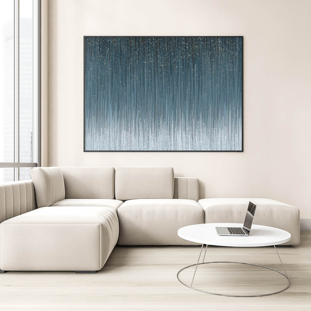 Transform your space with this large modern art piece, a stunning addition to the Abstracts in Modern Essence collection. This modern abstract wall art features cascading vertical lines in deep blue tones, highlighted by shimmering gold accents and subtle silver specks. The dynamic gradient effect creates an elegant yet contemporary look, making this piece a perfect focal point for modern interiors.