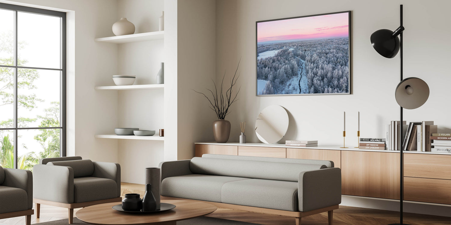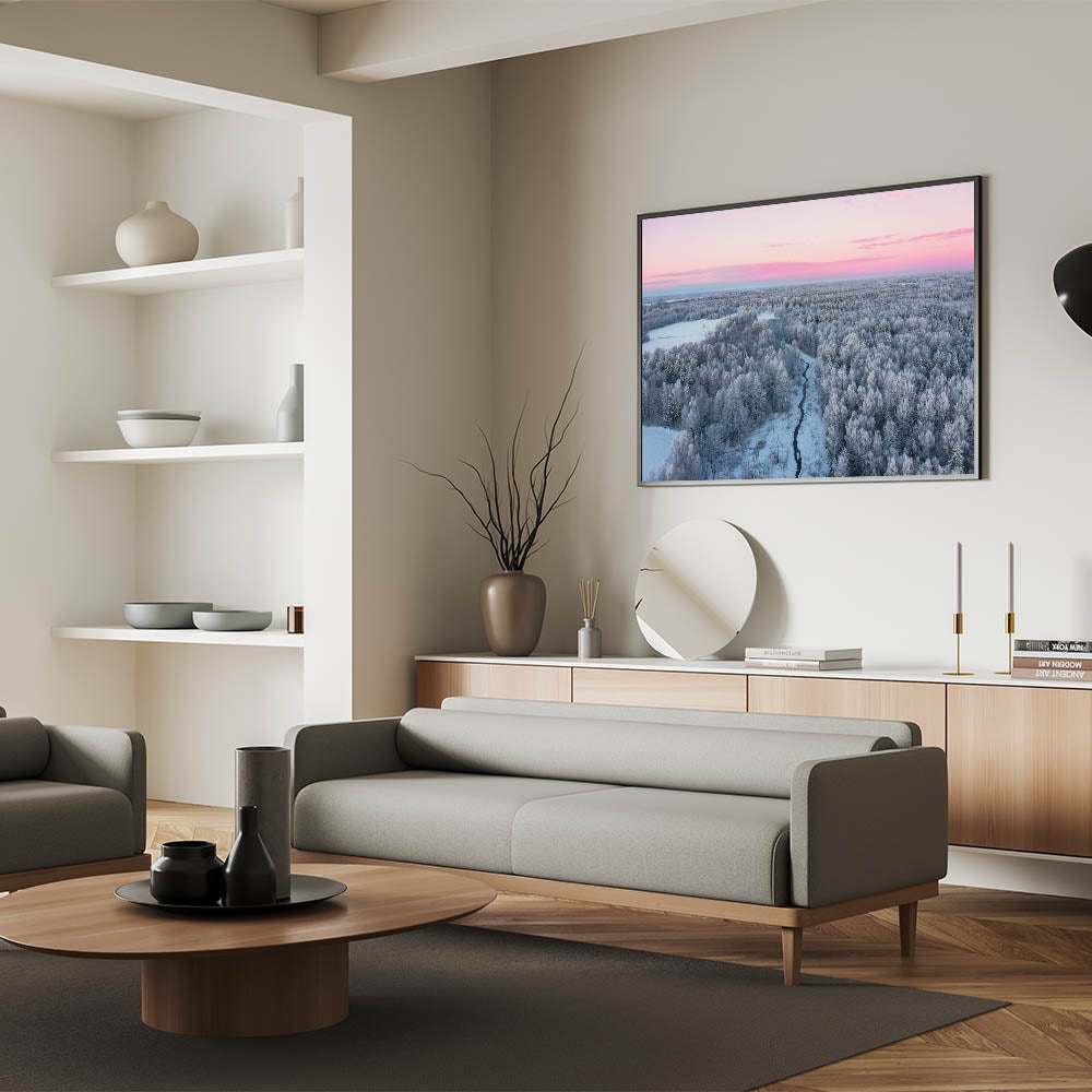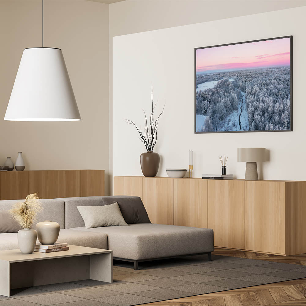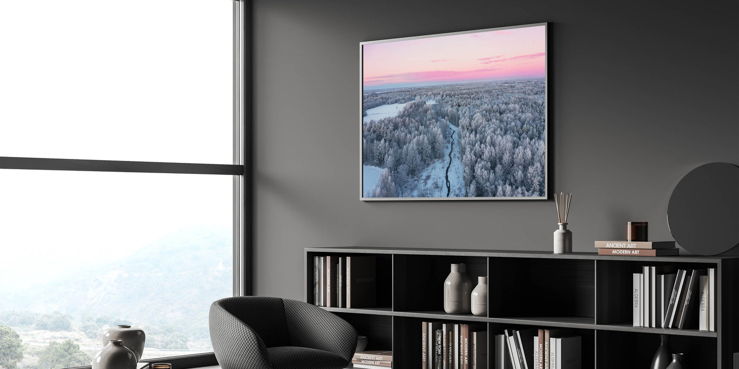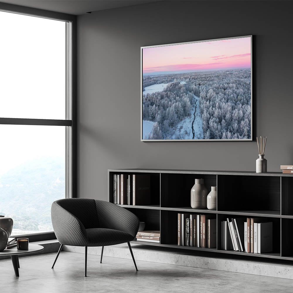 Transform your space with the peaceful beauty of Latvia's winter landscape. This exquisite Latvia canvas print showcases a serene view of a snow-covered forest, with a delicate winding stream that adds a touch of life to the calm, frozen scene. As the sun sets, the sky blushes with soft pink and purple tones, enhancing the natural beauty of this Baltic region. Perfect for anyone who loves European scenery or is looking for unique wall art from Latvia.