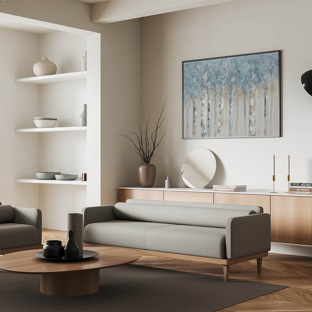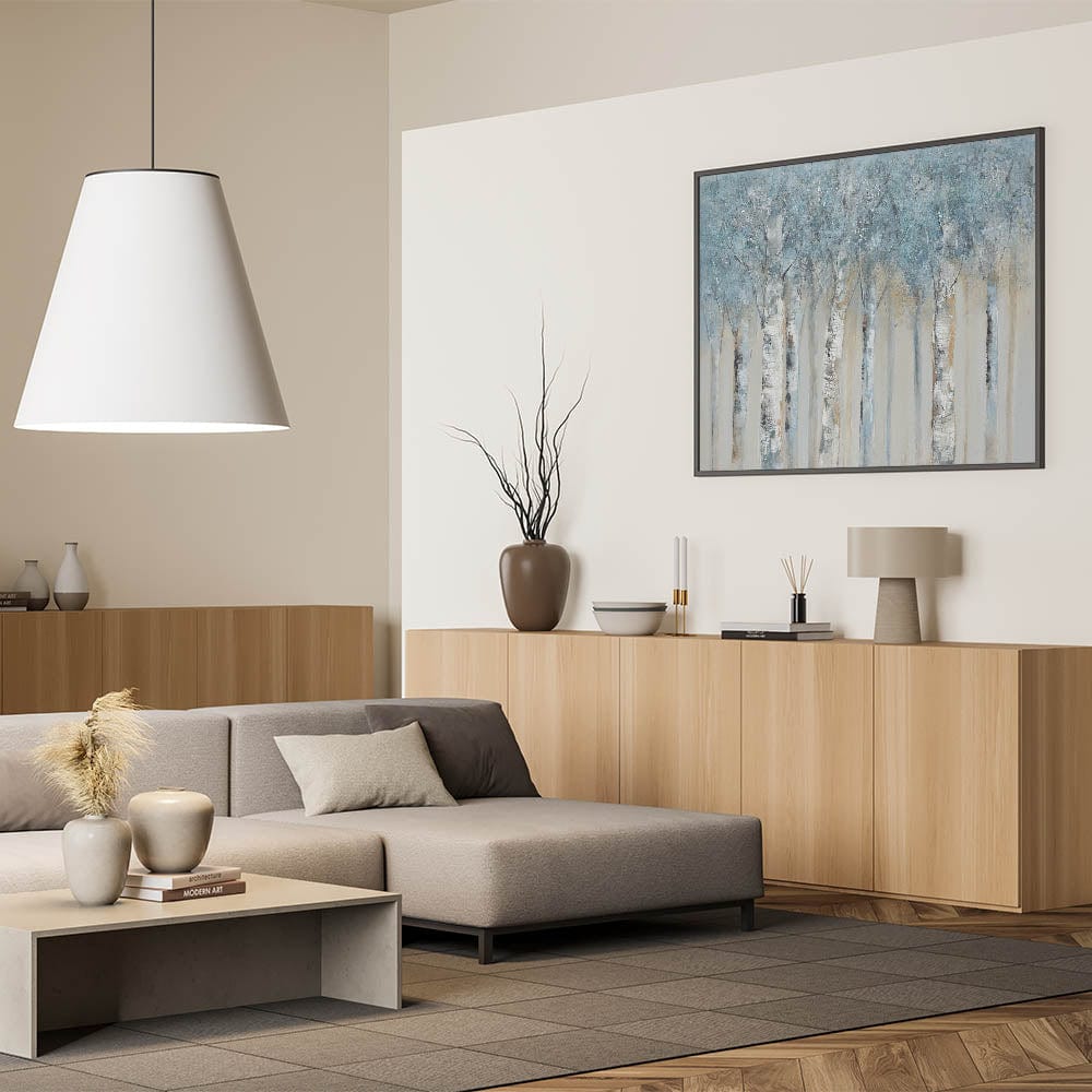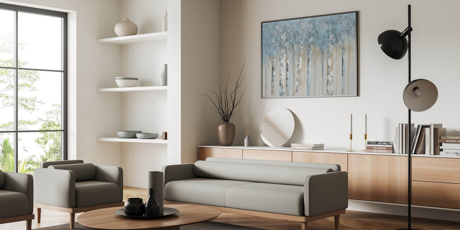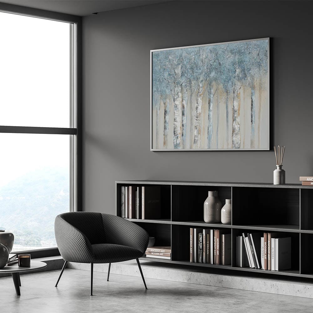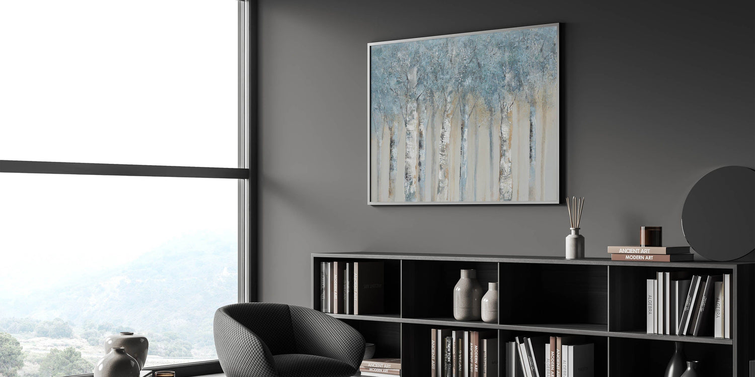 Bring calming sophistication to your space with this Minimalist Landscape Artwork featuring a serene birch forest rendered in soft gray blue tones. Perfect for lovers of Modern Nature Wall Decor, this piece captures the quiet magic of a winter woodland scene in a style that's clean, elegant, and timeless.