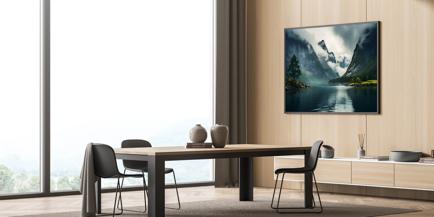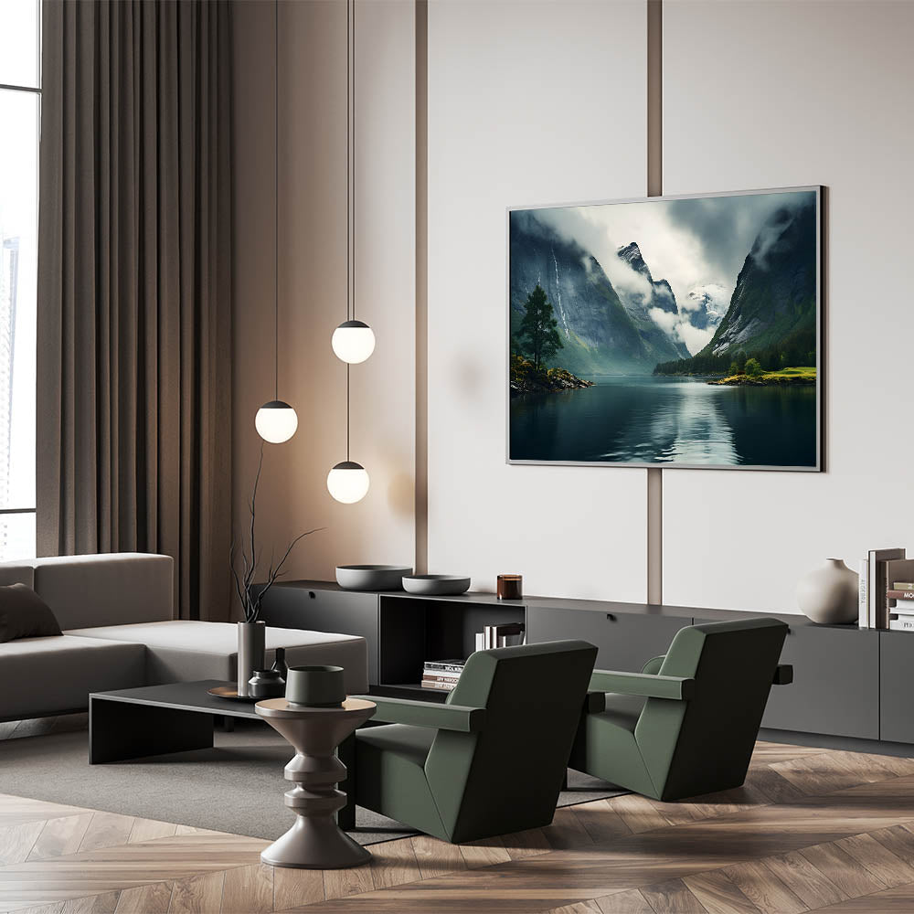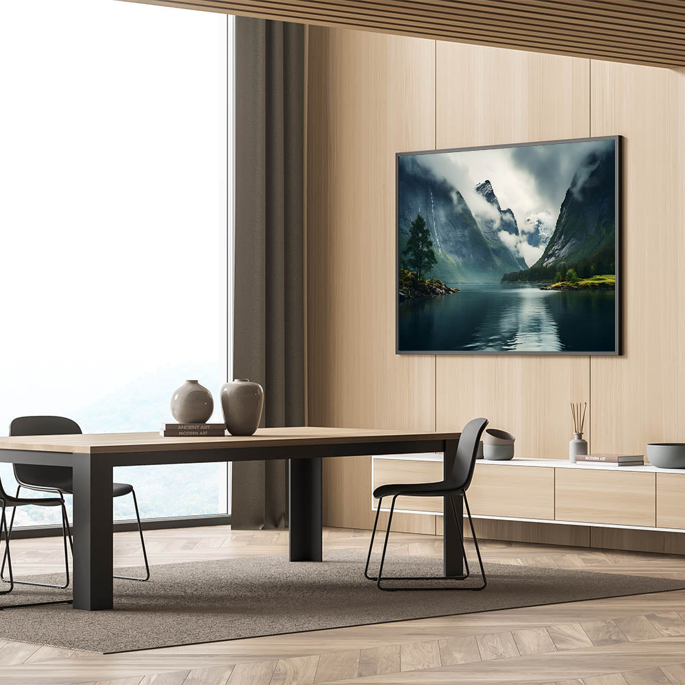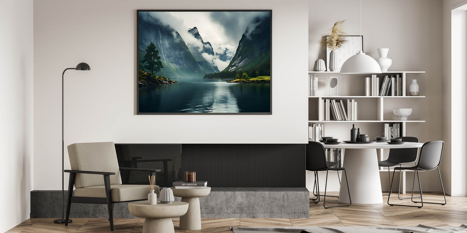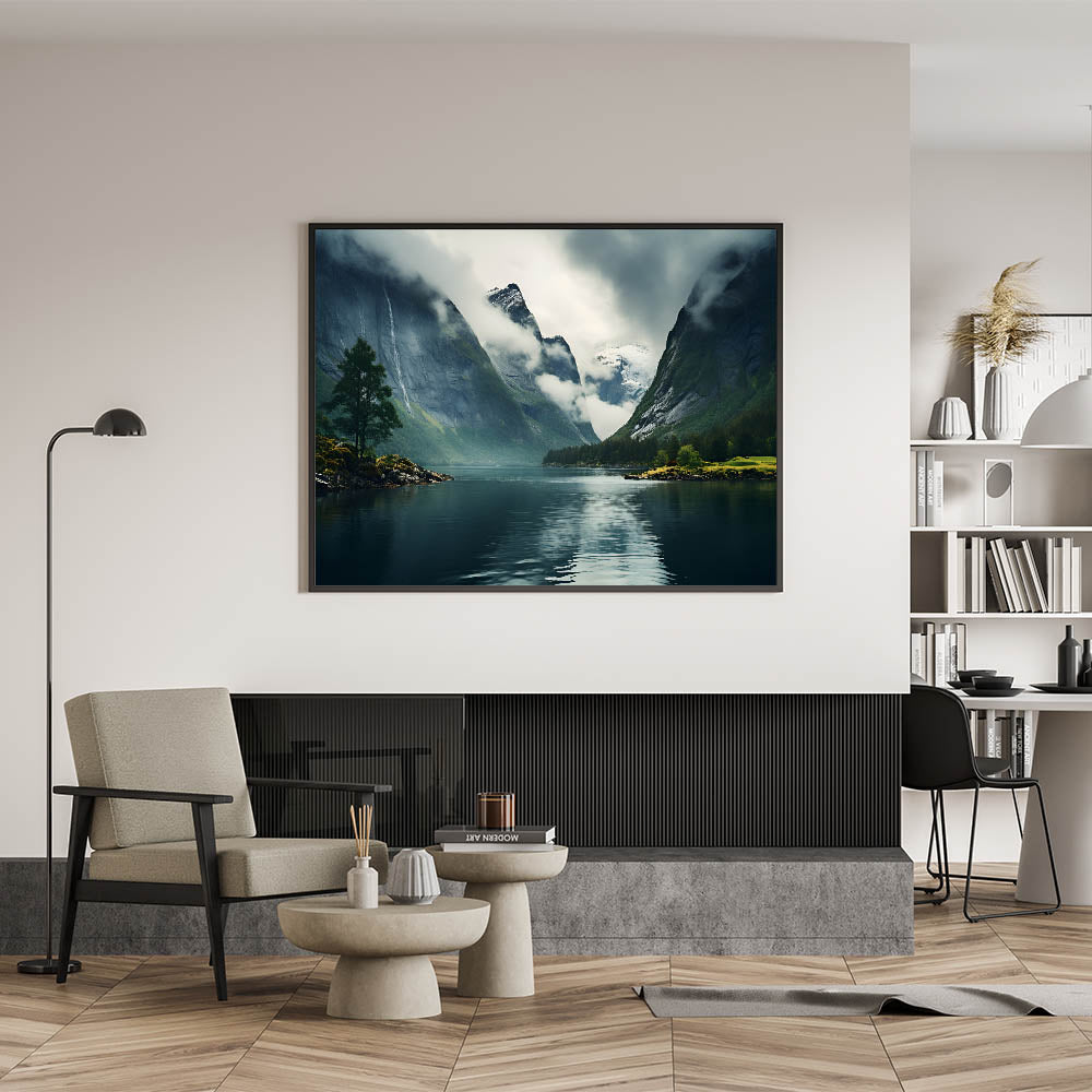 - High-Resolution Print: Vivid details and rich colors bring the fog-covered mountains and reflective waters to life.