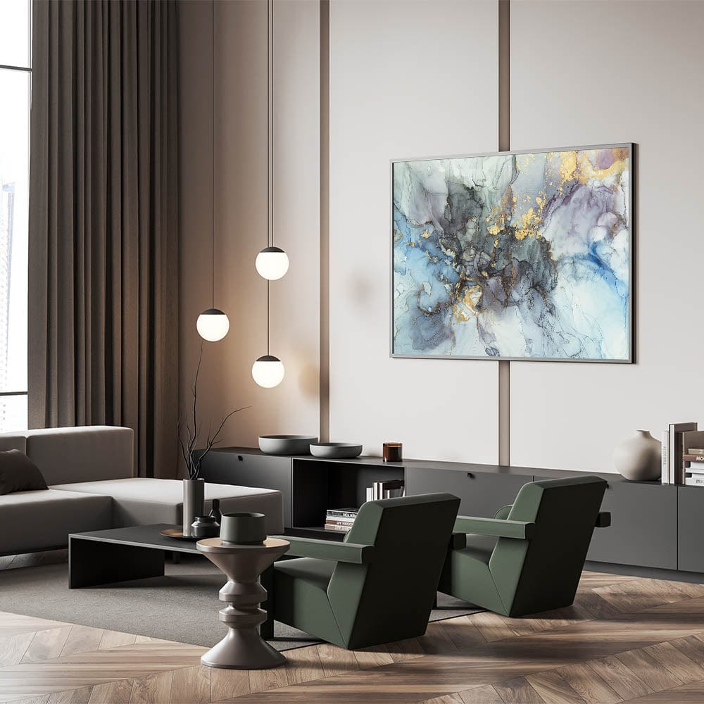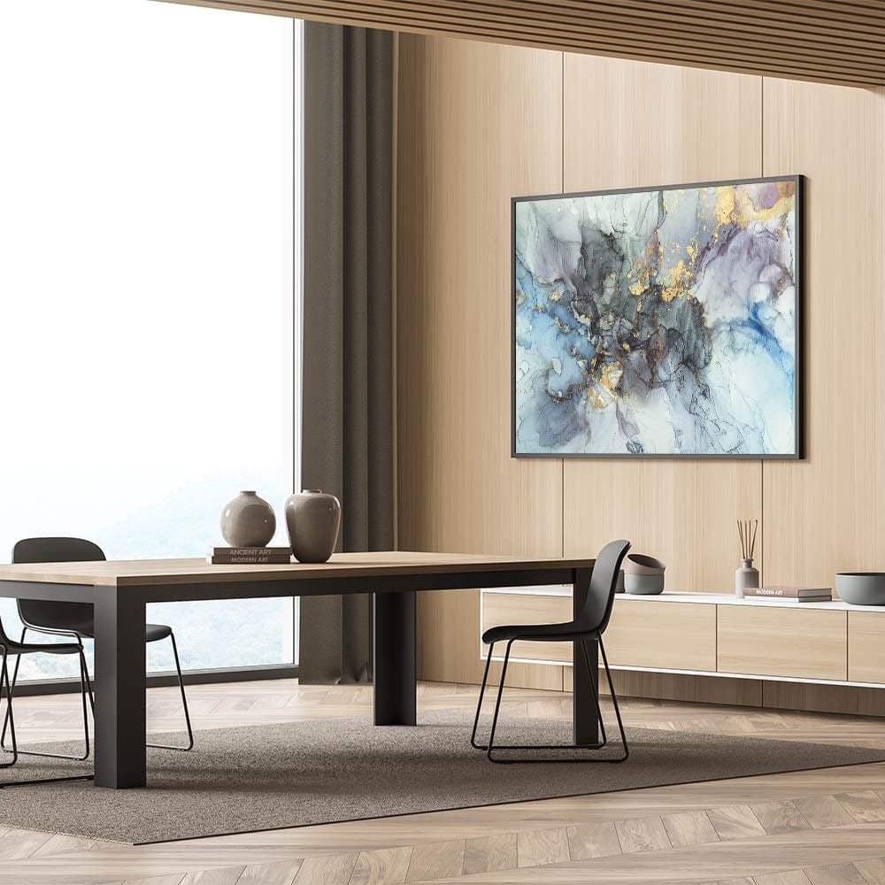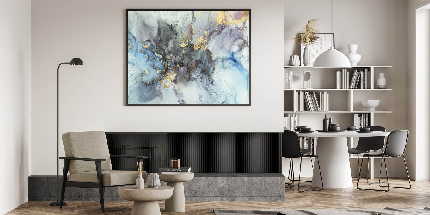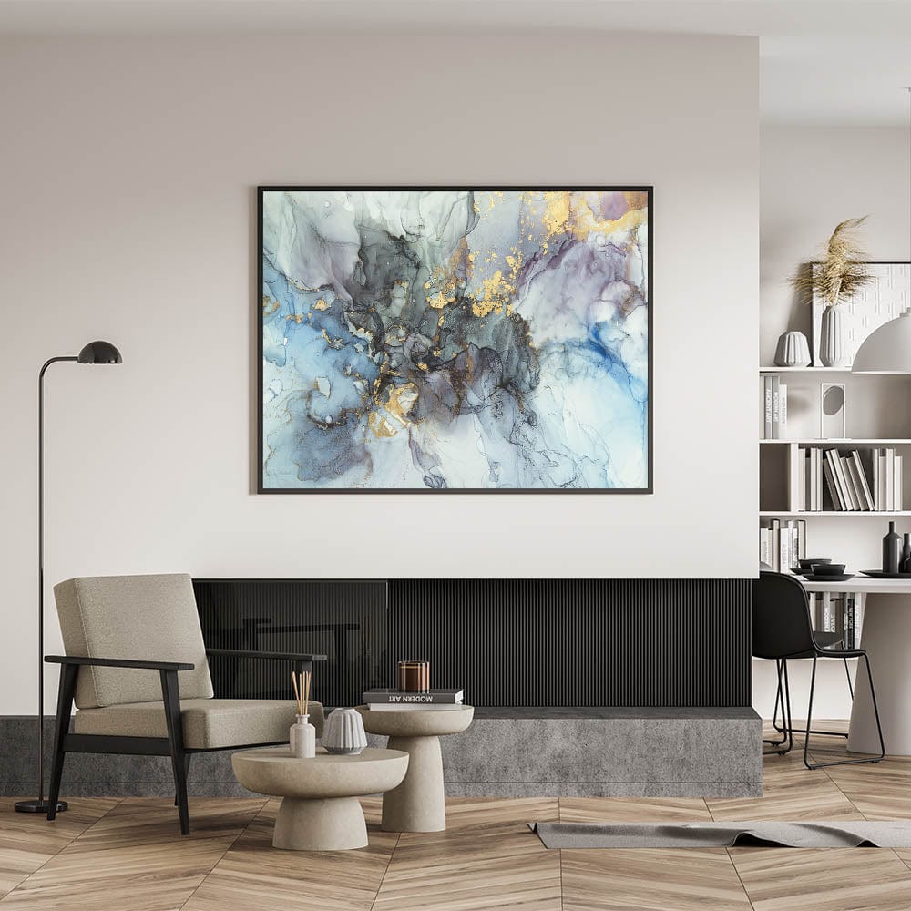 Immerse yourself in the elegance of this fluid abstract wall art, featuring a mesmerizing fusion of deep blue, black, and metallic gold. Delicate ink-like patterns flow seamlessly, creating a luxurious and sophisticated aesthetic perfect for modern and contemporary interiors.