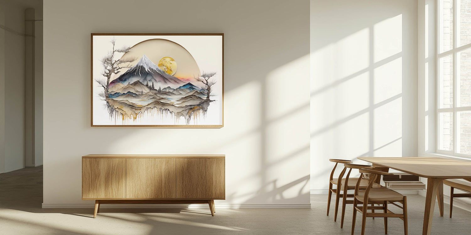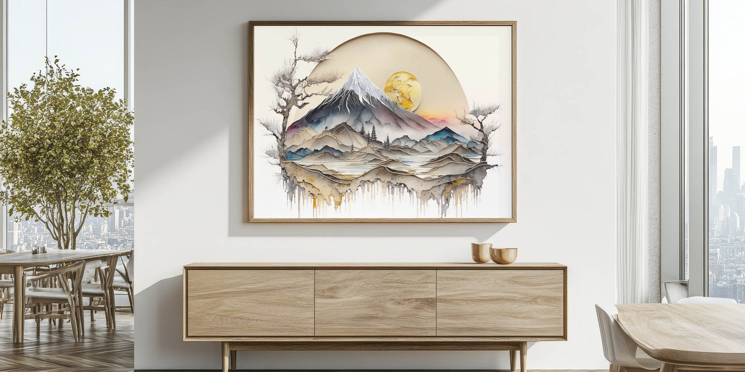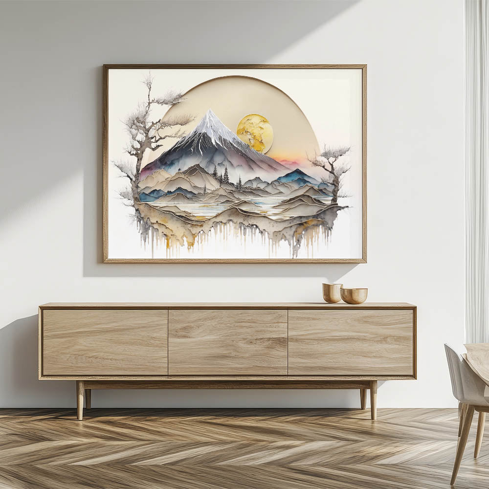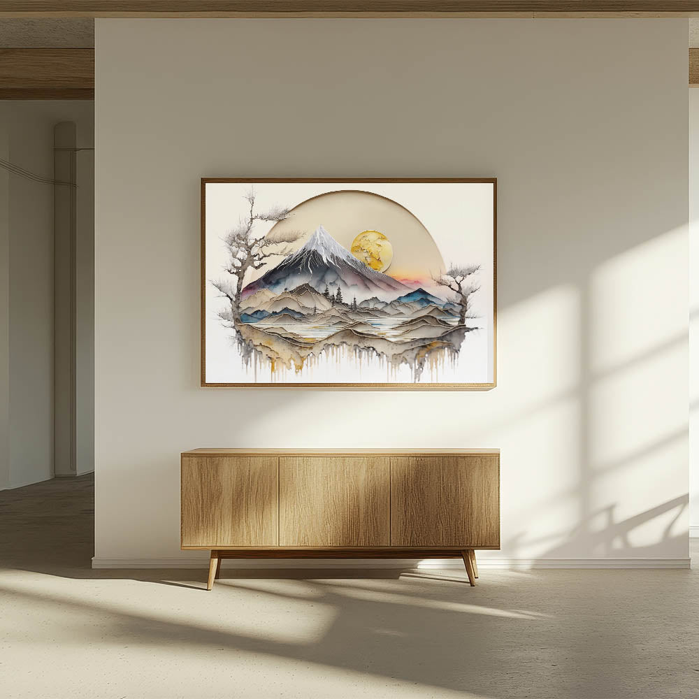 Embrace the beauty of nature with this modern mountain sunset art. Featuring a towering snow-capped mountain, bare winter trees, and a golden sun casting its warm glow across a serene landscape, this artwork brings an enchanting ambiance to any room. The detailed layers and muted colors of beige, blue, and golden yellow create a captivating visual experience, ideal for nature lovers and modern art enthusiasts alike.