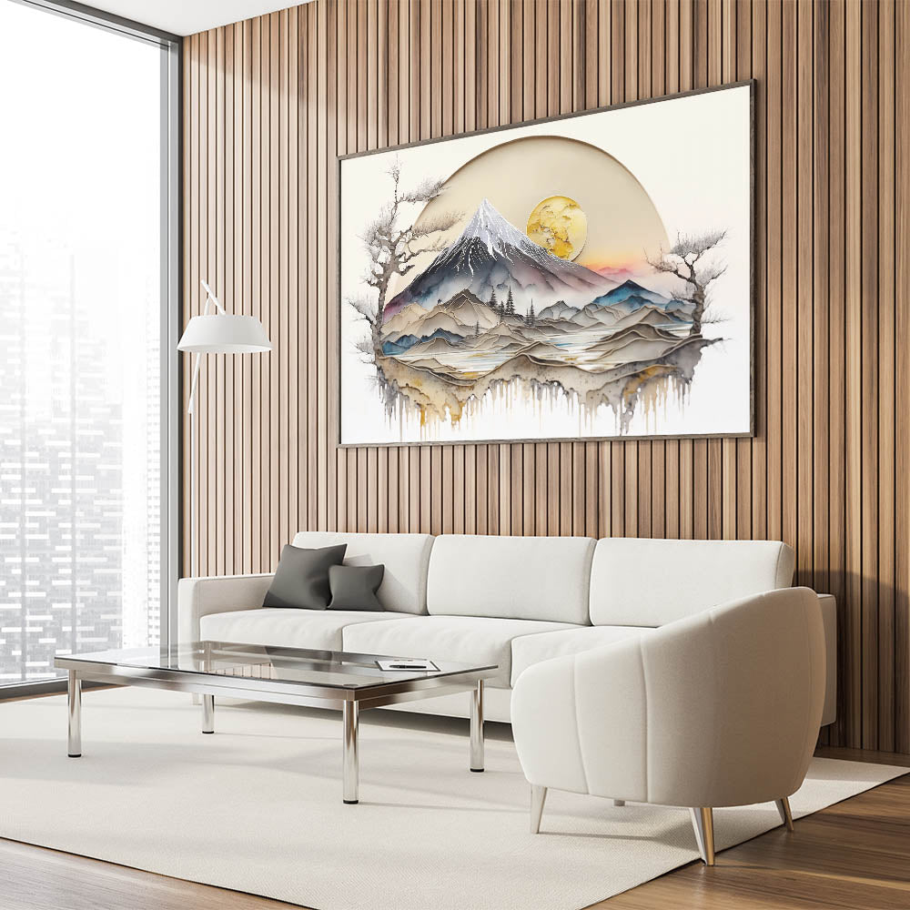 This abstract mountain art piece is a statement of nature’s beauty, combining modern design with earthy tones. Its unique layers and detailed landscape make it a stunning focal point, inspiring a sense of tranquility and wonder.