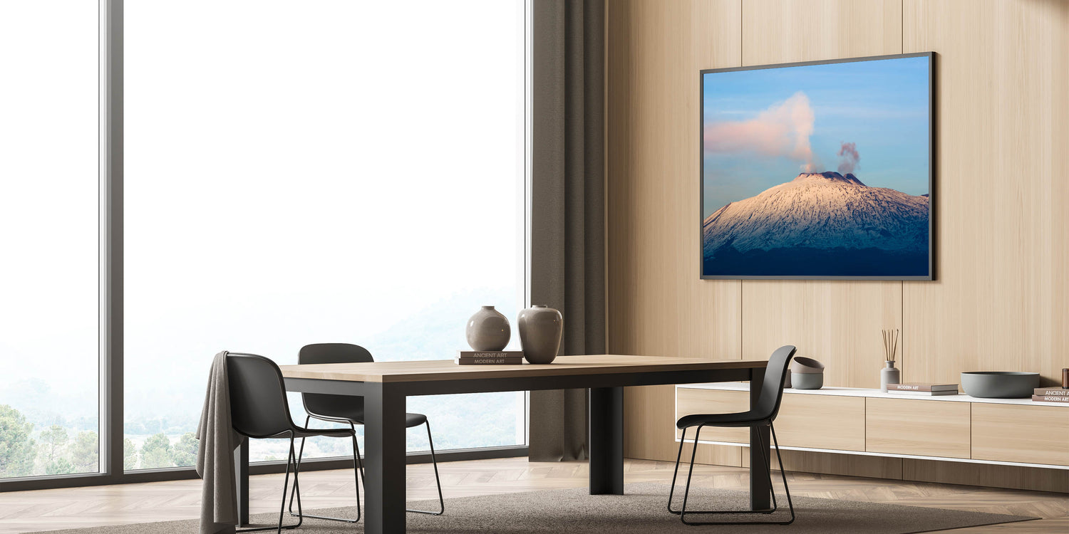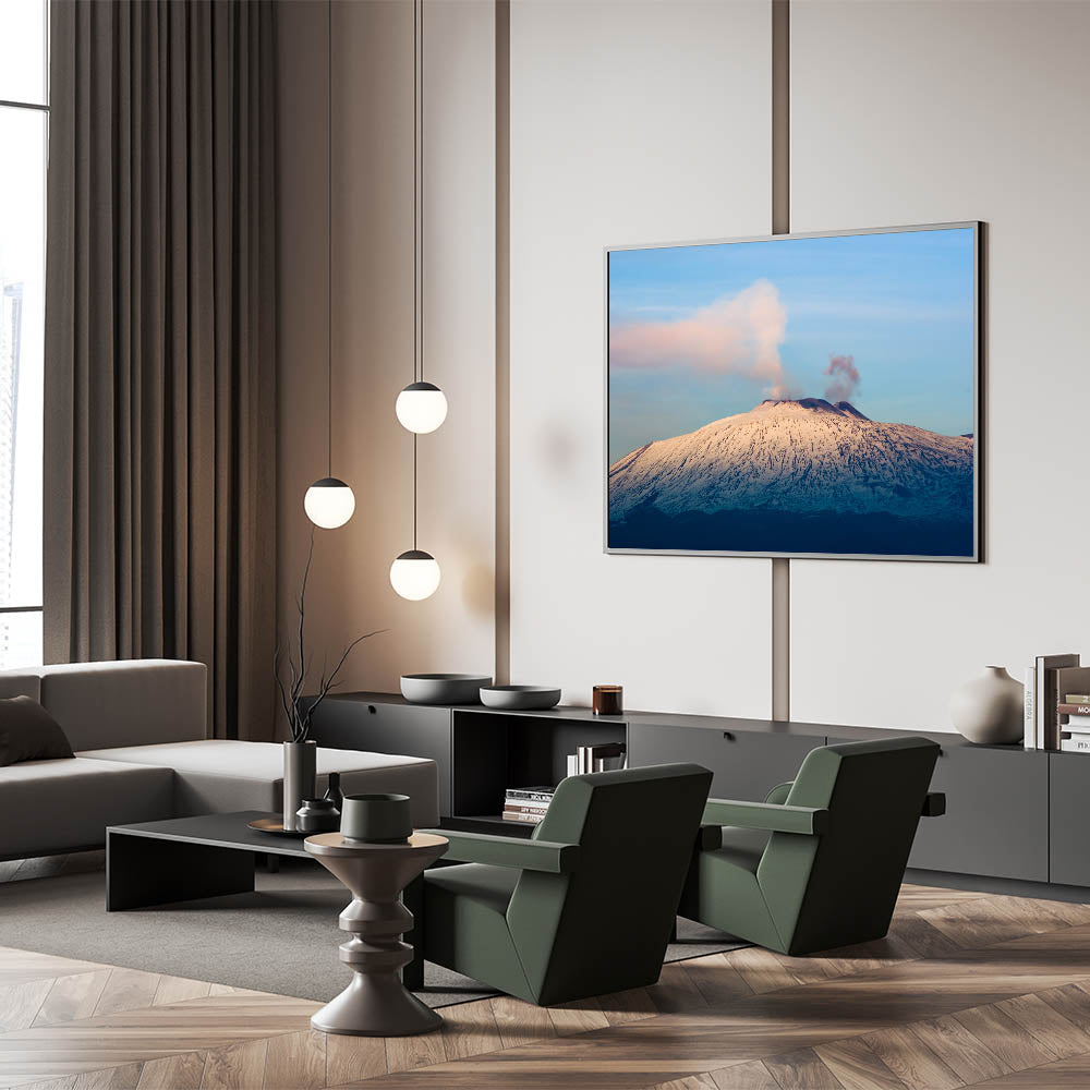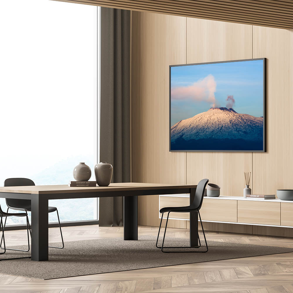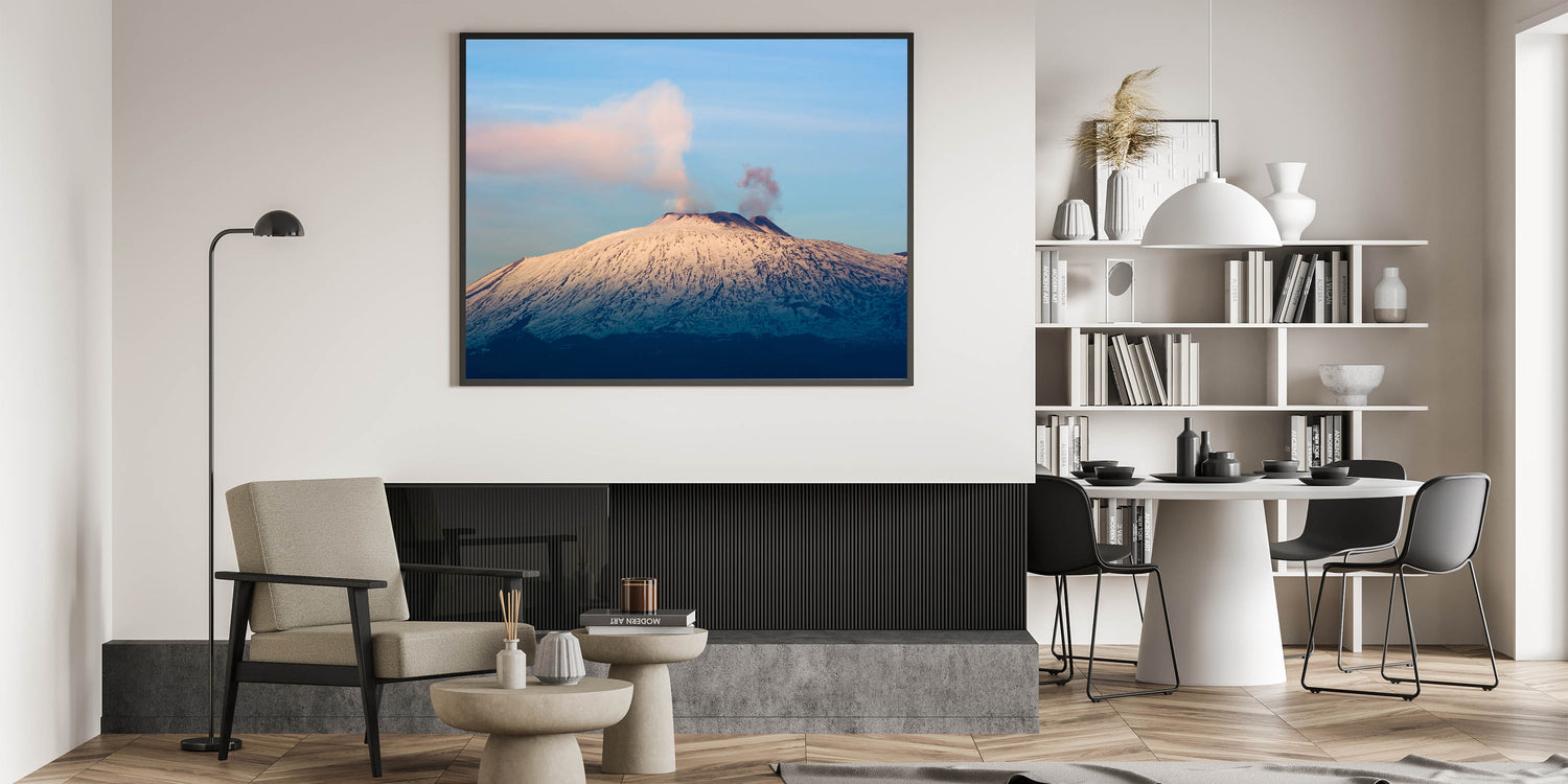 Bring the awe-inspiring beauty of Sicily's iconic Mount Etna into your home with this captivating wall art. Featuring the stunning volcanic landscape of one of Europe's most famous active volcanoes, this fine art print captures the breathtaking details of Etna's snow-covered peak and the subtle smoke rising from the summit. The calming pastel sky adds a serene touch, making this artwork a perfect addition to any home or office.