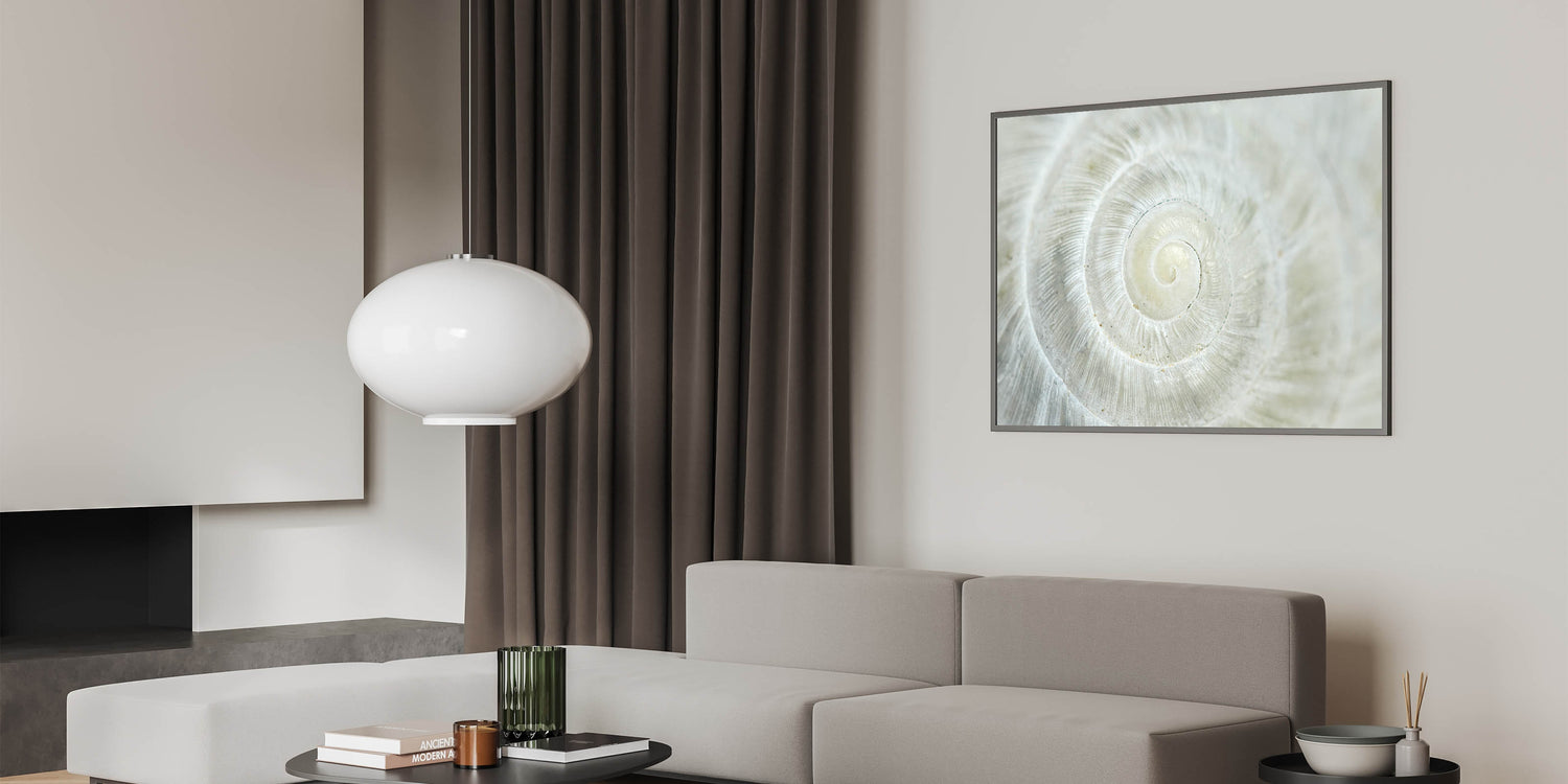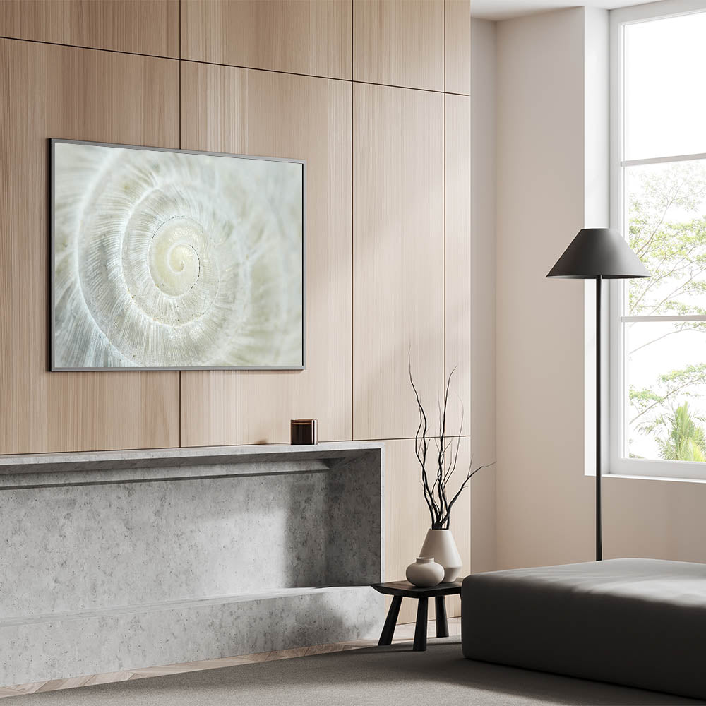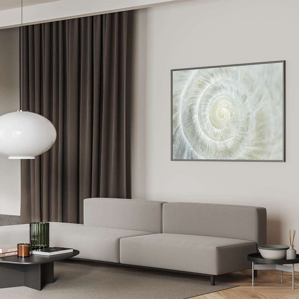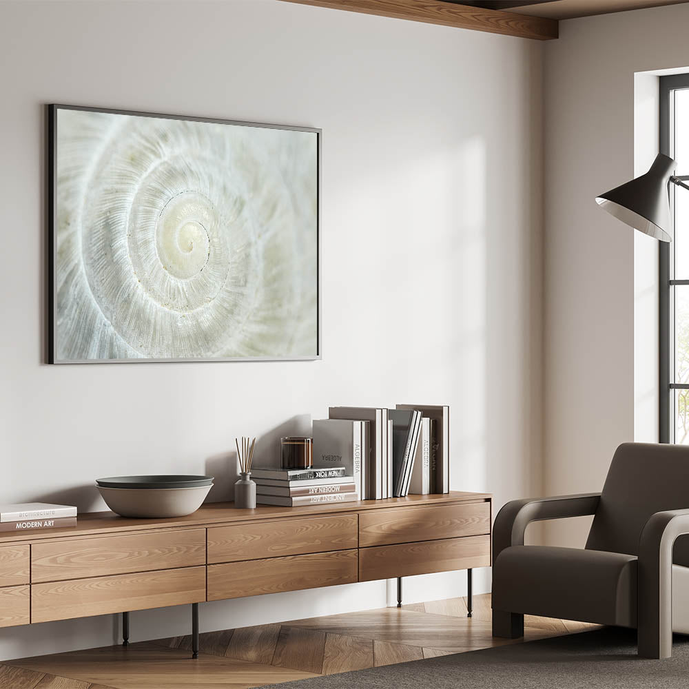 Bring the beauty of natural elements into your home with this stunning close-up of a seashell spiral. Perfectly capturing the intricate details of nature, this artwork adds a calm and soothing atmosphere to any space. Whether you're decorating a modern home or creating a nature-inspired room, this piece is sure to impress.