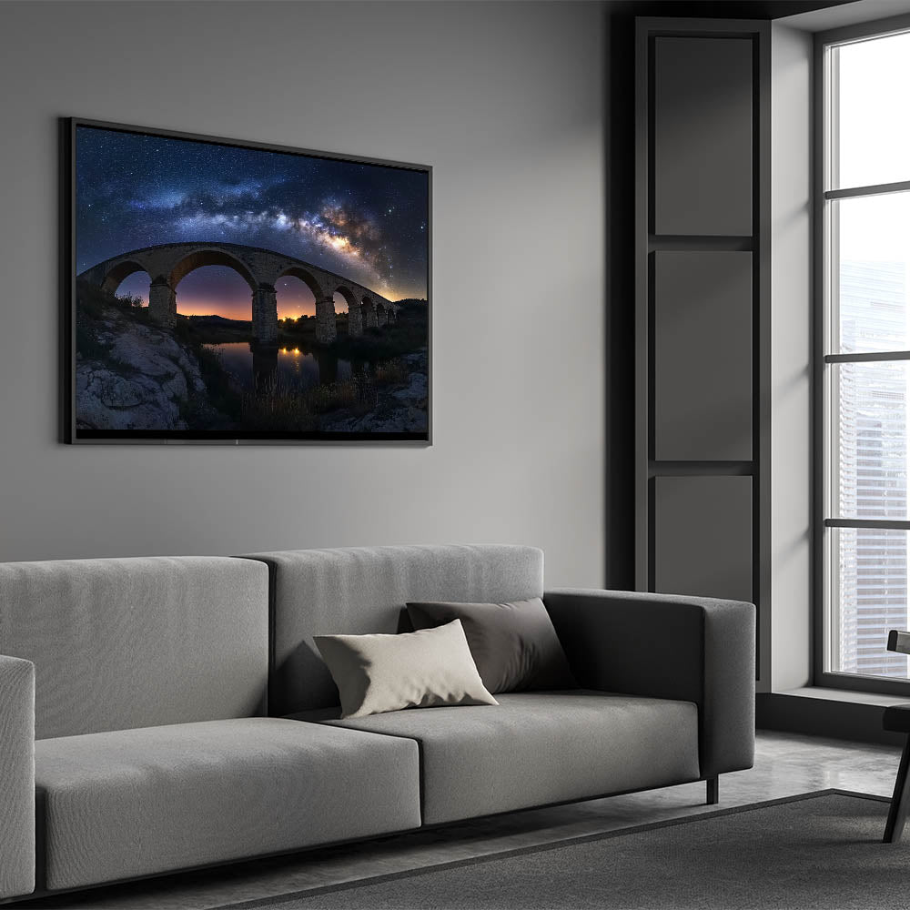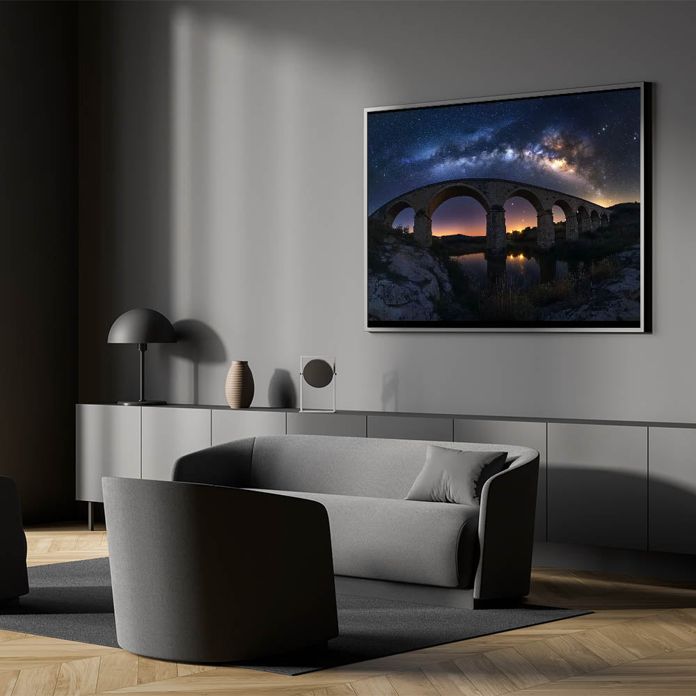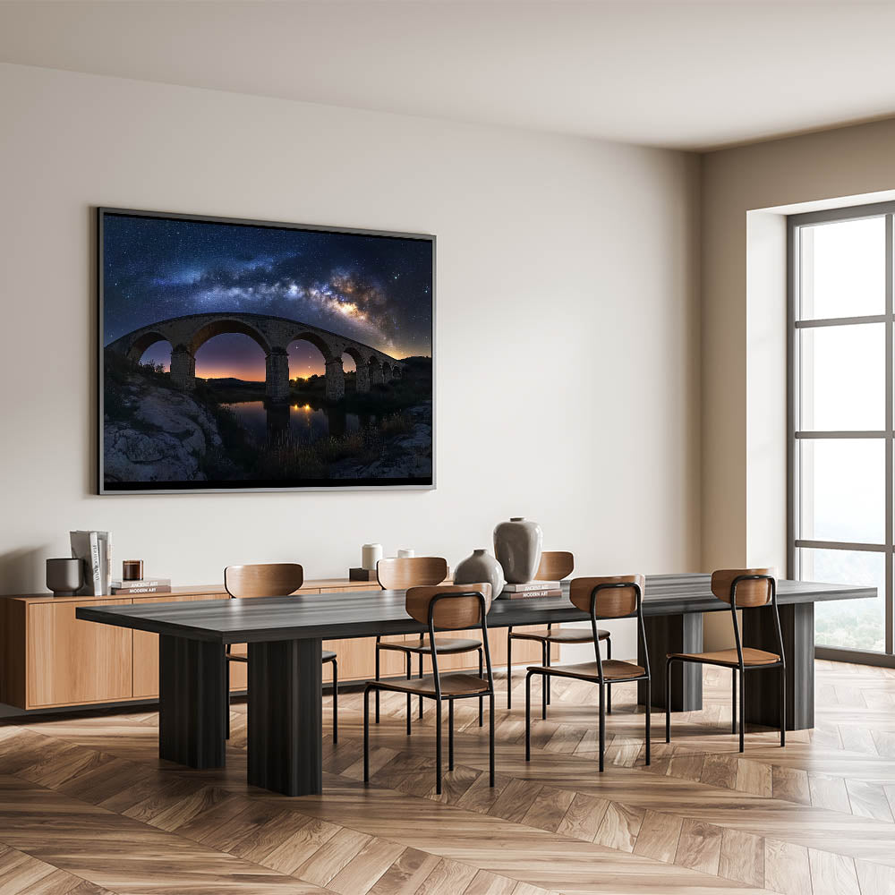 Experience the breathtaking beauty of a starlit night with this exquisite decorative bridge wall art. This artwork features an ancient stone bridge gracefully spanning a serene river, set against a mesmerizing backdrop of a star-filled sky and the radiant Milky Way. The warm glow of twilight reflects on the water, creating a harmonious blend of natural and architectural elegance. Perfect for adding a touch of tranquility and sophistication to any space, this piece captures the timeless allure of scenic bridge photography.