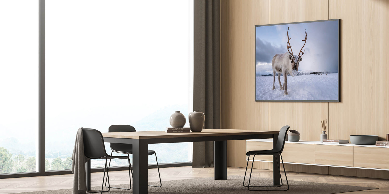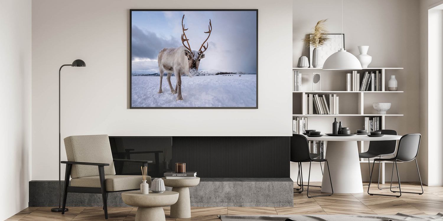 Bring the charm of Finland's winter wilderness into your home with this stunning reindeer wall art. This Finland scenery captures the serene beauty of a snow-covered landscape, highlighted by a majestic reindeer, showcasing the untouched nature of the Nordic region. Ideal for nature lovers, wildlife enthusiasts, and those who appreciate Scandinavian décor.