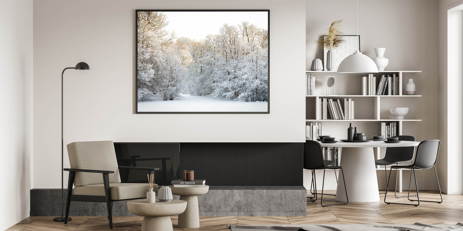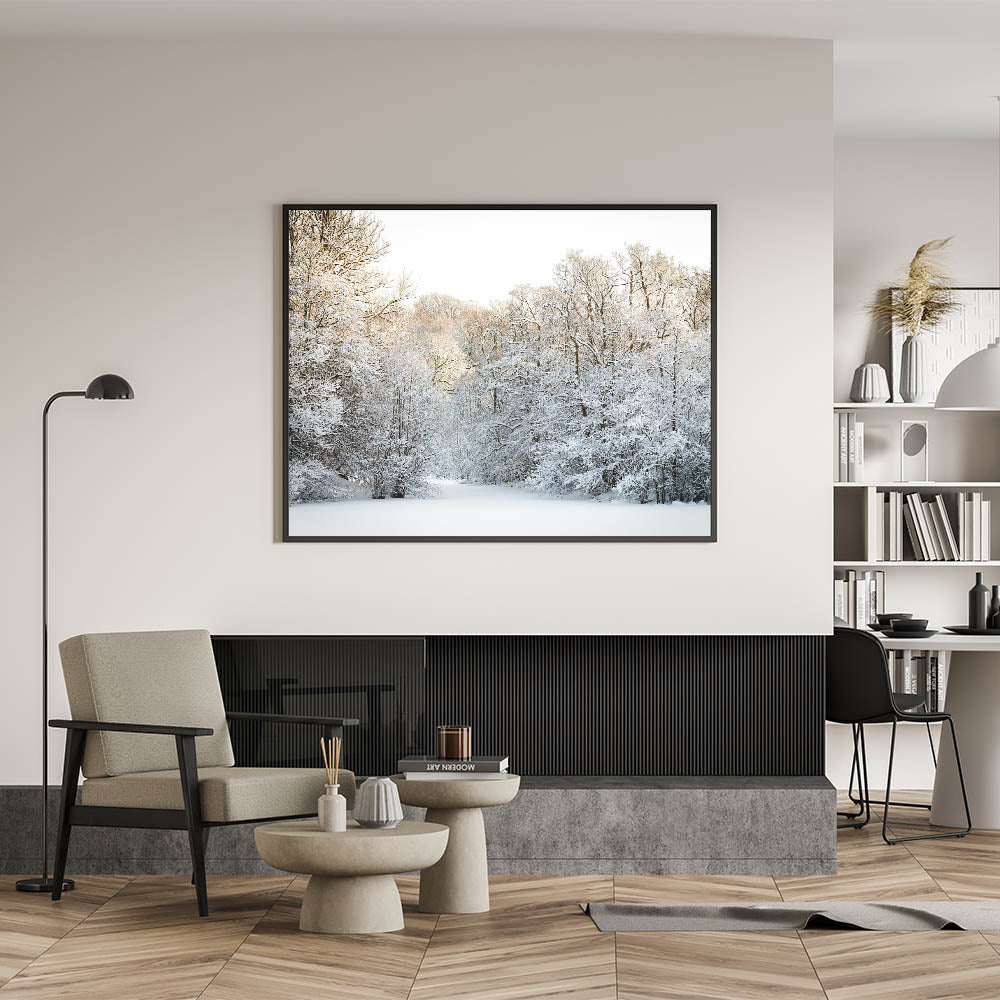 • A high-quality piece of Danish art prints that captures the beauty of a snowy winter forest.