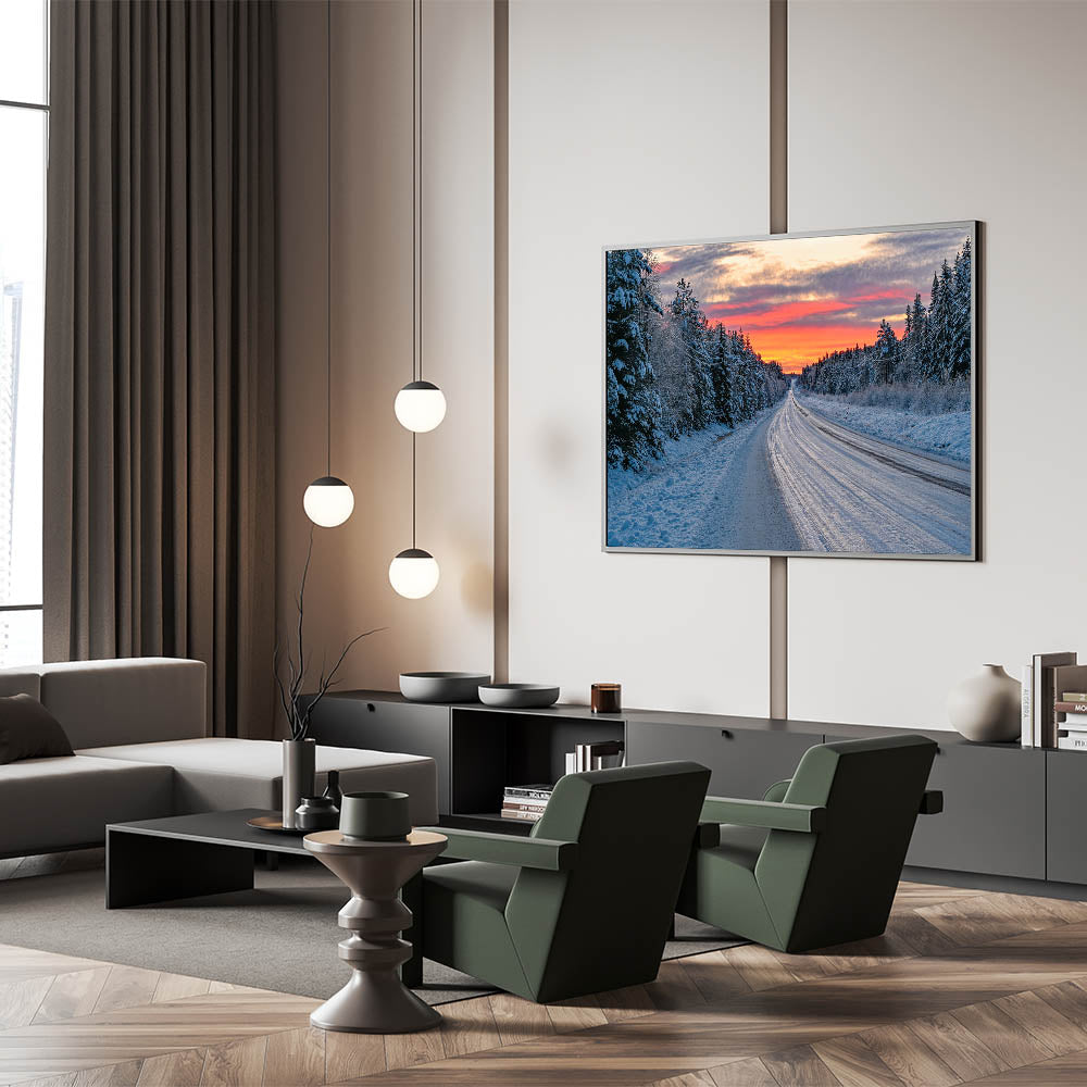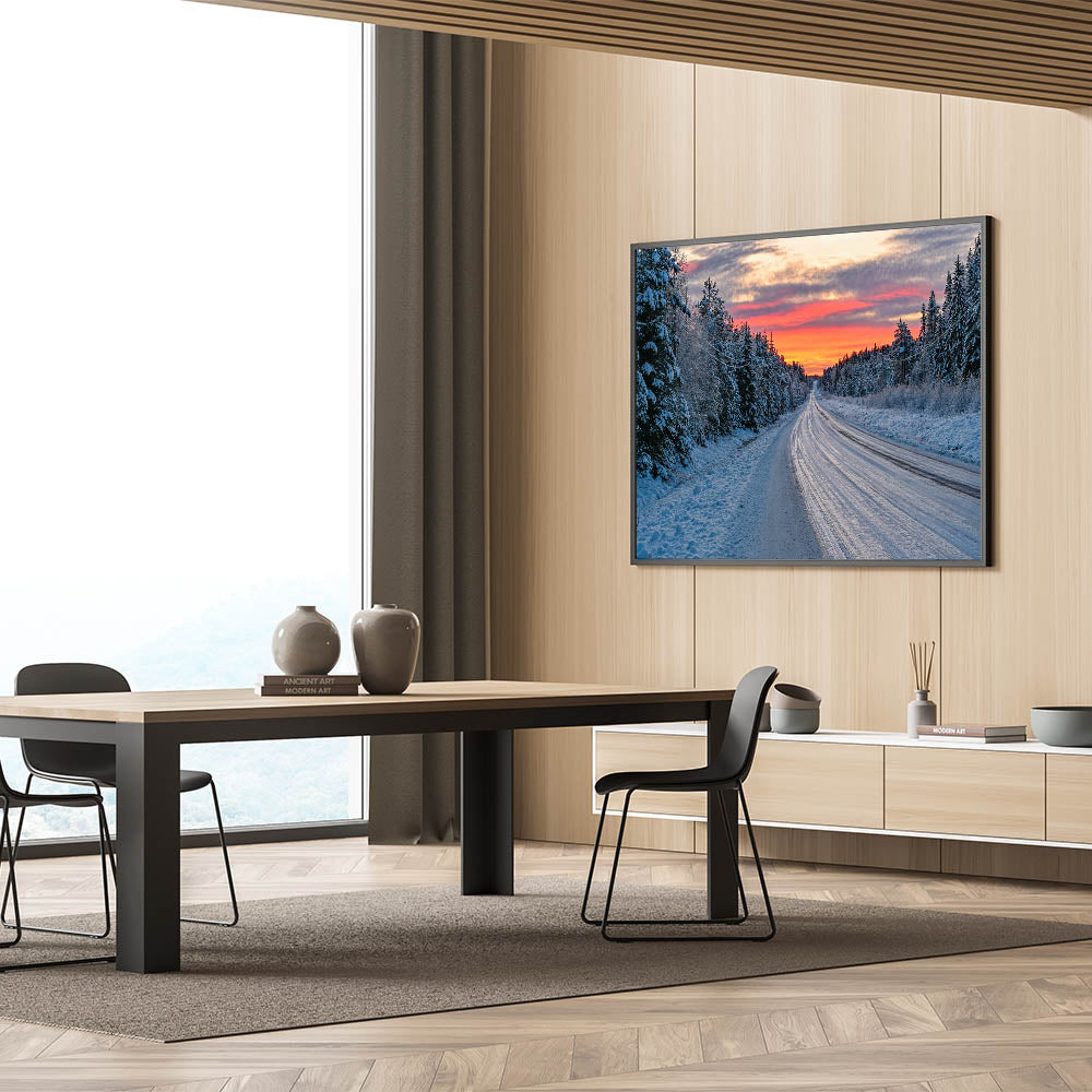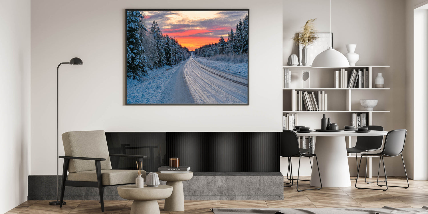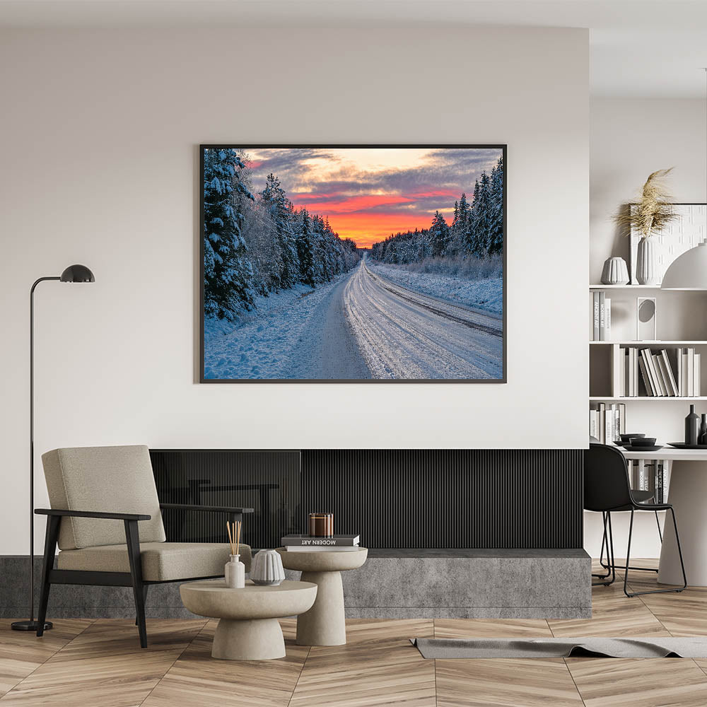 Embrace the serenity of Sweden's winter beauty with this breathtaking Nordic Scenery Art featuring a snowy road stretching into the sunset. The vibrant colors of the sky contrast beautifully with the soft whites of the snow-covered trees, making this artwork the perfect addition to any home or office space.
