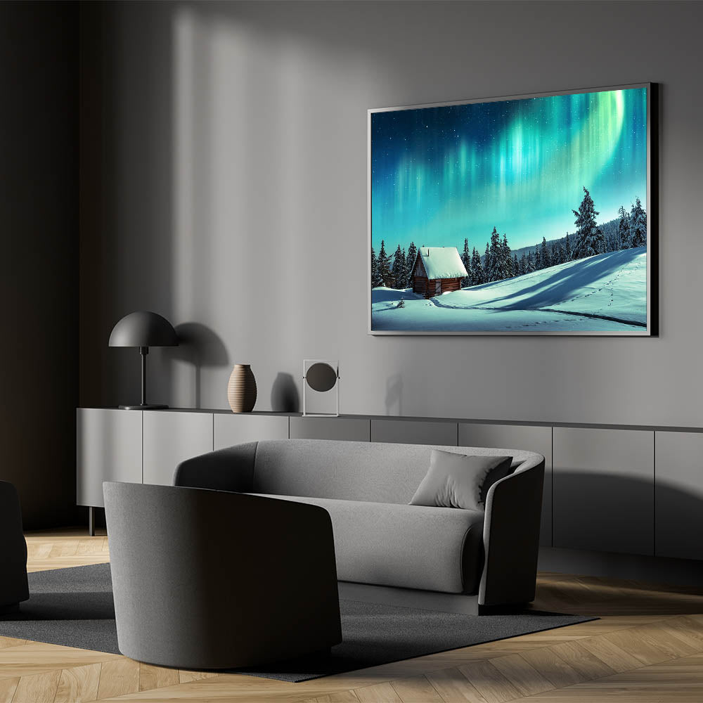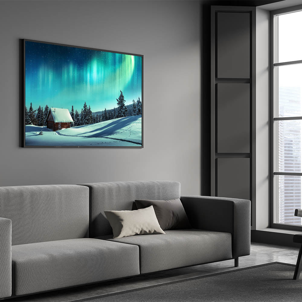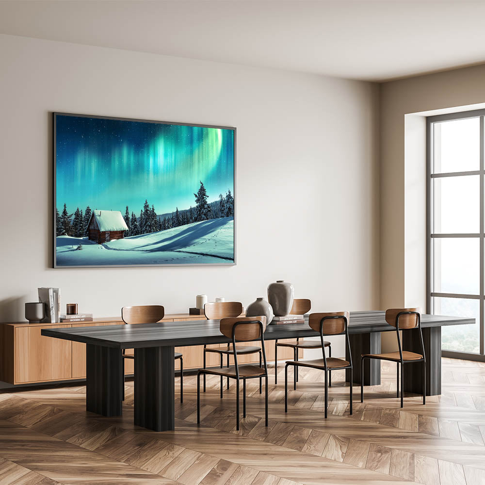 • The vibrant aurora and the peaceful snow cabin create a calming and atmospheric focal point for any room.