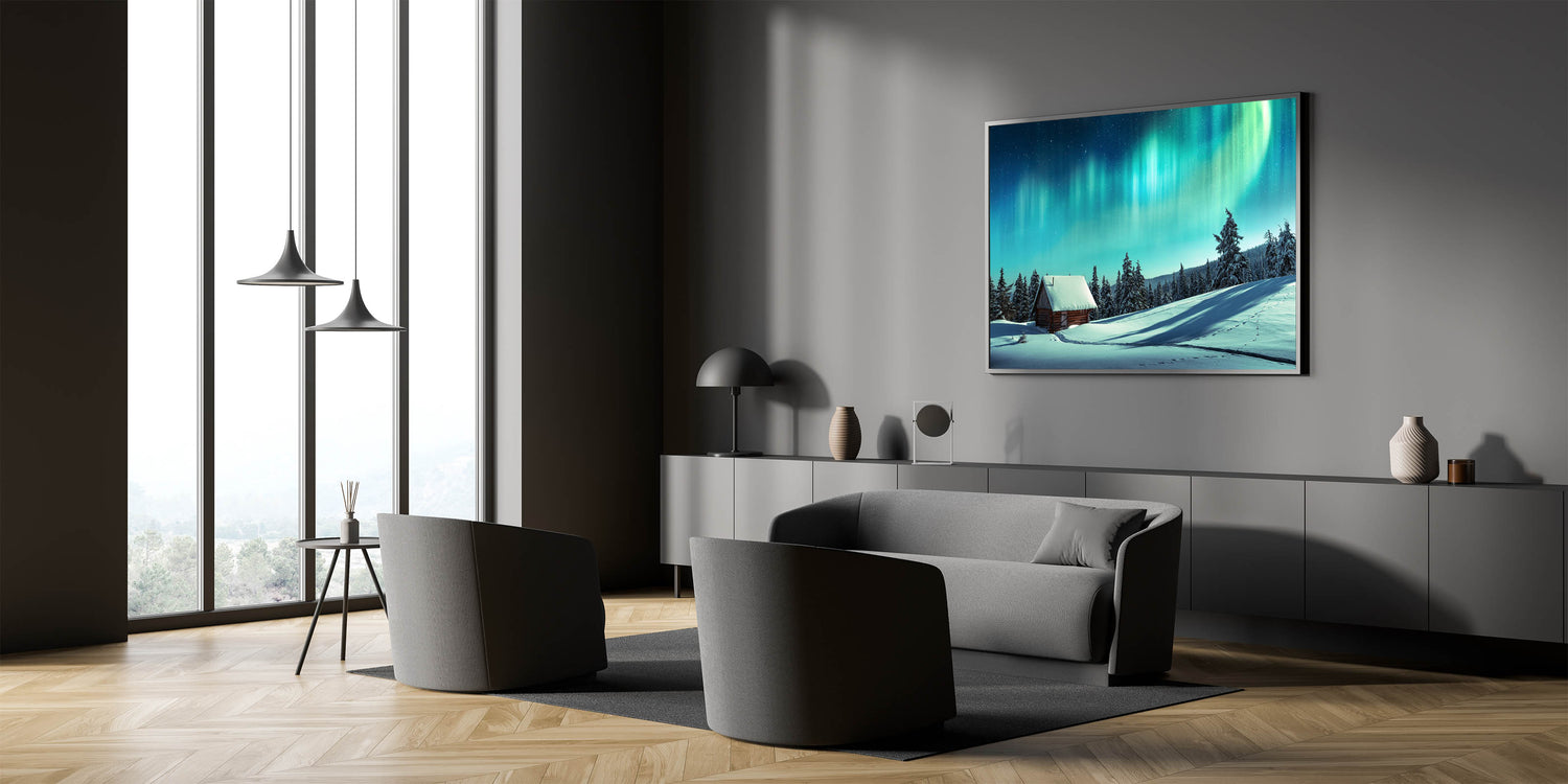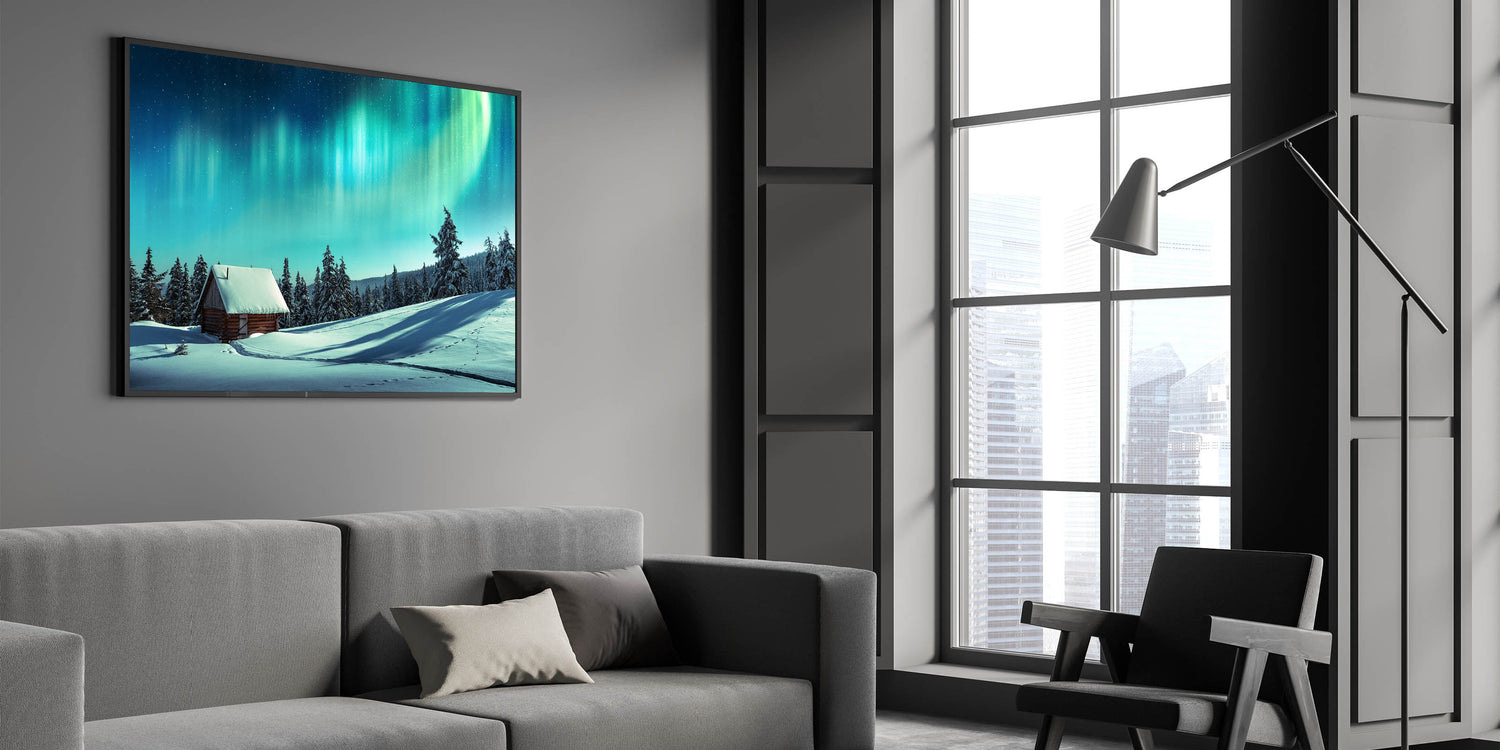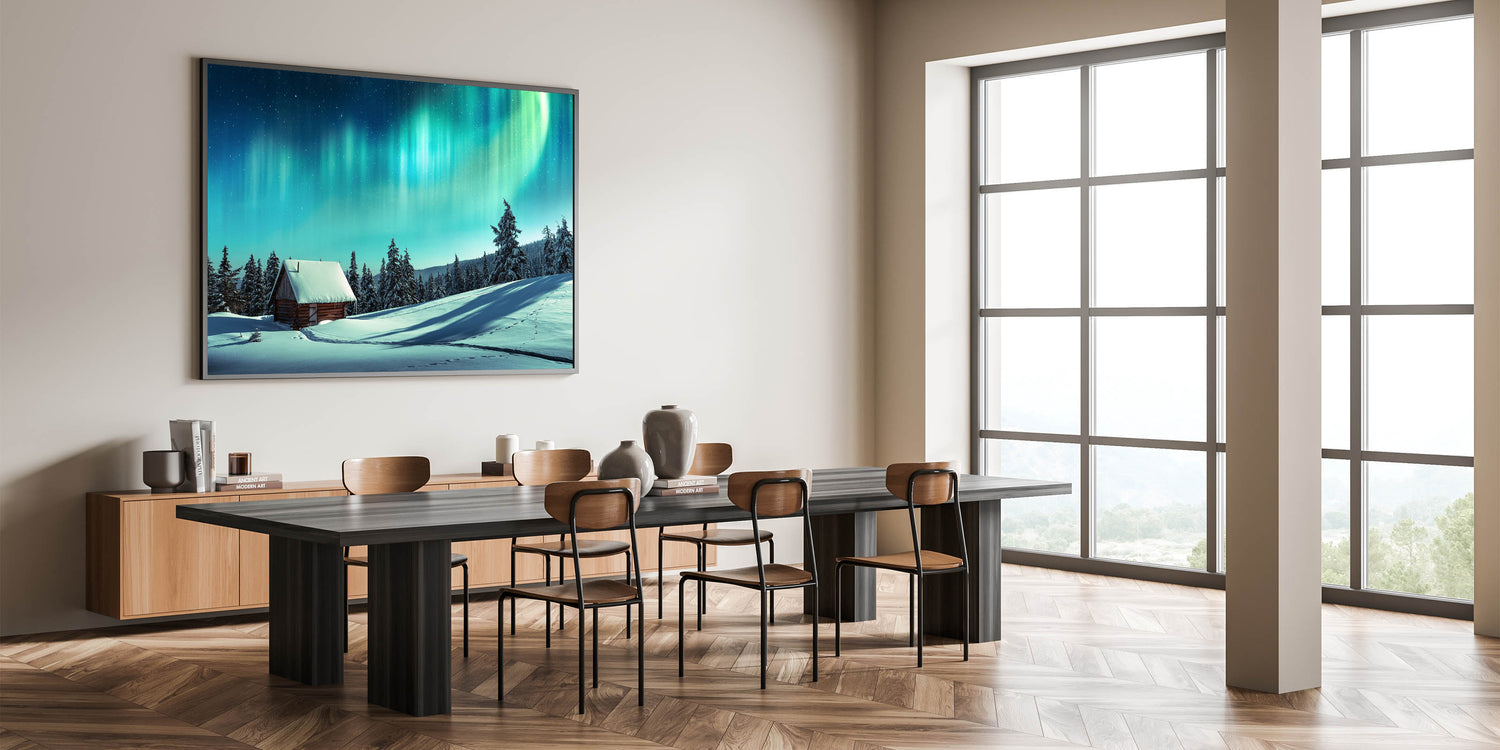 • The vibrant aurora and the peaceful snow cabin create a calming and atmospheric focal point for any room.