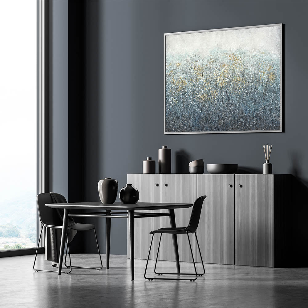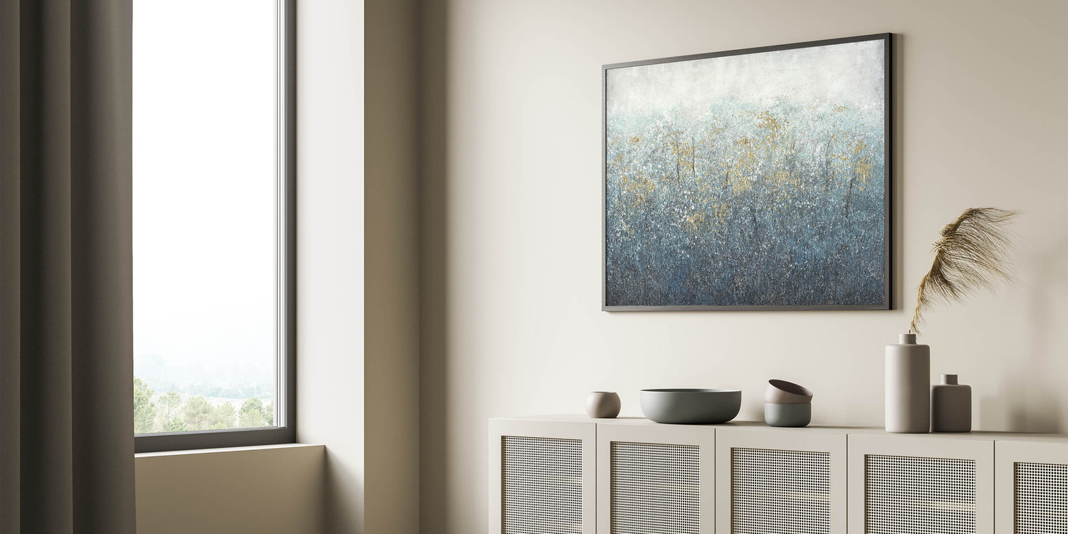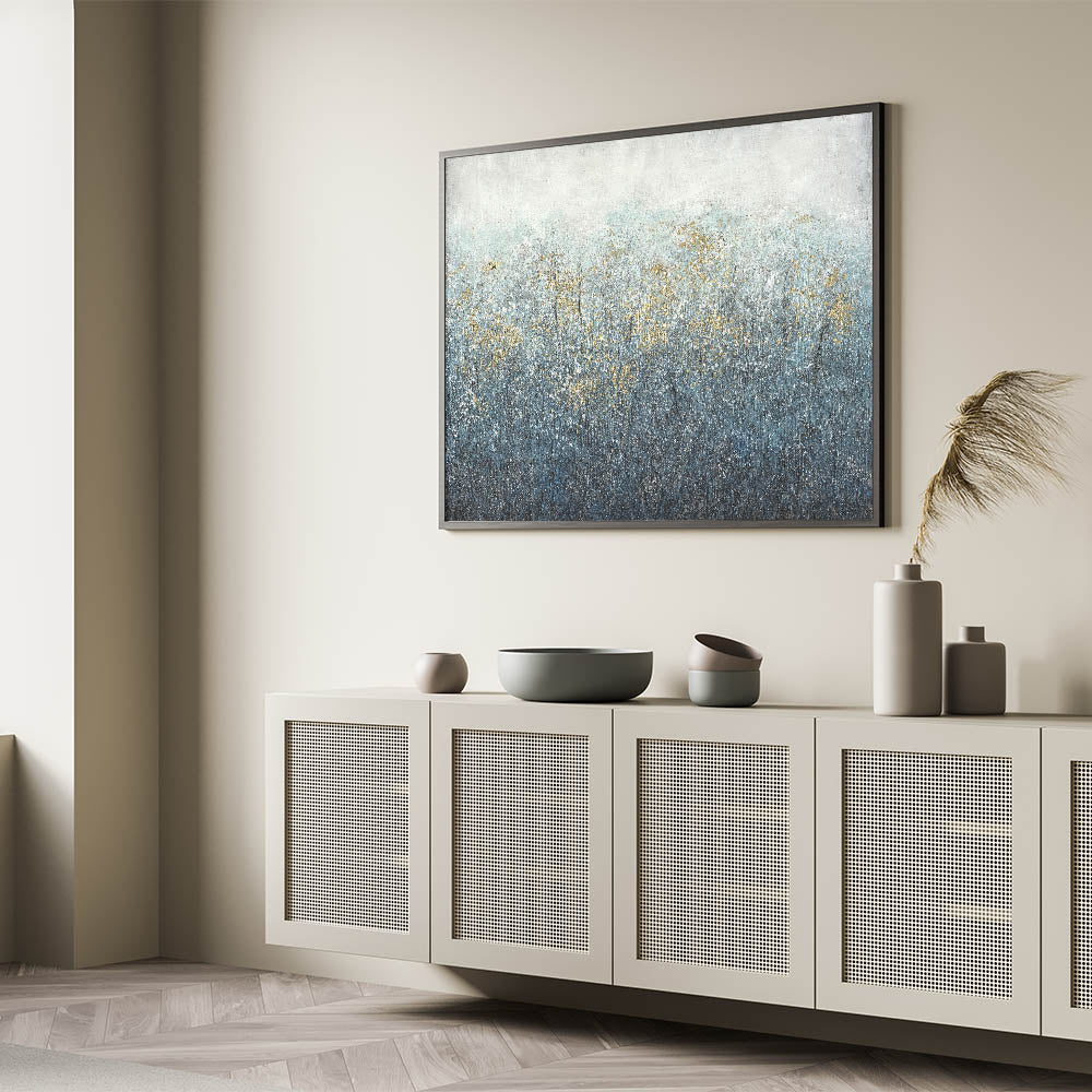 Create a serene and peaceful atmosphere in your home with this serene landscape artwork, featuring a delicate fusion of muted blue, white, and gold tones. This breathtaking tranquil nature scene portrays a dreamy floral field bathed in soft golden light, evoking a sense of calm and relaxation. Whether displayed in your living room, bedroom, or office, this peaceful countryside print will transform your space into a haven of tranquility.