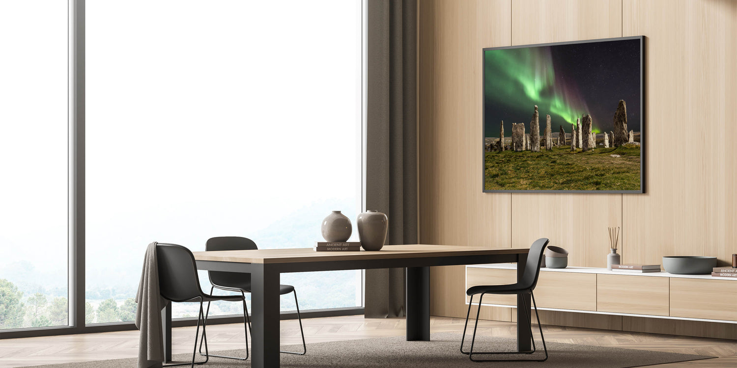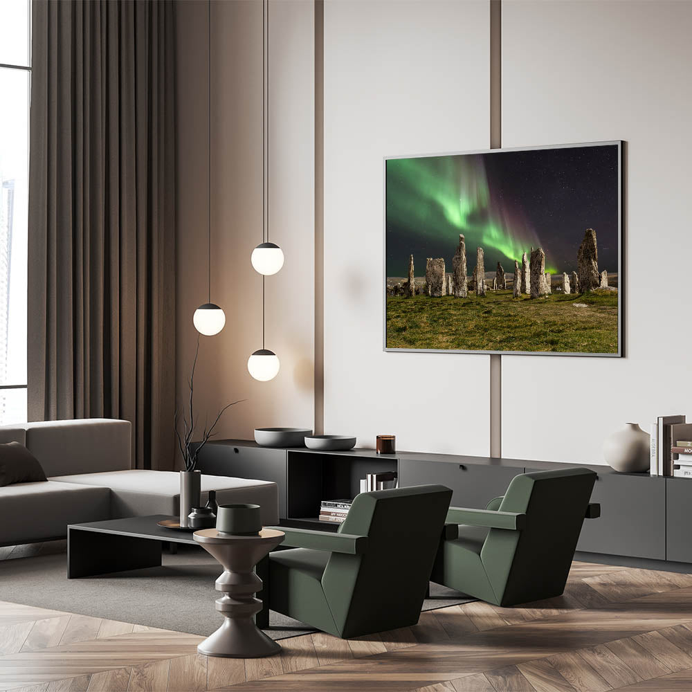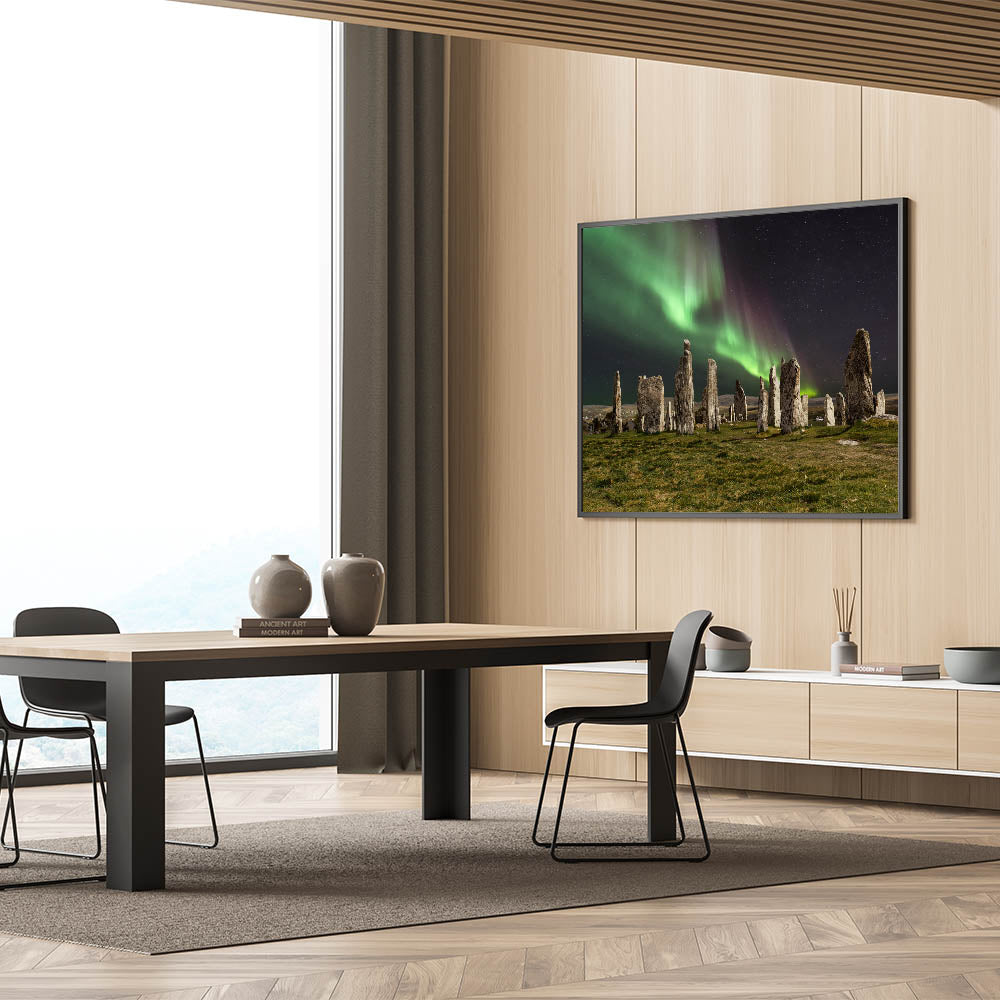 This awe-inspiring Scottish Landscape Art captures the mystical beauty of the Northern Lights dancing above the ancient Standing Stones of Callanish. The vivid green auroras paint the night sky, creating a mesmerizing contrast with the weathered stones below. This artwork brings together the magical wonders of Scotland's natural and historical landmarks, making it a perfect piece for those who love both Scotland’s iconic landmarks and its stunning landscapes.