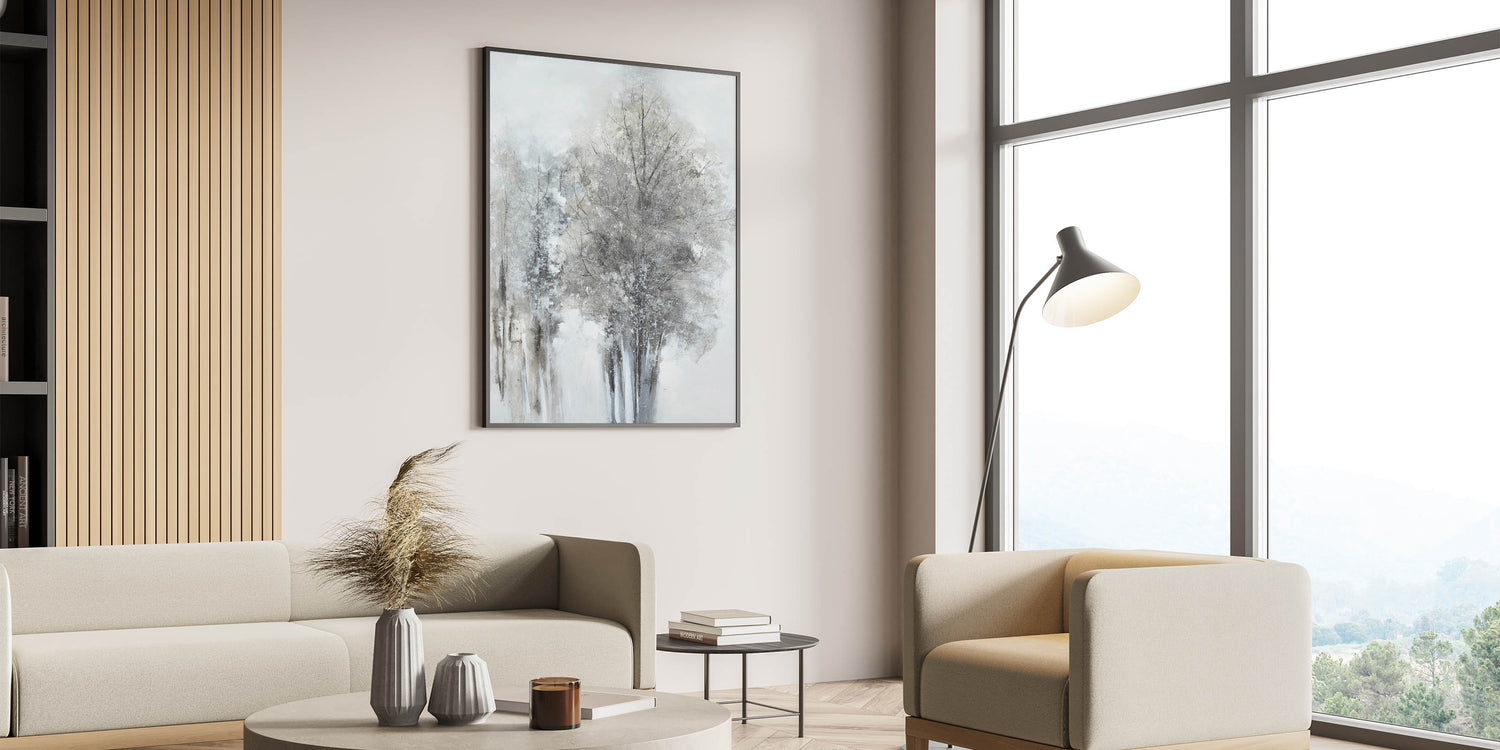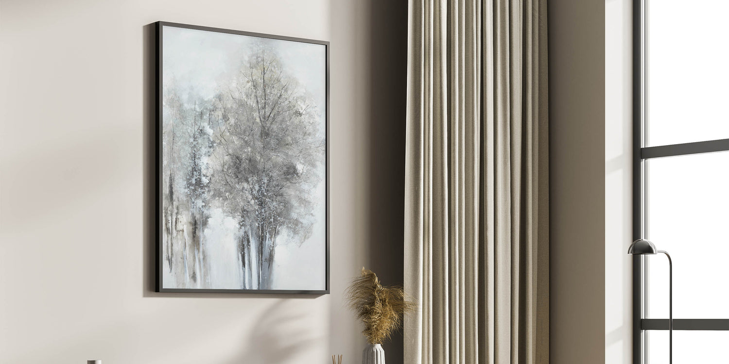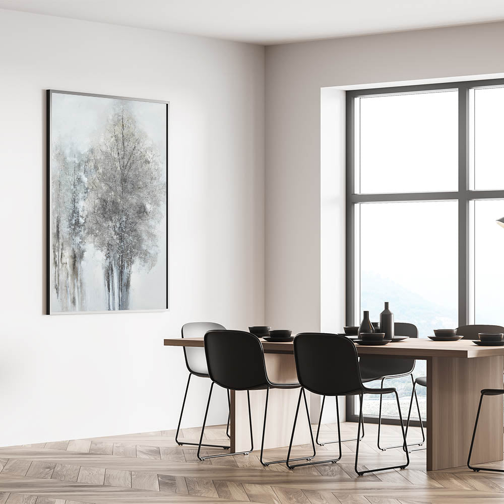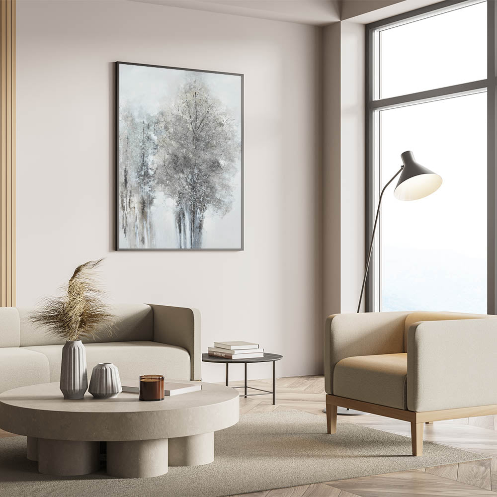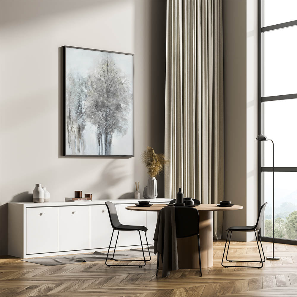 Bring a sense of calm and elegance to your space with this serene landscape photography print, showcasing a delicate winter forest in soft grays, whites, and muted browns. The misty, abstract effect creates tranquil nature scenes, capturing the beauty of a peaceful snowfall. The subtle texture and ethereal brushwork make this a timeless calming forest landscape for any home or office.
