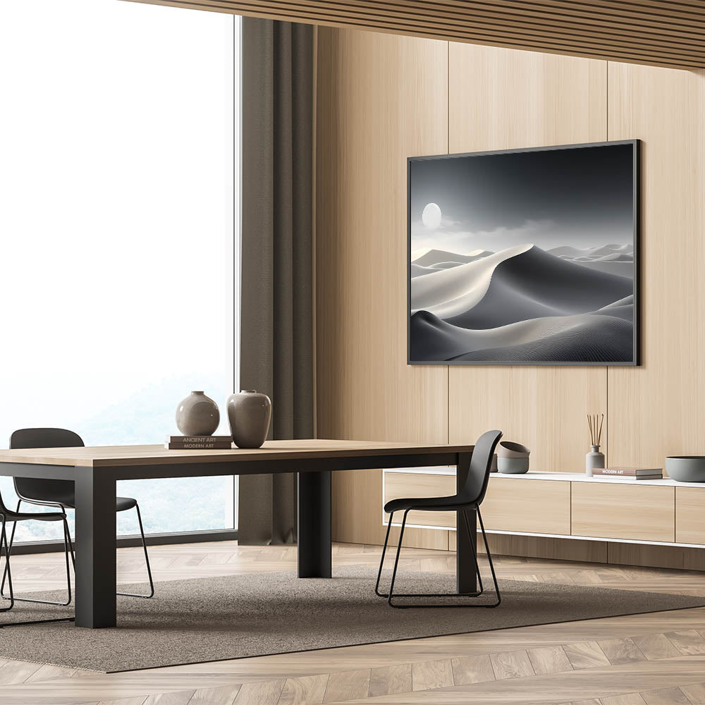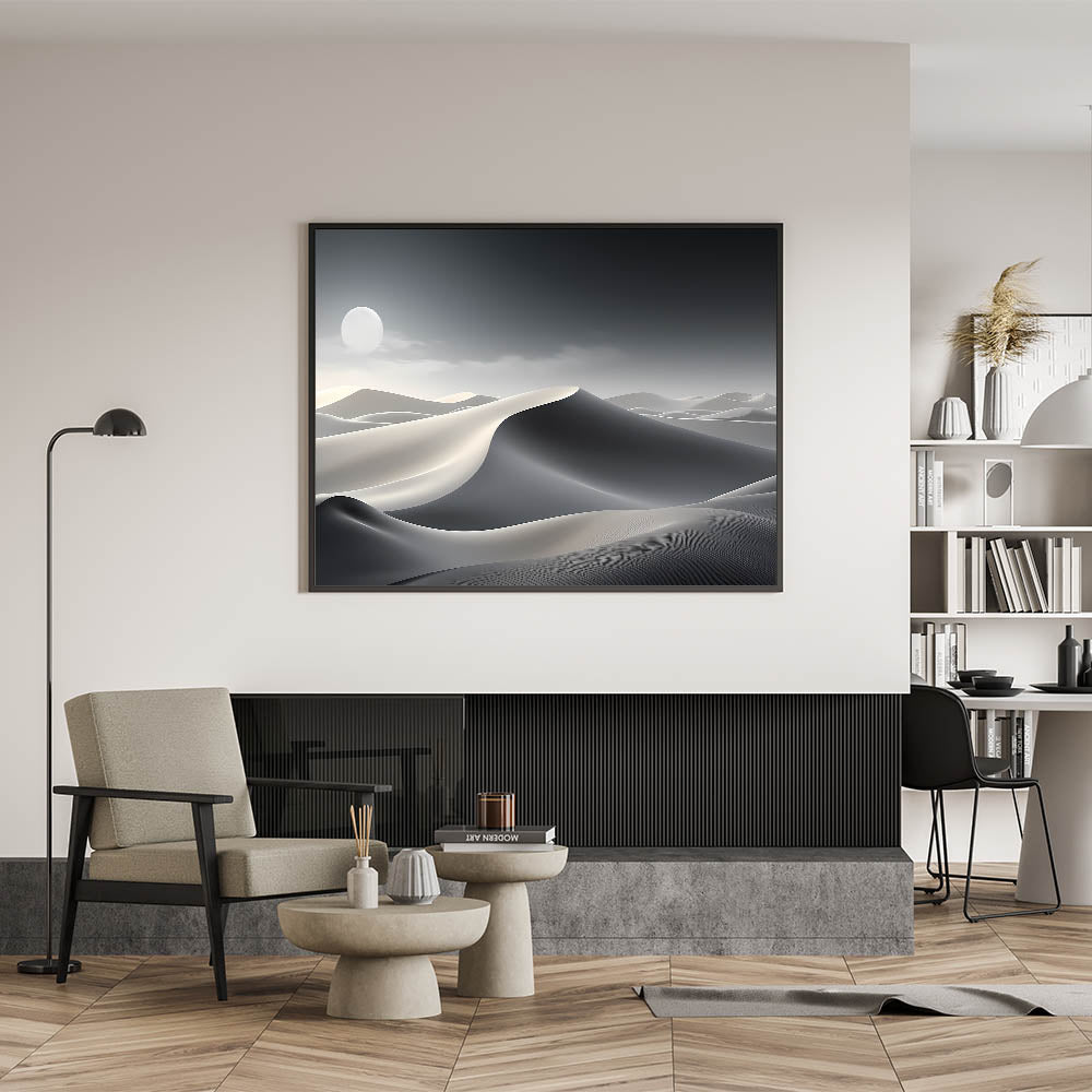 Transform your space with the ethereal beauty of this serene lunar dune wall art, capturing a dreamy desert landscape bathed in soft, muted grays under a luminous moon. The gentle curves of the sand dunes and the calm, monochromatic palette create a tranquil atmosphere, perfect for bringing a sense of peace and quiet reflection to any room.