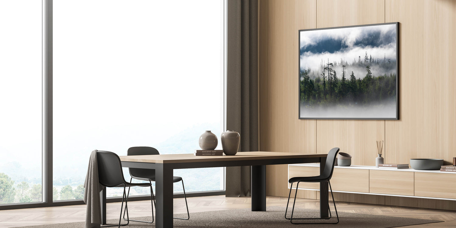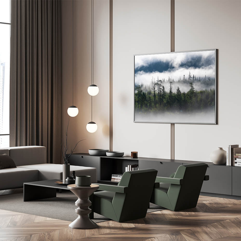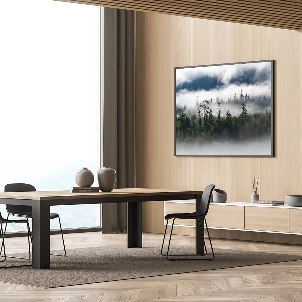 Transform your living space with the calming beauty of this Misty Landscape Art, capturing the ethereal essence of a foggy morning in a serene forest setting. The delicate mist that envelops the towering trees creates a tranquil atmosphere, perfect for adding a touch of nature’s quietude to any room.