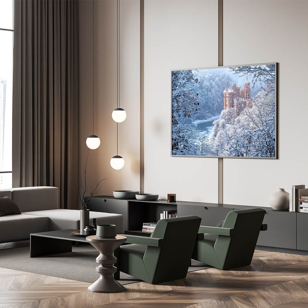 Step into a magical winter wonderland with this enchanting castle wall art, featuring a majestic castle surrounded by snow-covered trees and serene, frosty landscapes. The soft whites and delicate blues create a peaceful atmosphere, making this artwork a perfect centerpiece for your decor. This breathtaking view captures the timeless charm of medieval European castles, transporting you to a world of elegance and tranquility.