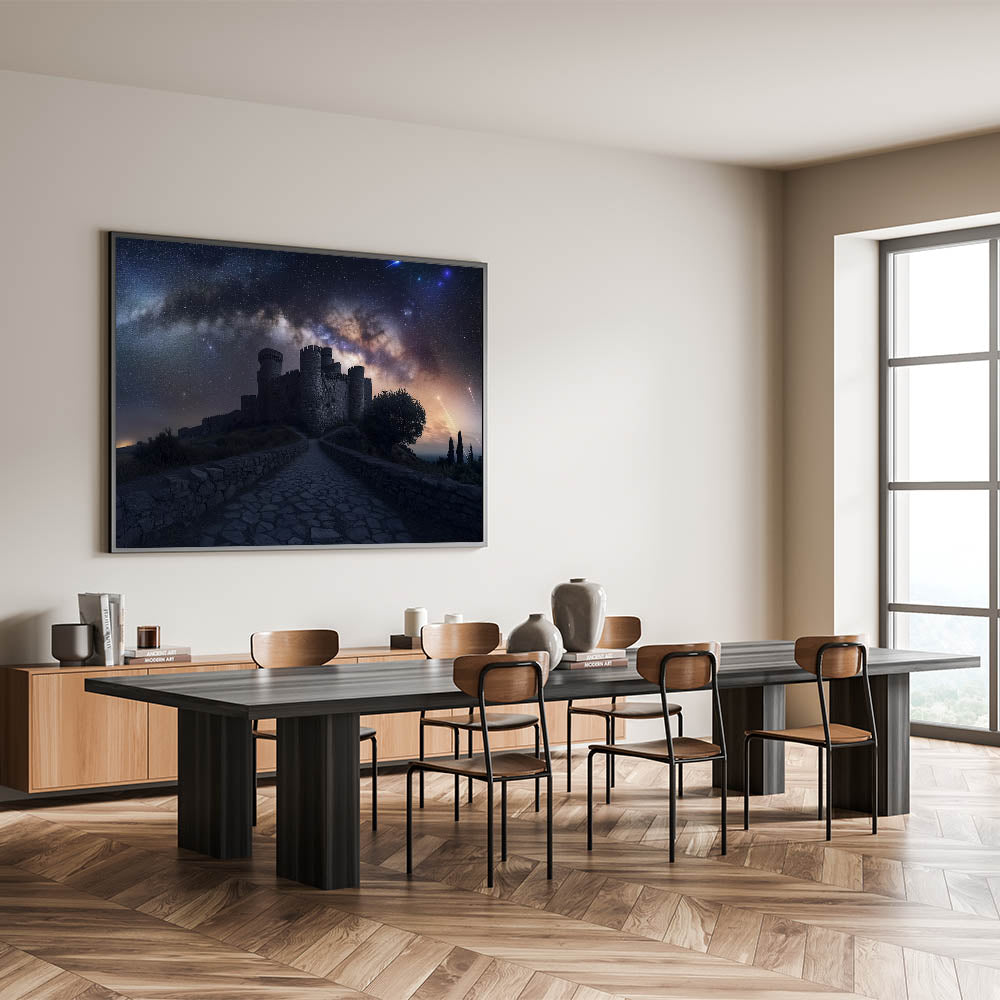Transport yourself to a world of wonder with this starlit castle artwork, featuring a mystical medieval fortress illuminated under the breathtaking Milky Way. The winding stone pathway leading to the castle adds depth and intrigue, while the starry night sky creates an ethereal backdrop. This stunning castle art print is perfect for lovers of history, astronomy, and scenic landscapes, combining the beauty of medieval architecture with the magic of the cosmos.