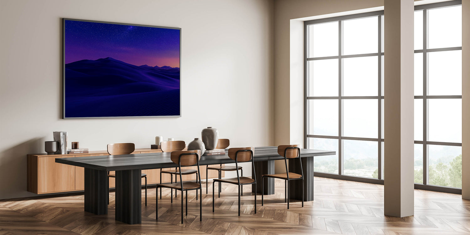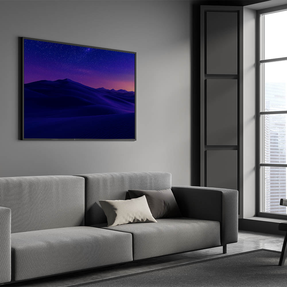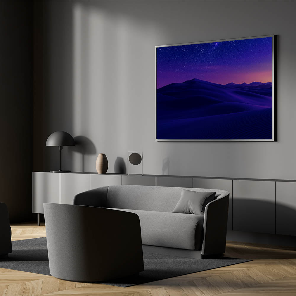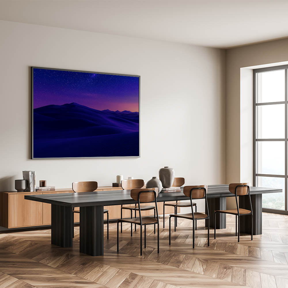 Bring the enchanting beauty of the desert into your home with Starlit Desert Night Wall Art. This captivating artwork features gently rolling sand dunes bathed in deep purple hues under a sparkling night sky, creating an atmosphere of serenity and wonder. A perfect example of desert scenery prints, it is ideal for adding a touch of mystery and elegance to any space.
