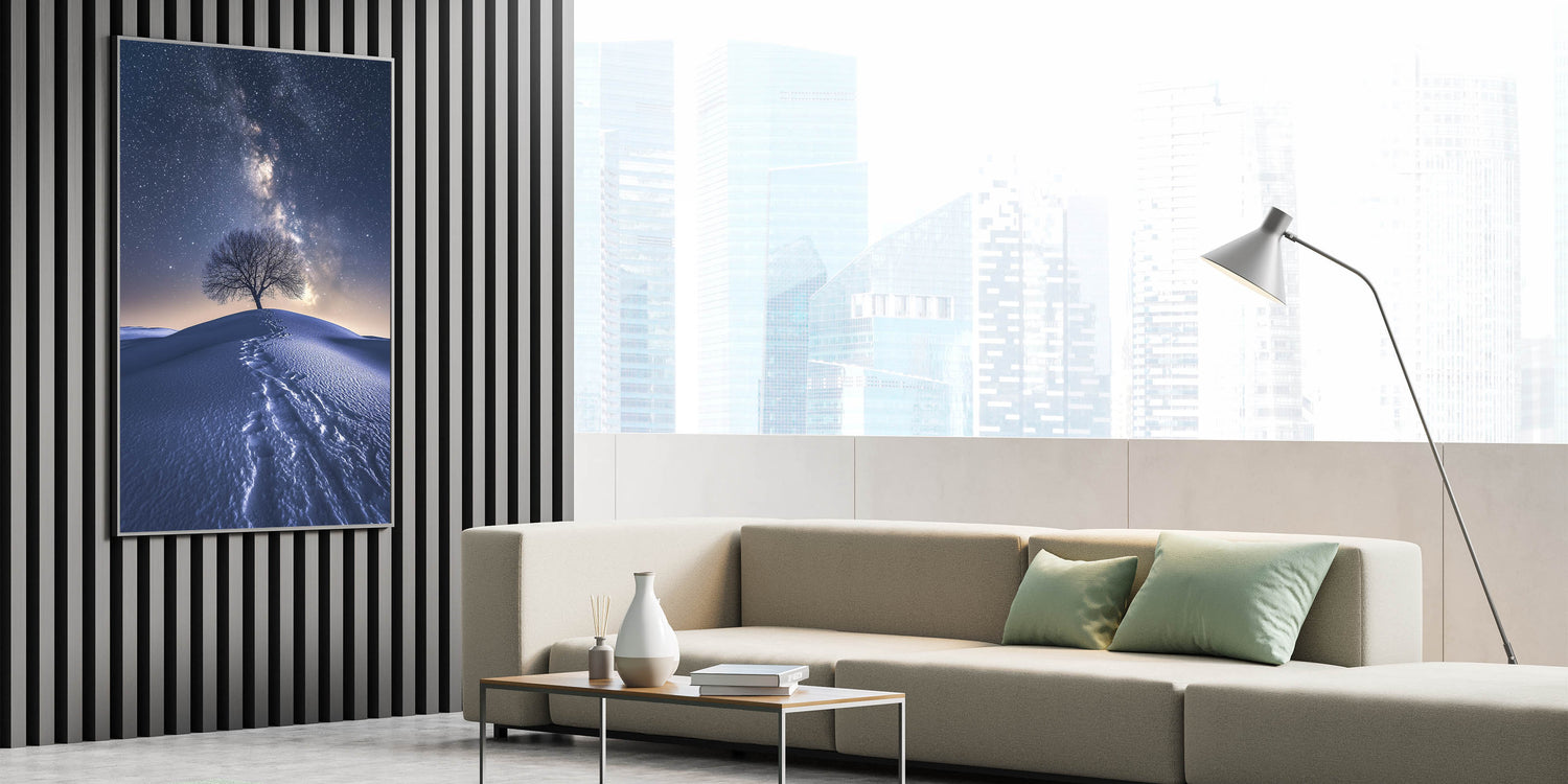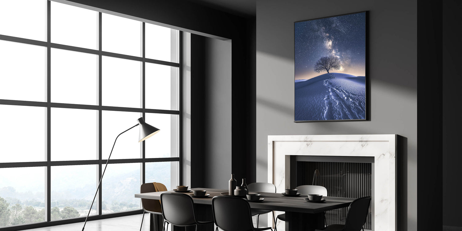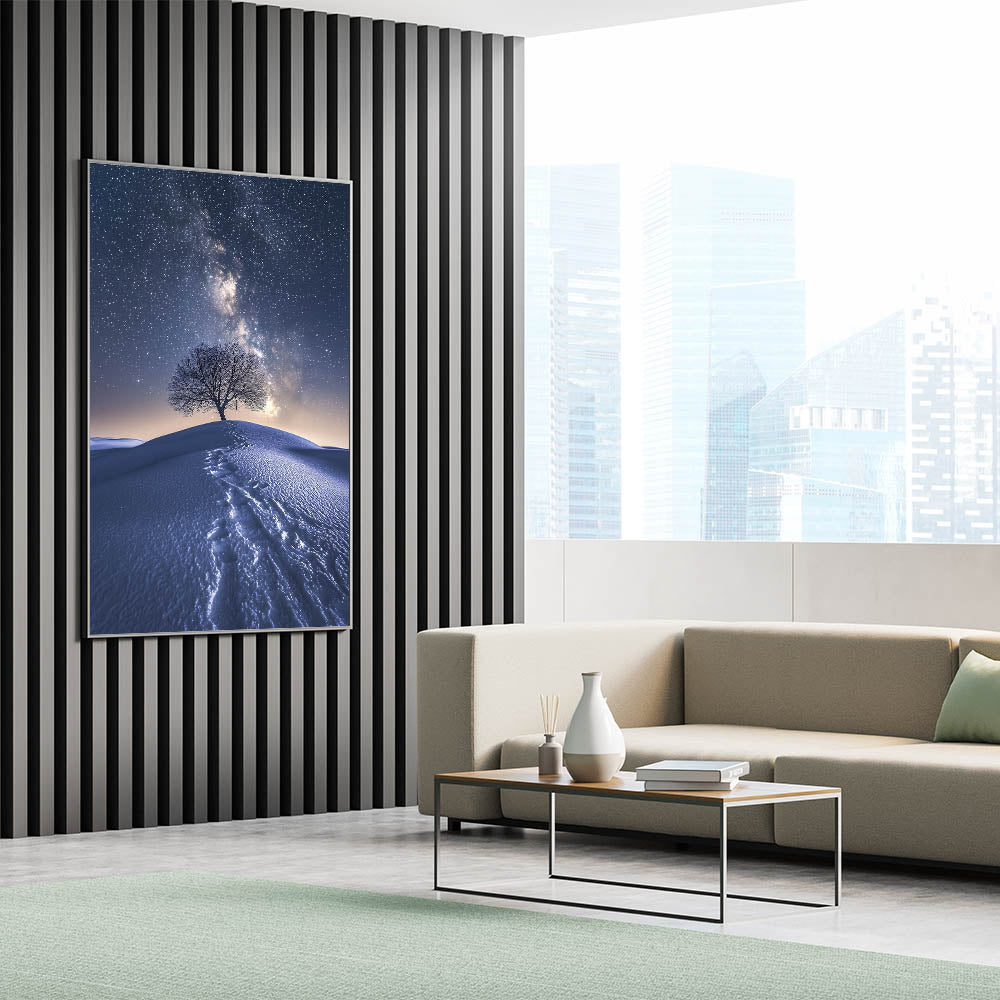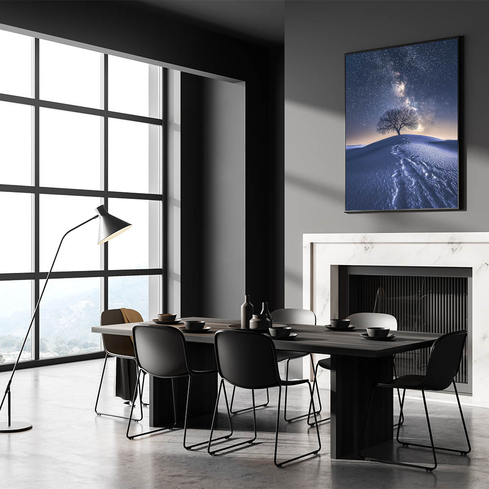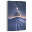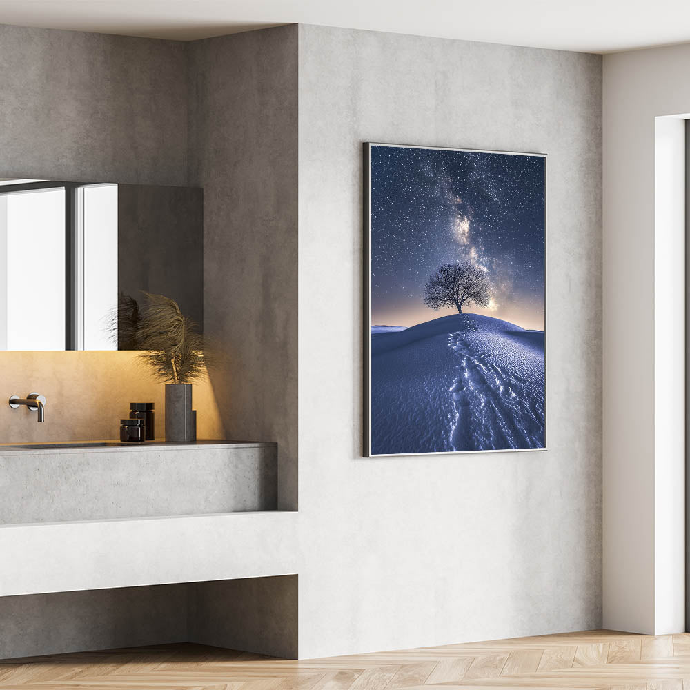 Immerse yourself in the tranquil beauty of a starry winter night with this stunning artwork. Featuring a solitary tree standing on a snow-covered hill, framed by a dazzling Milky Way sky, this piece captures the serene majesty of nature. The crisp snow trails leading to the tree add depth and invite the viewer into the scene, making it a perfect centerpiece for any modern decor.