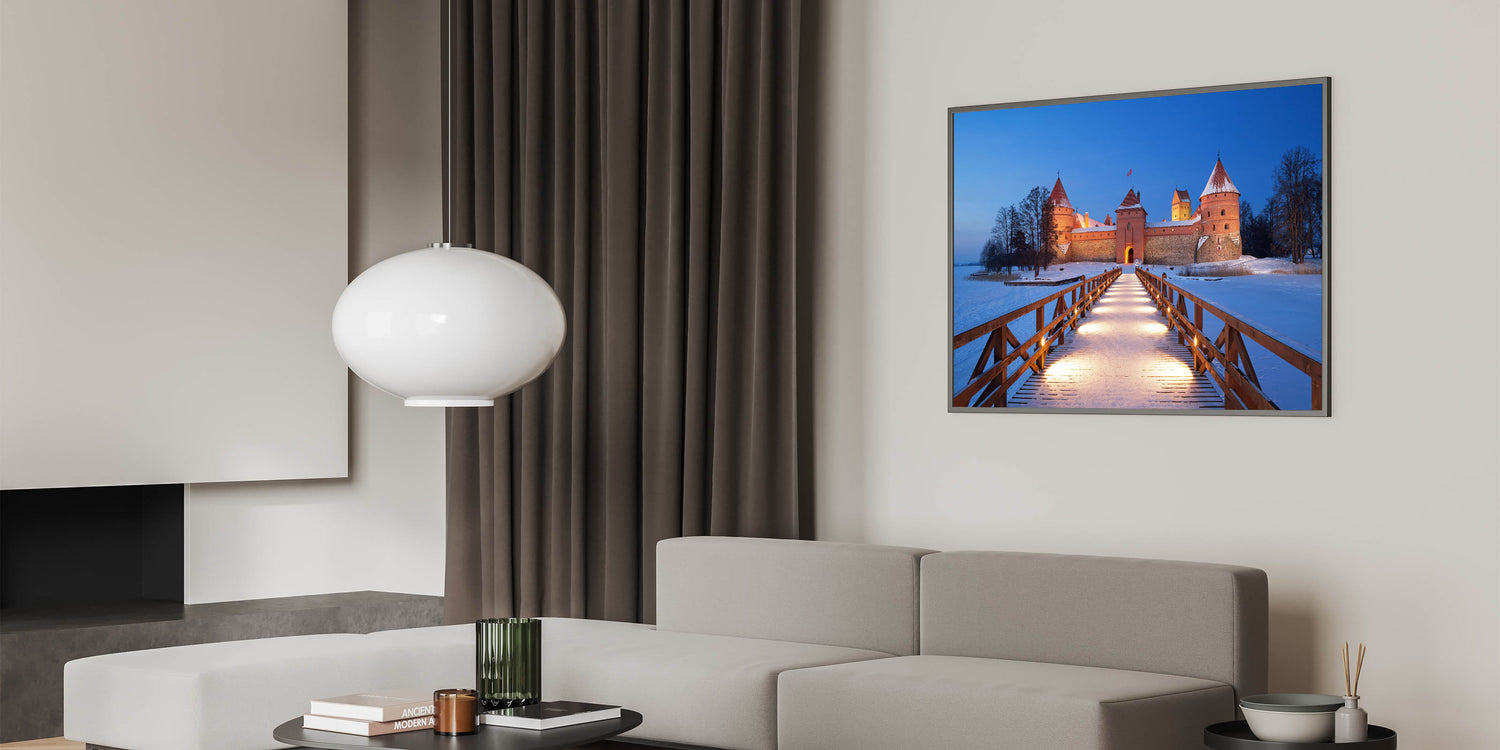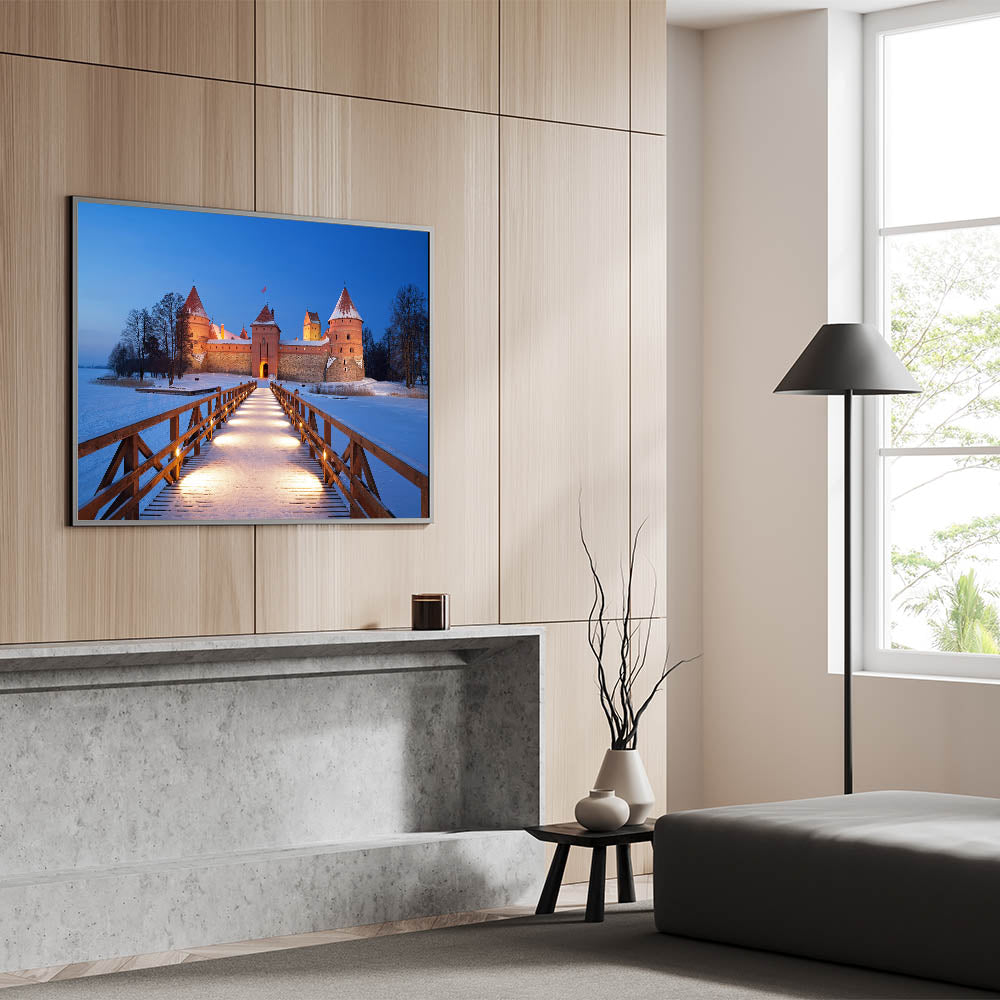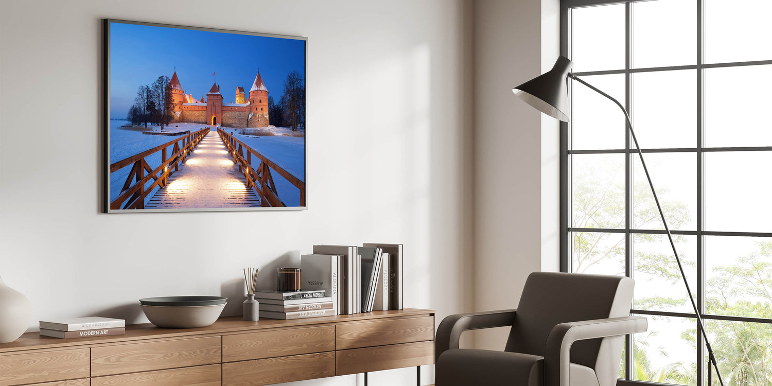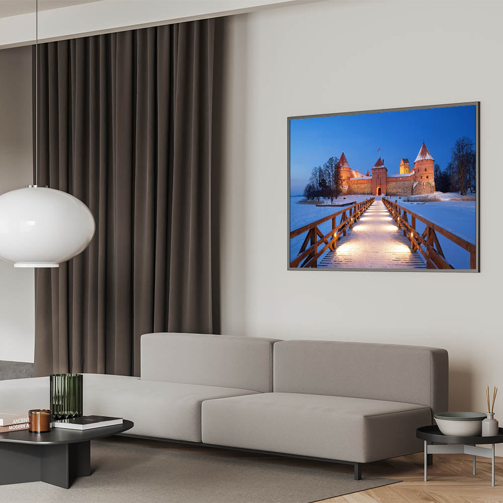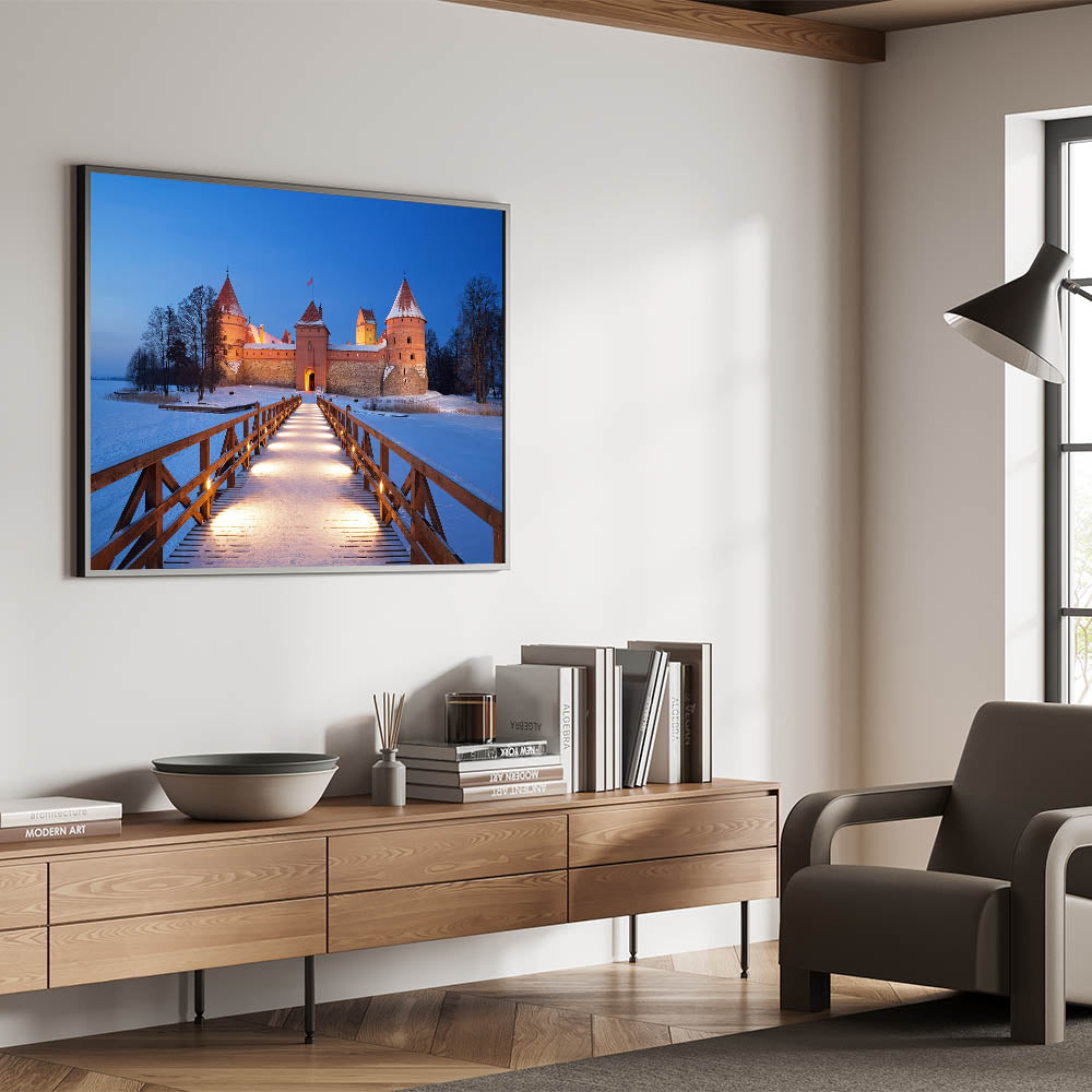 Experience the enchanting beauty of Lithuania with this stunning wall art featuring Trakai Castle in a serene winter landscape. This breathtaking artwork captures the historic charm of one of Lithuania’s most iconic landmarks, with the majestic castle illuminated against a soft snowy backdrop. Perfect for any room, this piece brings the tranquility and history of Lithuania into your home.
