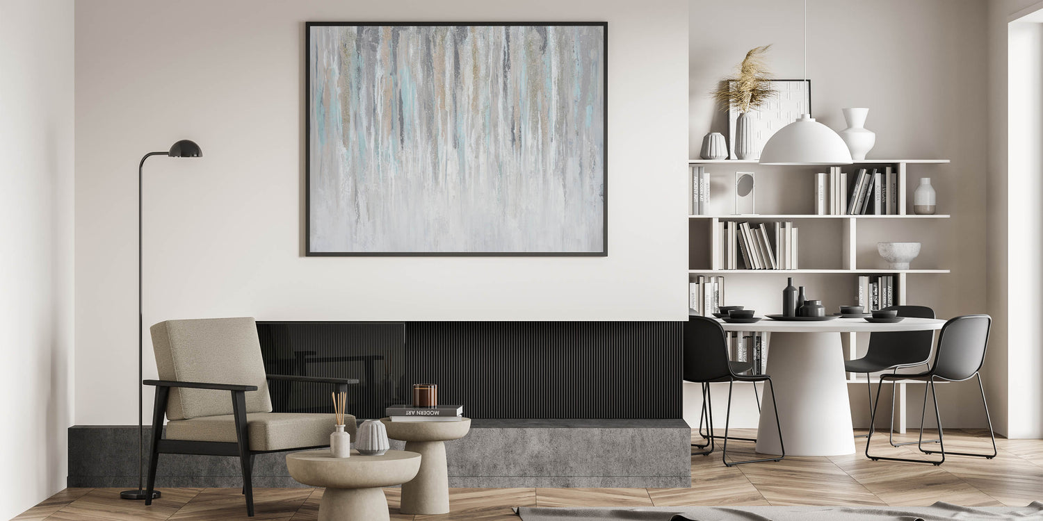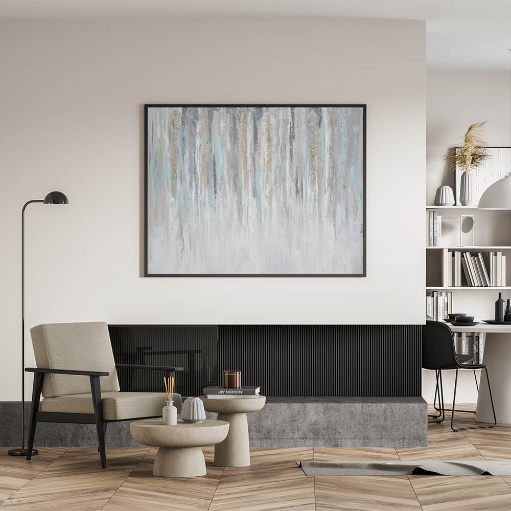 Create a serene and sophisticated ambiance with this tranquil nature canvas print, featuring cascading streaks of white, gray, beige, and muted blue. The fluid brushstrokes and delicate texture mimic soothing mountain views, evoking a peaceful and elegant atmosphere. The shimmering highlights add depth, making this a timeless calming landscape acrylic print perfect for contemporary interiors.