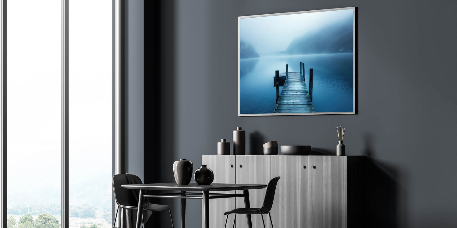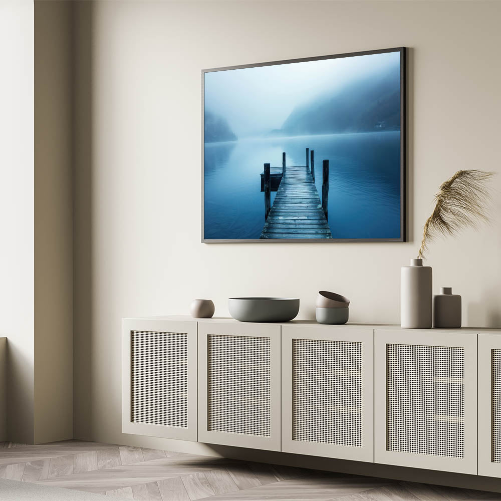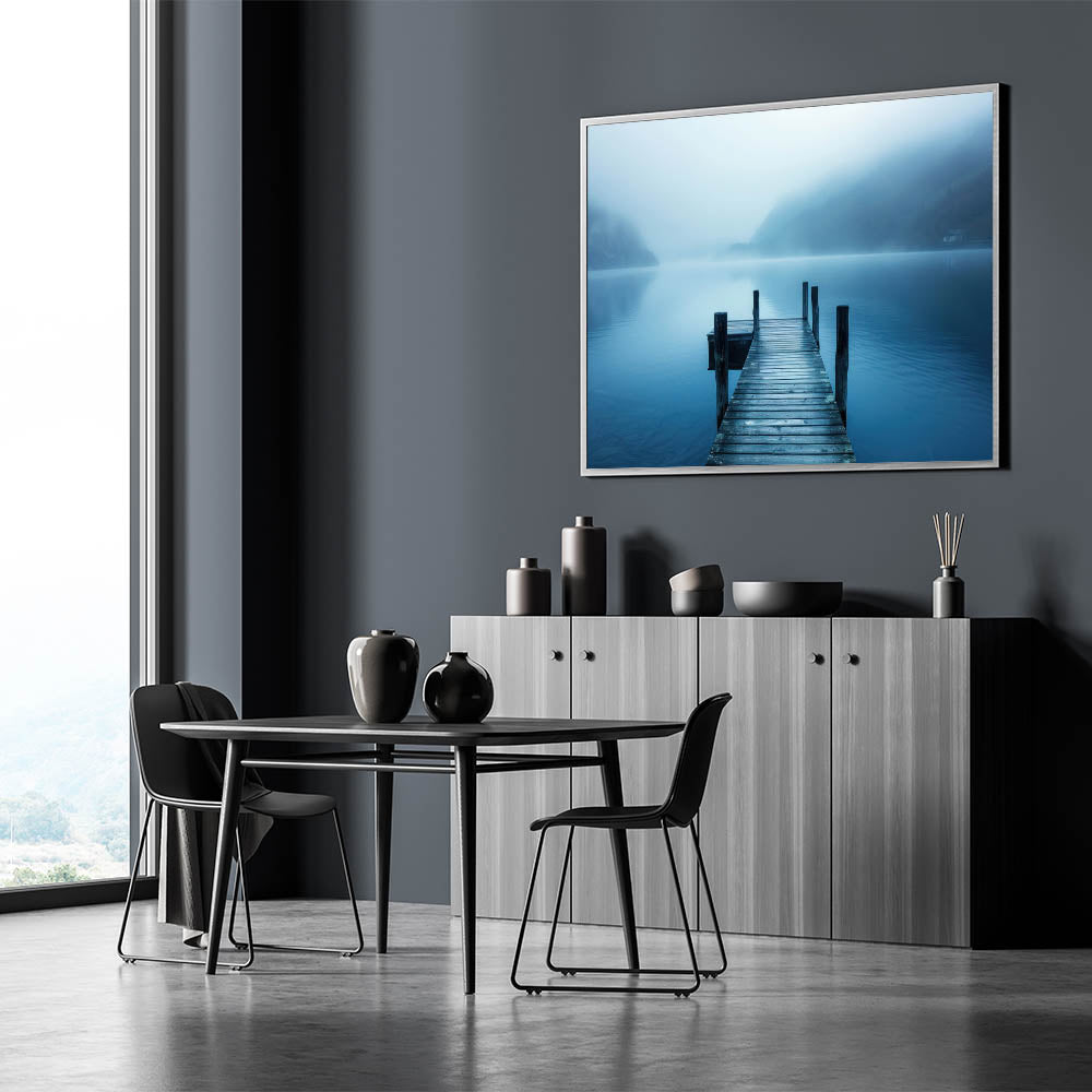Embrace the calm and serenity of Switzerland's peaceful lakes with this breathtaking wall art. This artwork captures a misty morning on a still lake, featuring a solitary wooden dock that stretches into the water, shrouded in a blanket of fog. This tranquil scene evokes a sense of peace and introspection, making it a perfect addition to any room in your home or office where a calming atmosphere is desired.