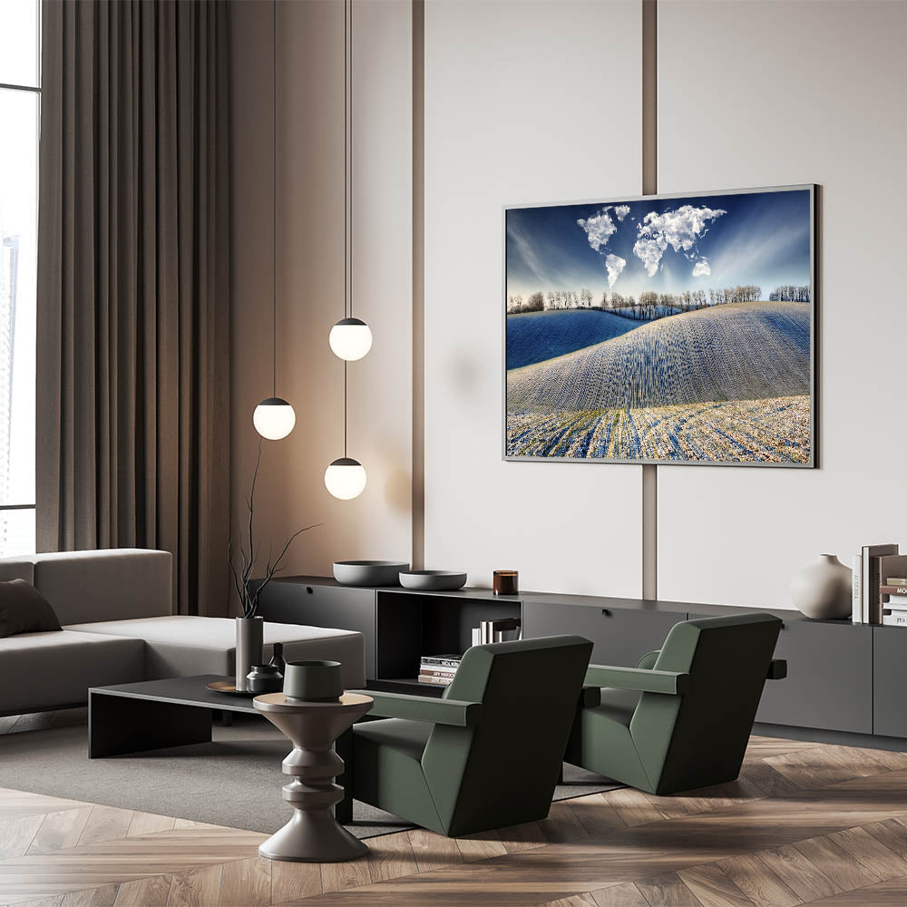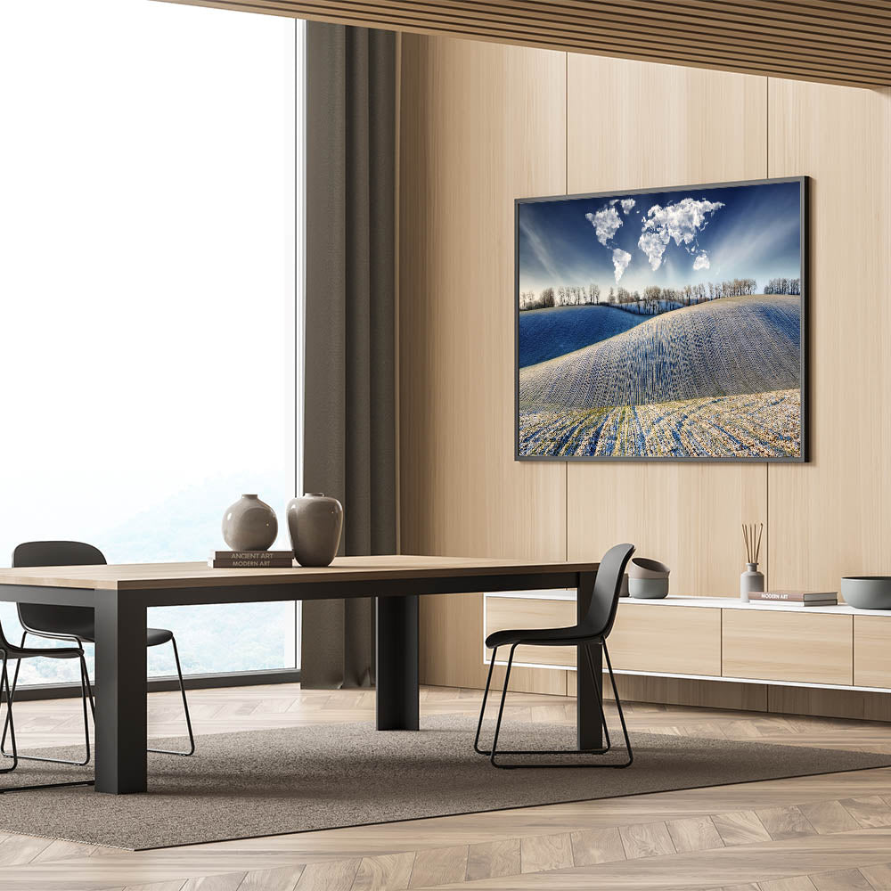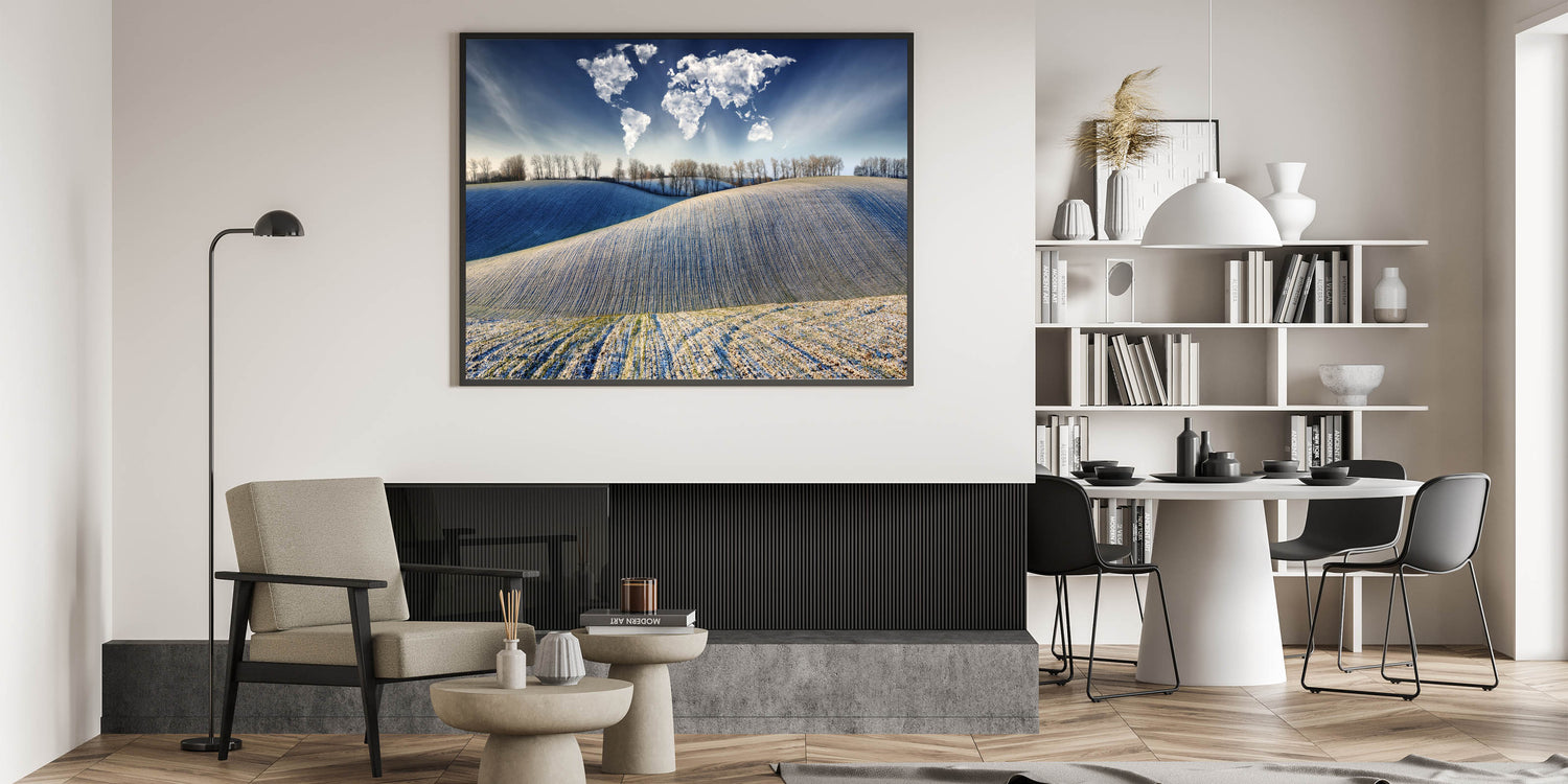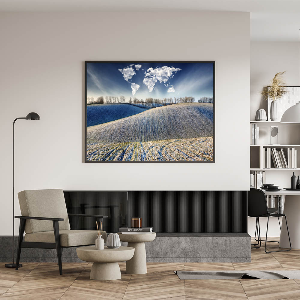 - Artistic depiction of a frosted landscape paired with a cloud world map, offering a creative and thought-provoking touch to your decor.