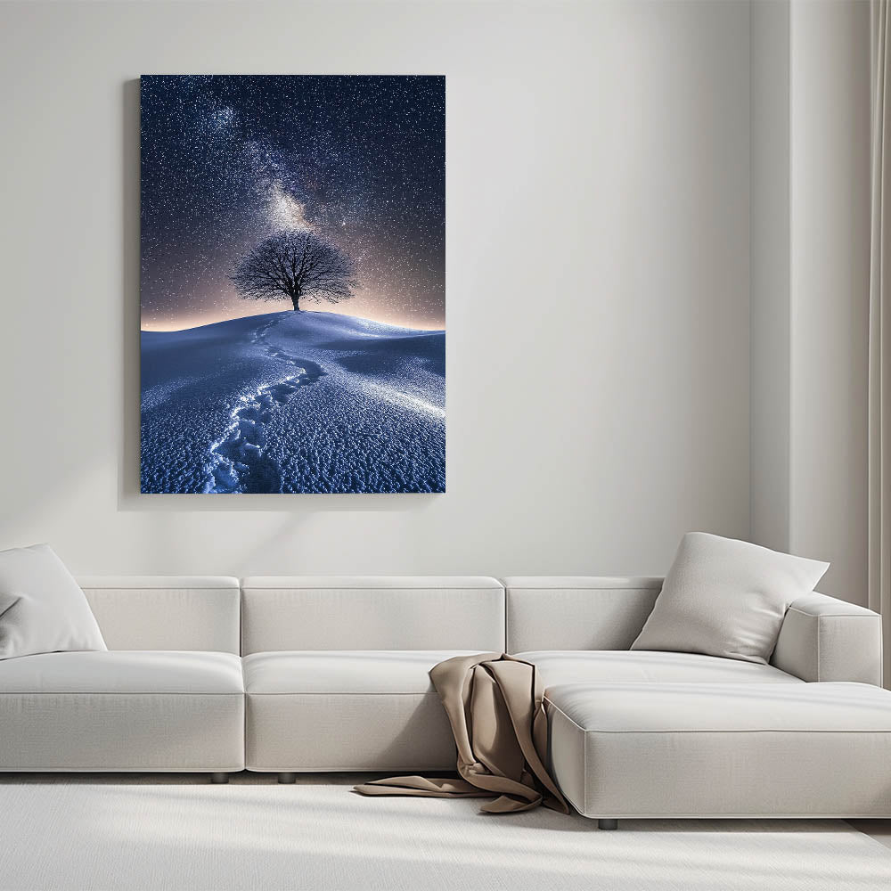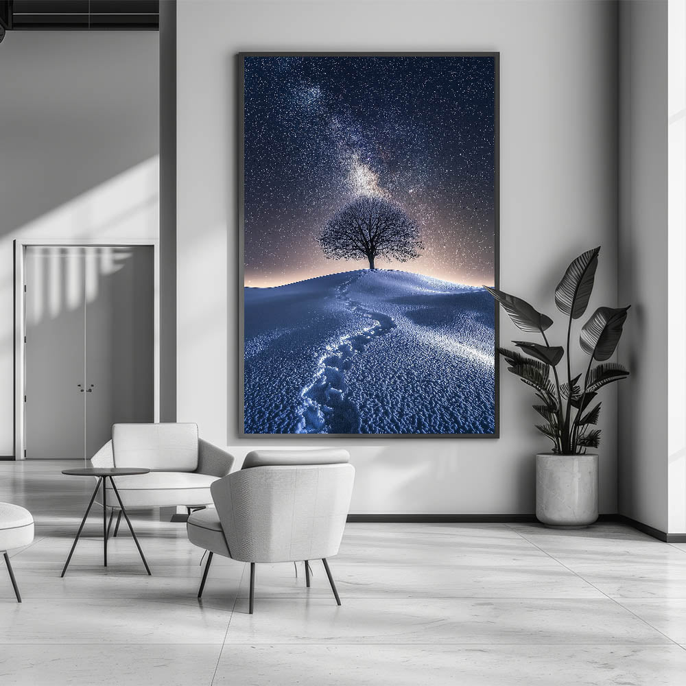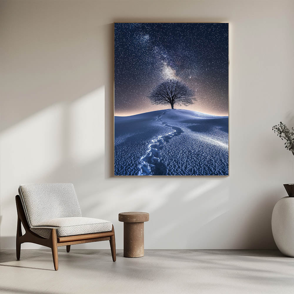 Step into the serene beauty of a winter's night with this captivating artwork. Featuring a lone tree standing atop a snow-covered hill, under a dazzling Milky Way sky, this piece captures the quiet magic of winter landscapes. The soft glow of the stars against the crisp, textured snow creates a striking contrast that adds elegance and tranquility to any space.
