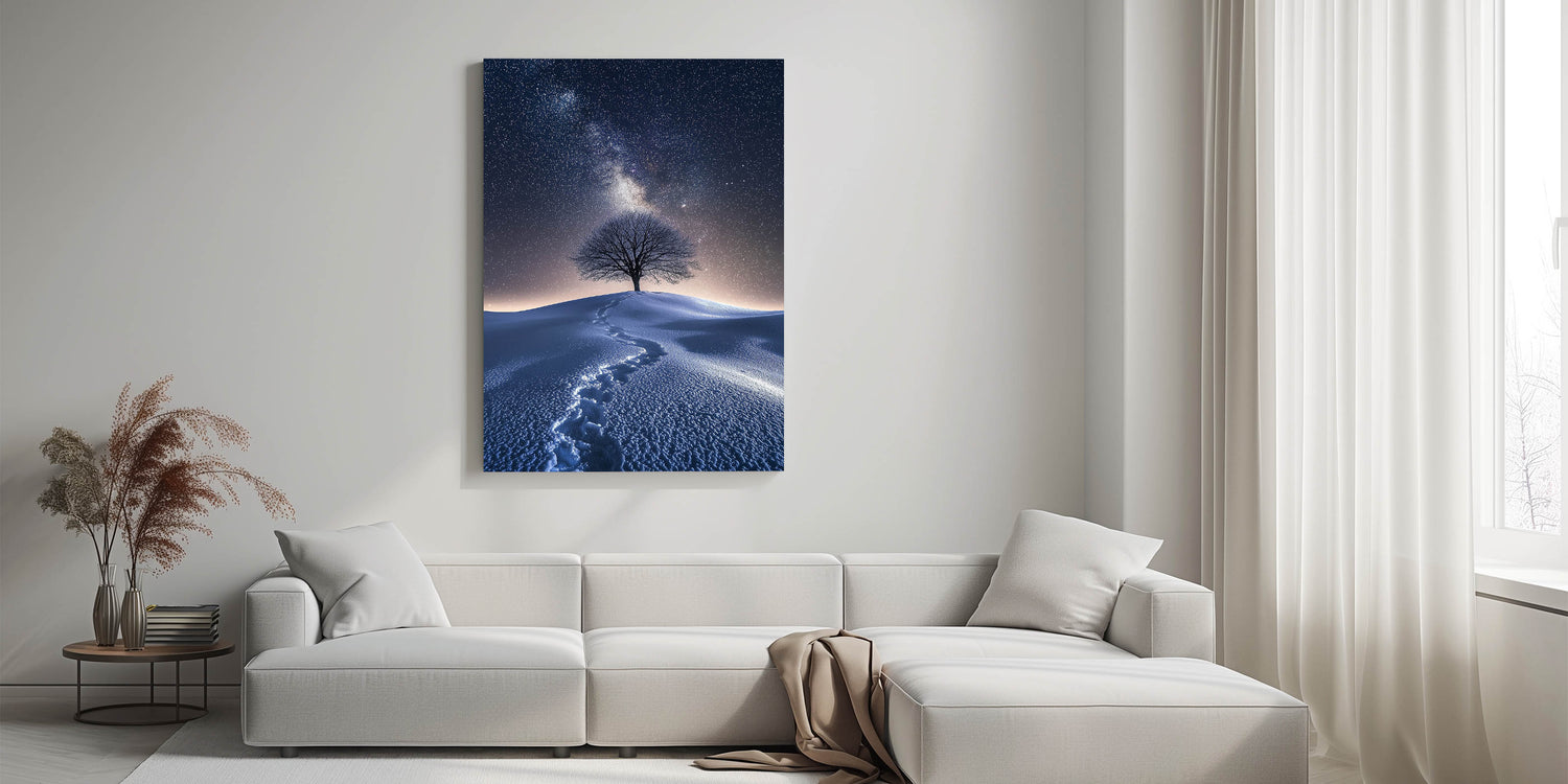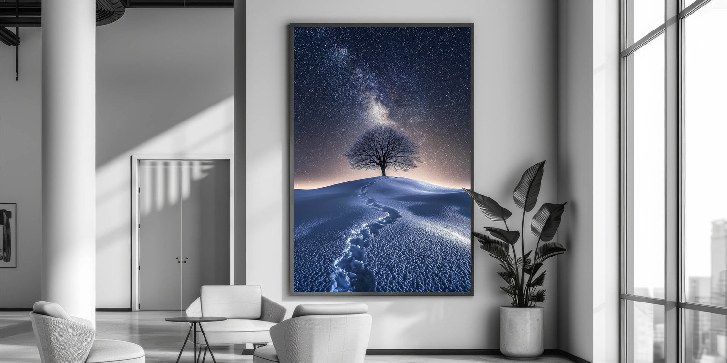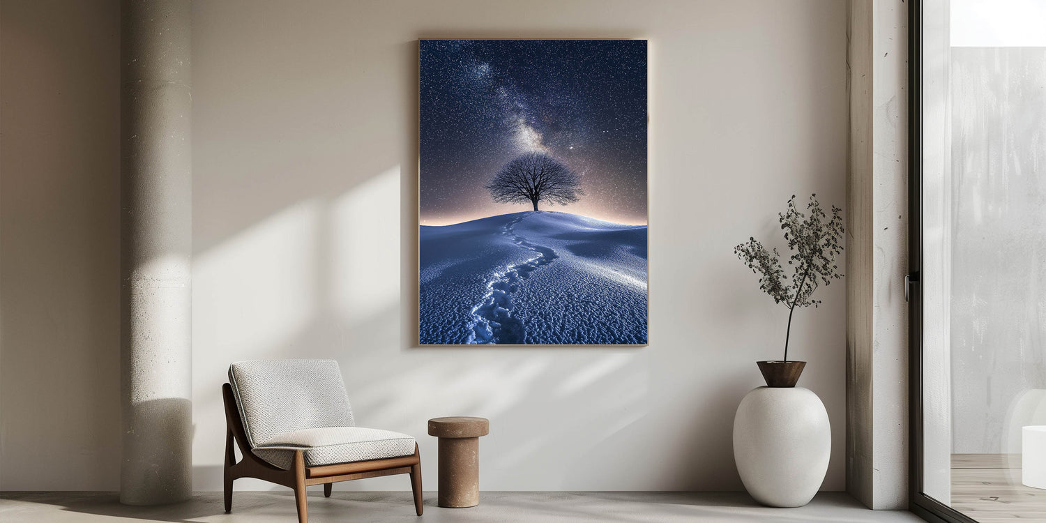 Step into the serene beauty of a winter's night with this captivating artwork. Featuring a lone tree standing atop a snow-covered hill, under a dazzling Milky Way sky, this piece captures the quiet magic of winter landscapes. The soft glow of the stars against the crisp, textured snow creates a striking contrast that adds elegance and tranquility to any space.