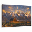 Grand Teton Canvas Print – Rustic Barn and Sunset Over Snowy Peaks