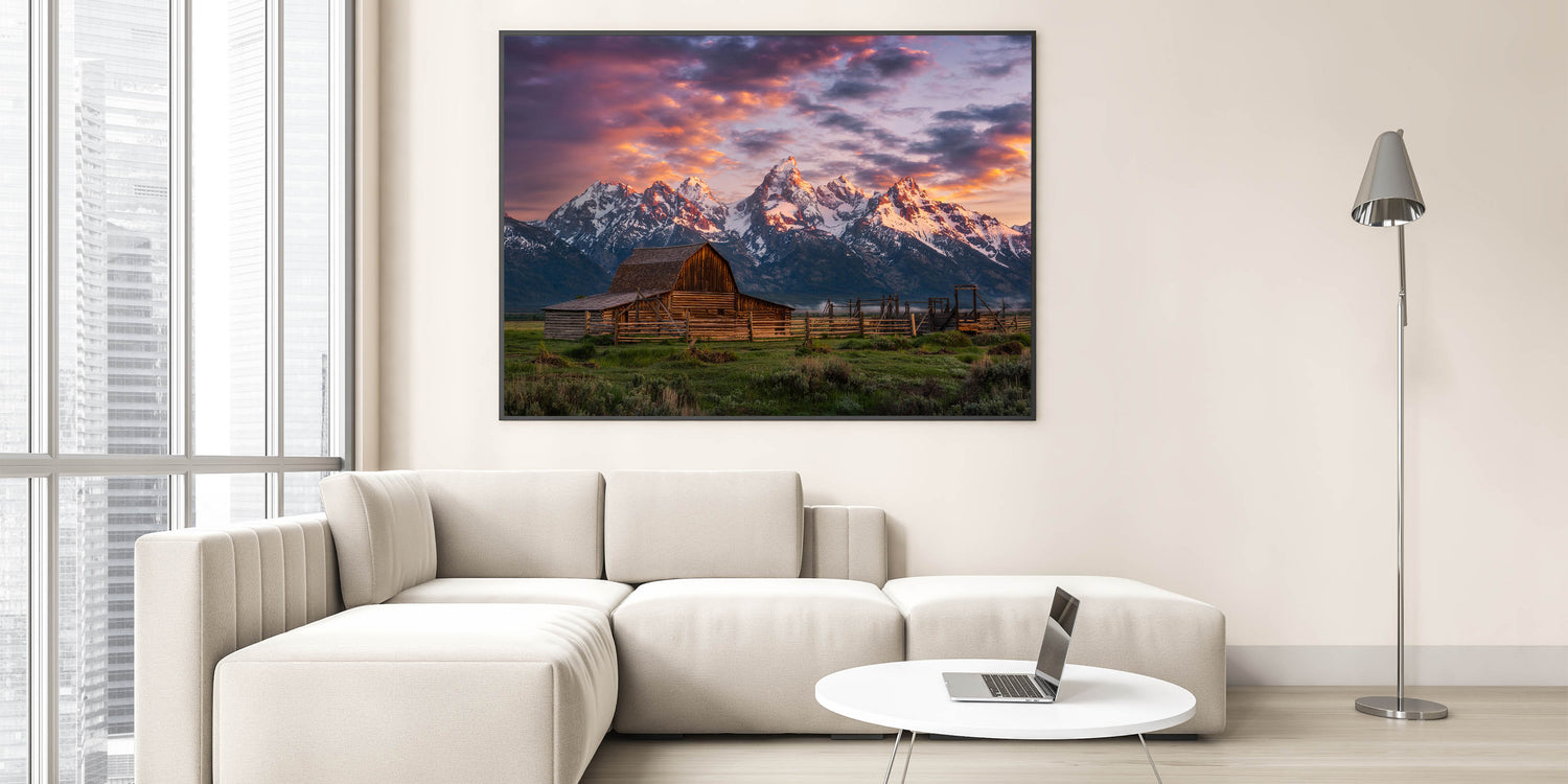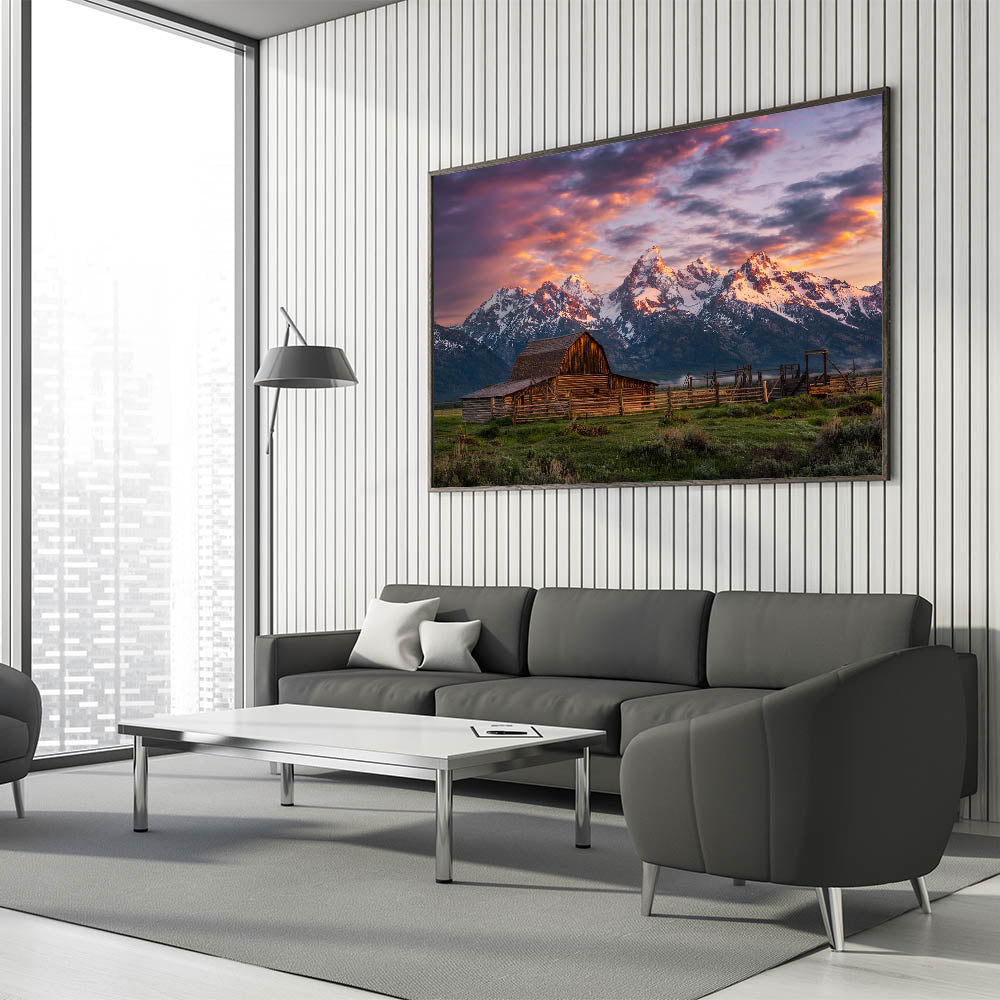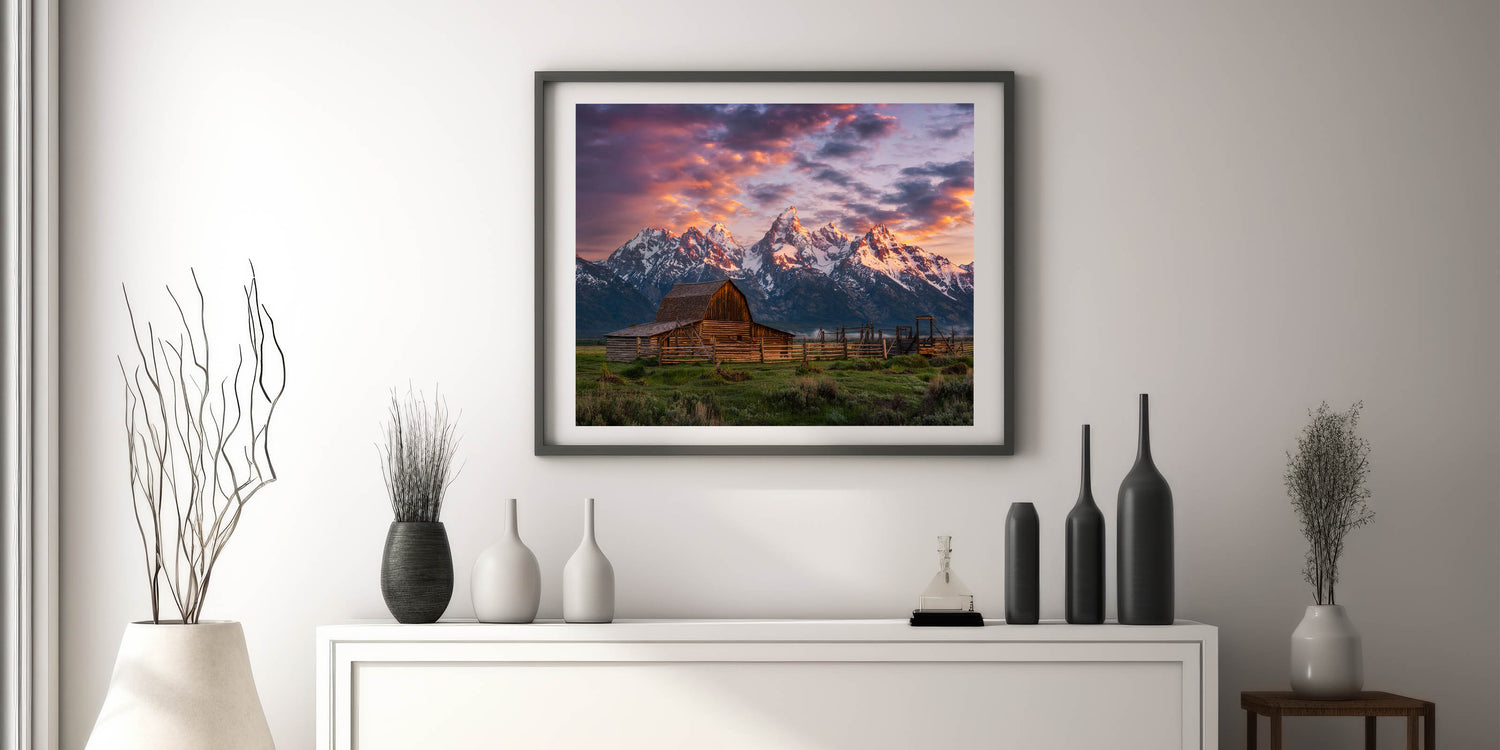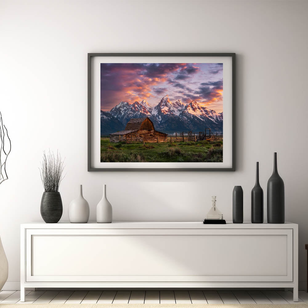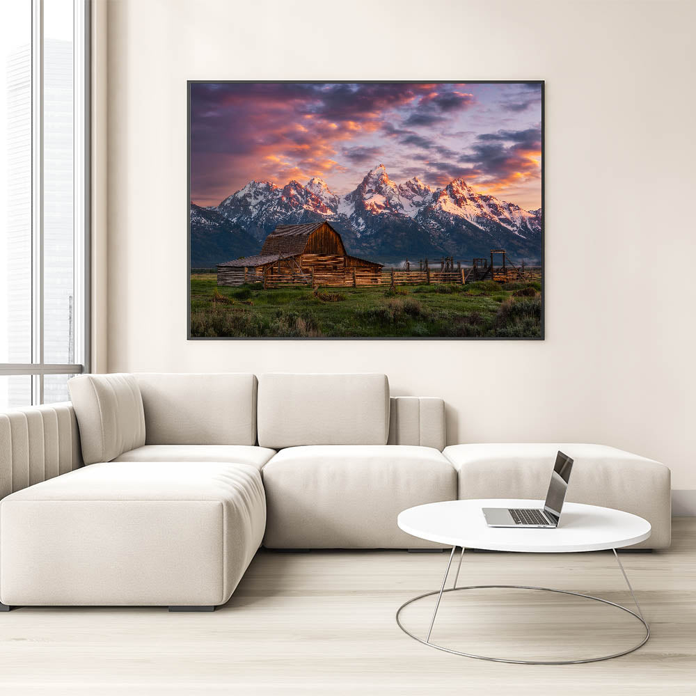 Add a touch of rustic charm and natural beauty to your space with this Grand Teton framed art. Featuring a wooden barn set against the stunning backdrop of the Grand Teton Range, this artwork captures the mountains glowing under a colorful sunset. The vibrant sky, snow-capped peaks, and lush green landscape combine to create a scene that exudes tranquility and timeless beauty.
