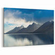 Experience the tranquil beauty of the Teton Range with this stunning Grand Teton scenic print. The image captures the essence of stillness as mist clings to the majestic mountain ridges while they tower above a serene, reflective lake. The calm waters mirror the distant peaks, adding to the overall sense of peace and solitude. This artwork is perfect for anyone who appreciates nature's quiet moments and the grandeur of Wyoming's iconic landscapes.