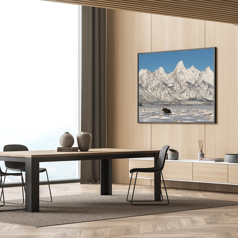 Enhance your living space with this unique Grand Teton photography art featuring a moose in its natural habitat. This piece brings the majesty of winter and wildlife into your home, creating a serene and timeless atmosphere.